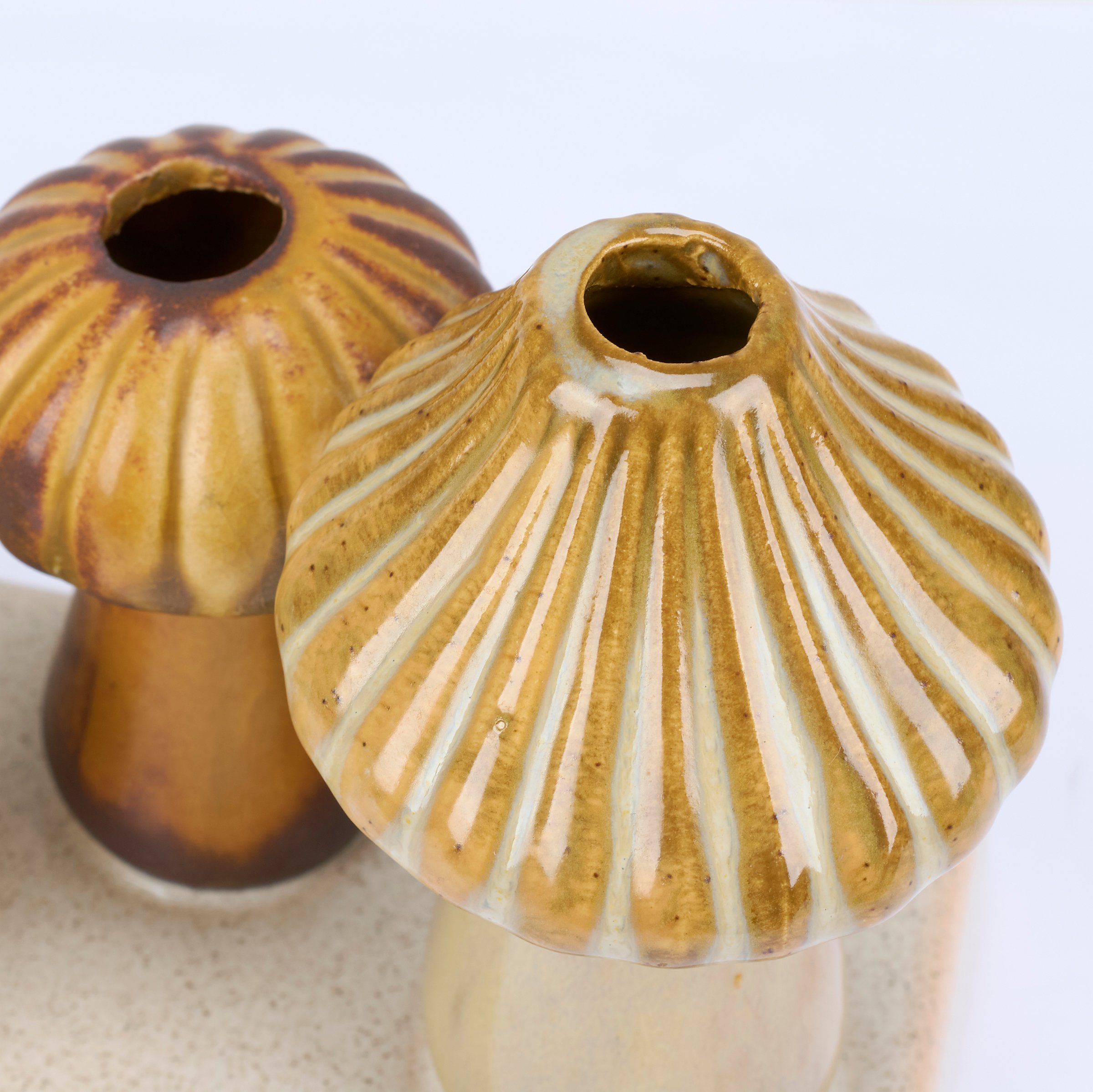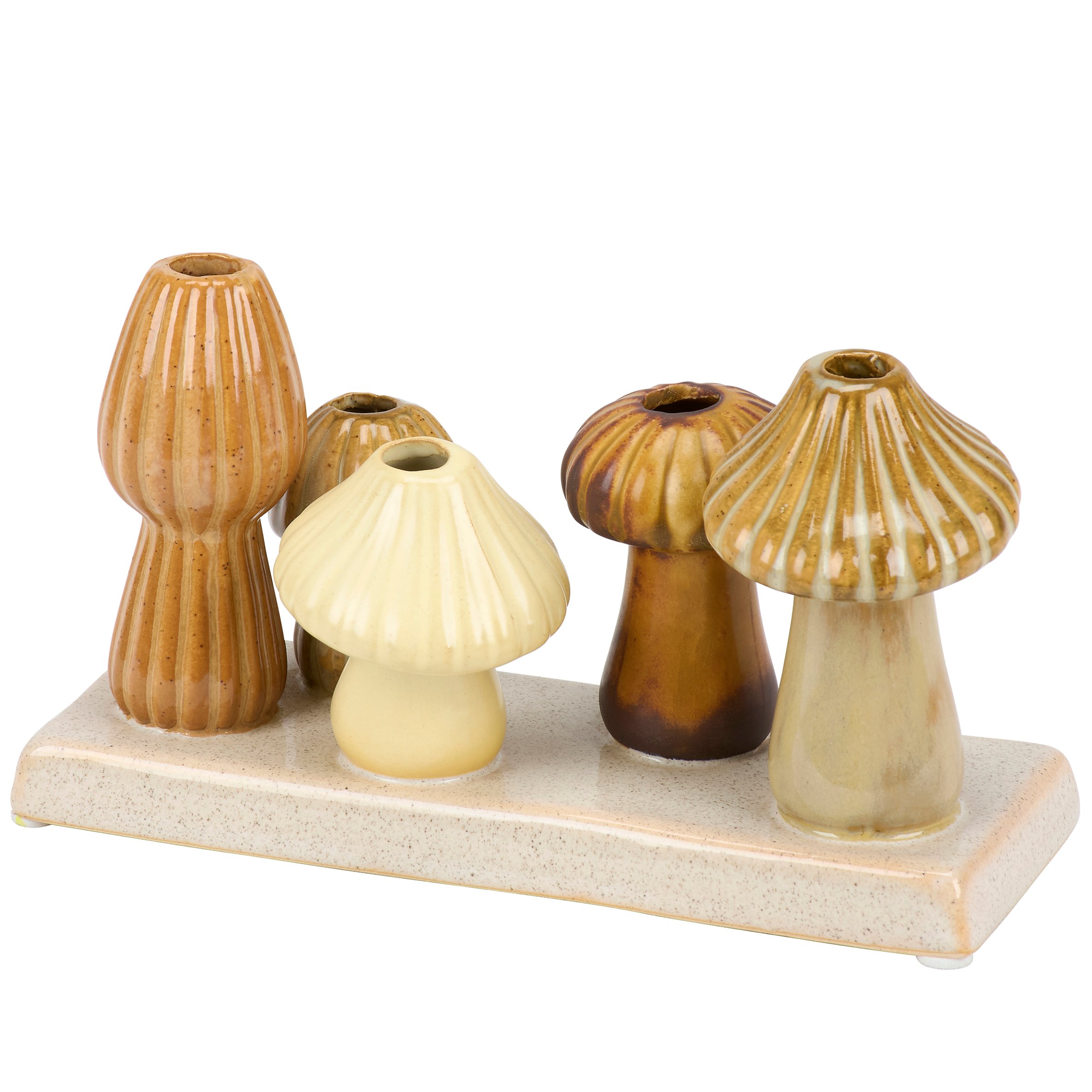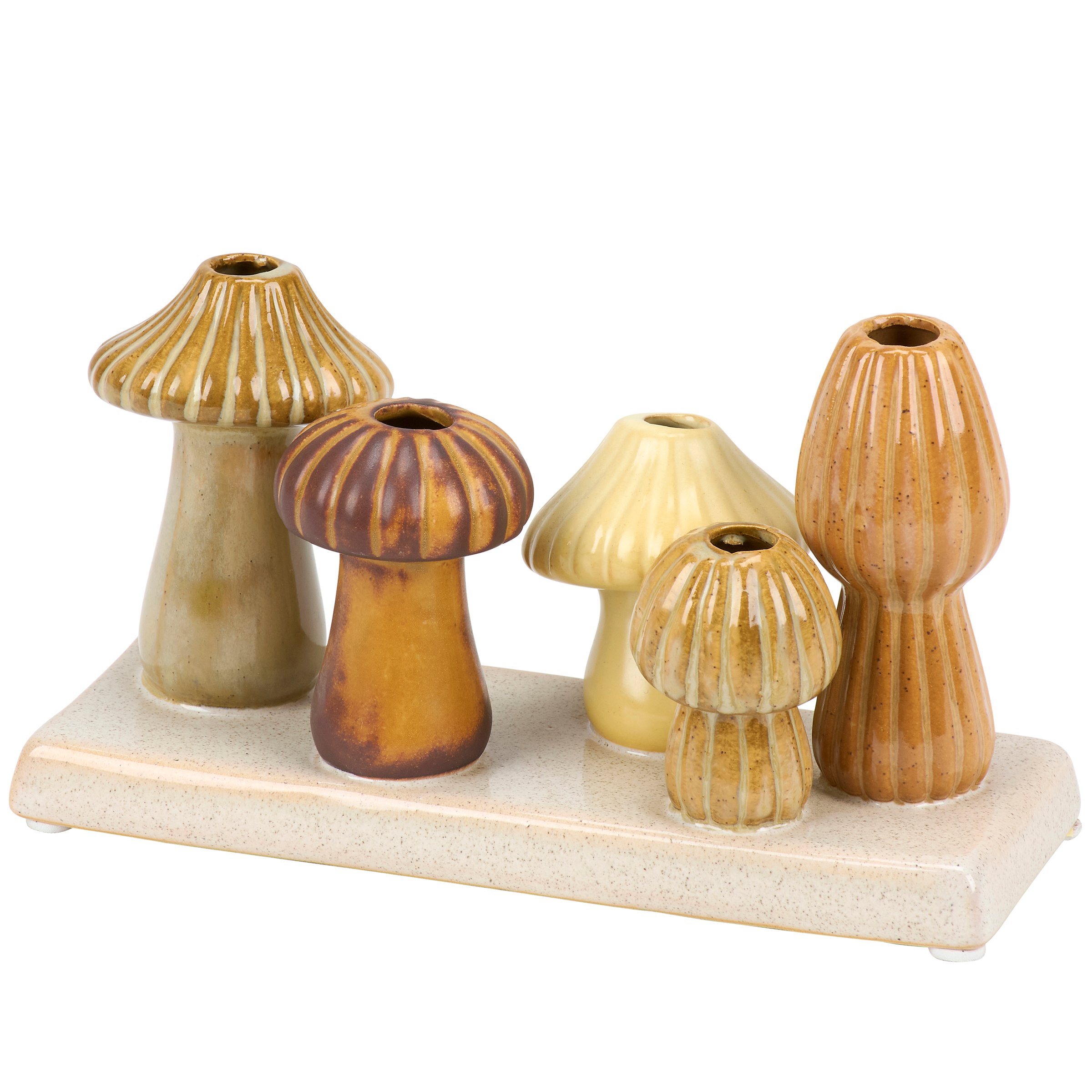 A ceramic vase from our Cottagecore Collection displaying standing mushroom designs with sculpted details and various glaze finishes attached to a flat base. Our Mushroom bud vase features openings on the top of each mushroom perfect for holding single stems or small bouquets of flowers. Greenery pictured not included. A stylish mushroom themed home accent with a variety of seasonal display options.