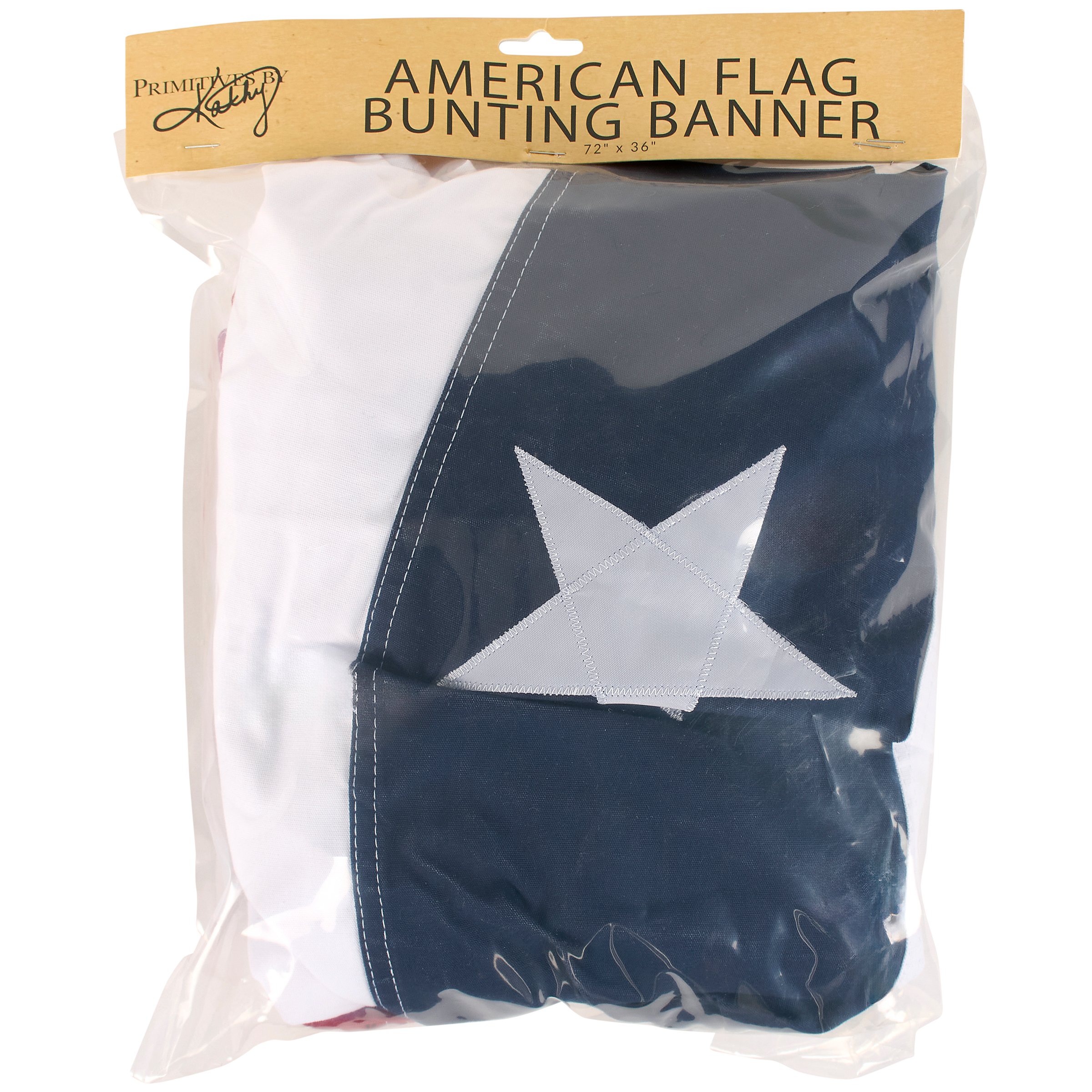 Cotton bunting from our Patriotic Collection displaying a rustic American flag inspired design. Rustic American flag bunting features a 72 inch length for a patriotic statement piece indoor or outdoor. Our American Flag bunting is easy to display using the metal grommets along the top to hang tight and secure. Patriotic bunting is packaged in a polybag with header card and hole for easy rack display. A patriotic home accent perfect for seasonal or everyday display.