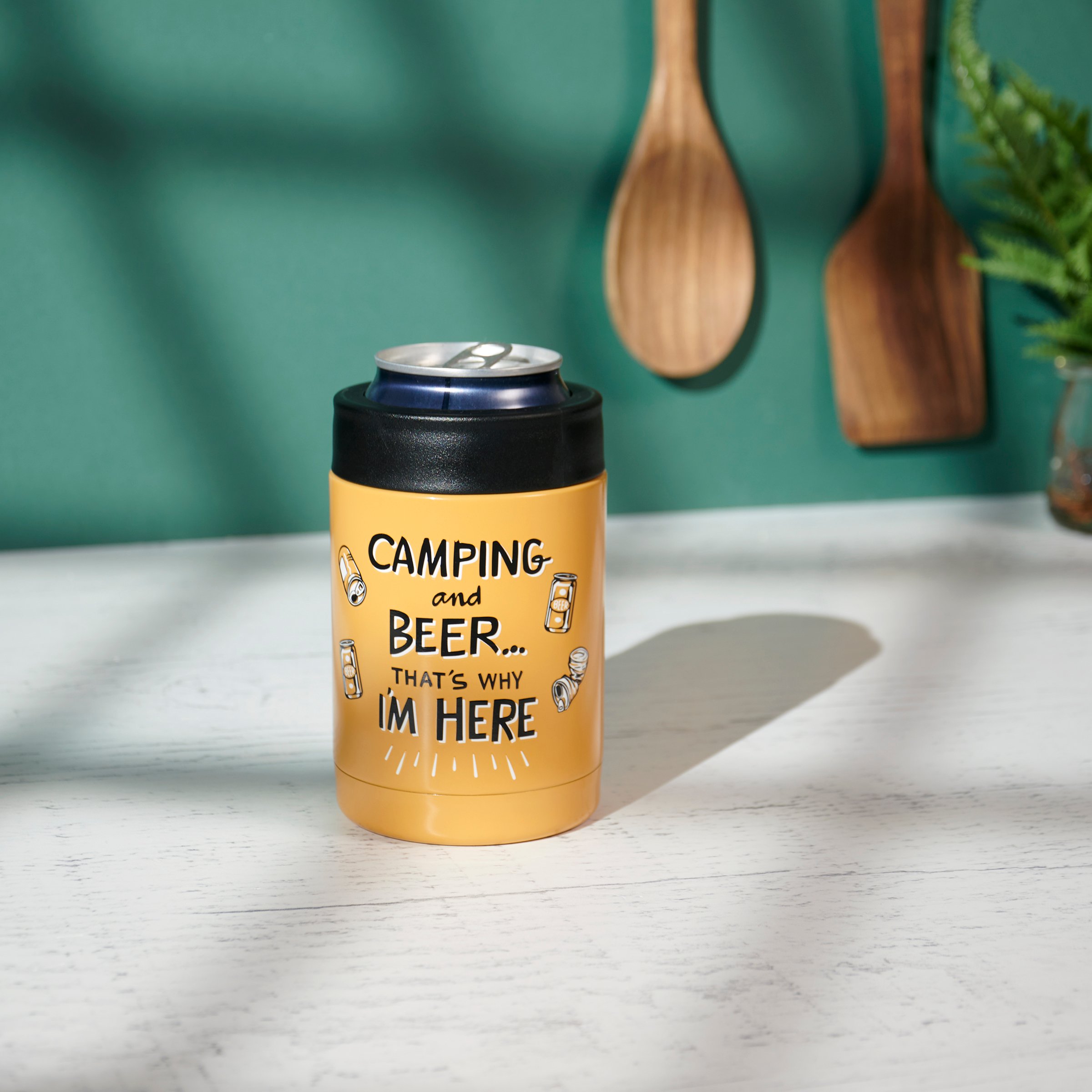 Perfect for warmer weather, this insulated can cooler from our Lake & Cabin Collection displays a fun hand illustrated scene of a campsite with beer can designs around a camping-themed sentiment that reads "Camping And Beer... That's Why I'm Here." Keep drinks cold up to 4 hours using the convenient screw-top lid to secure a 12 oz can inside the stainless steel cooler. Our Camping And Beer can cooler is hand-wash only. Do not microwave. A fun camping-themed accessory perfect for everyday use.