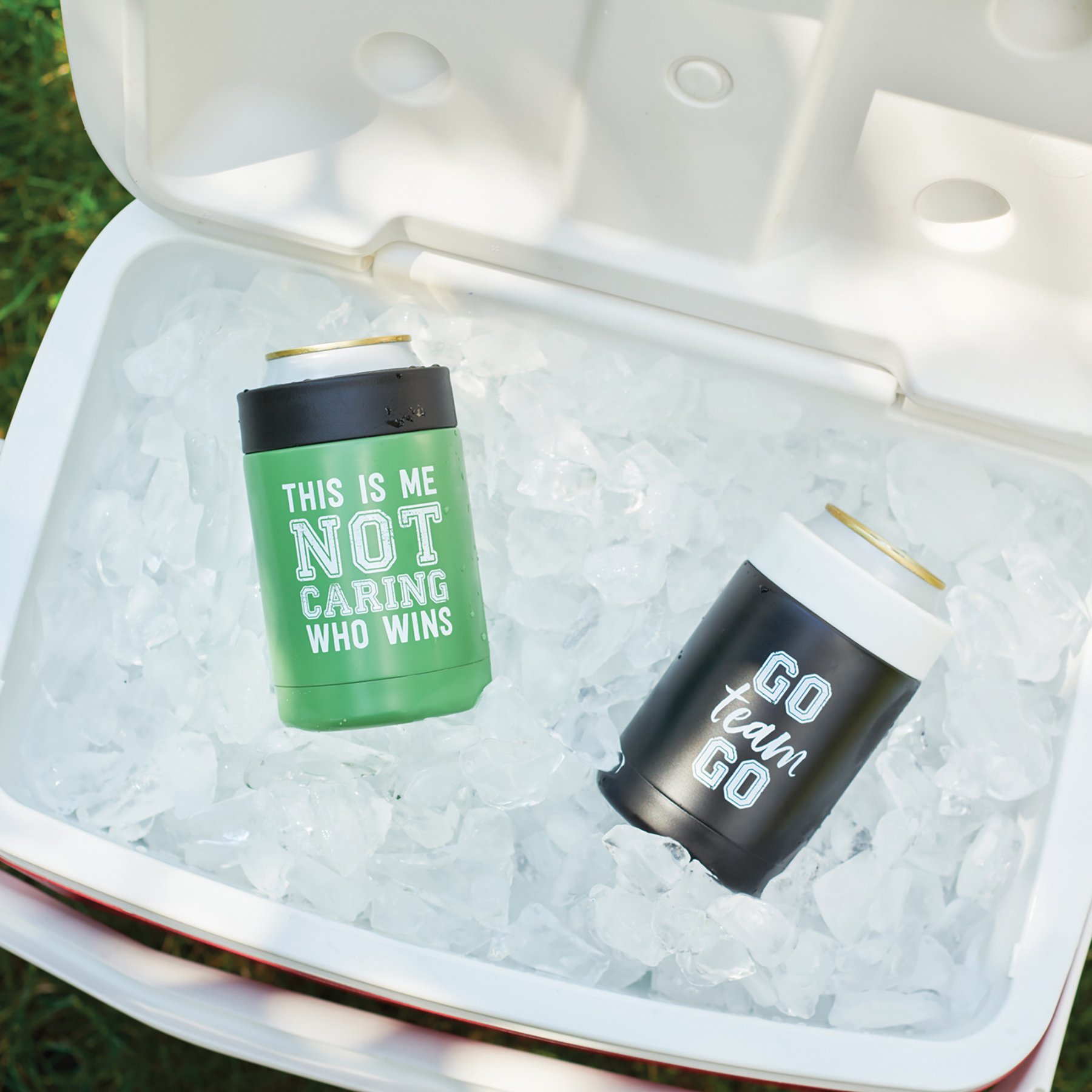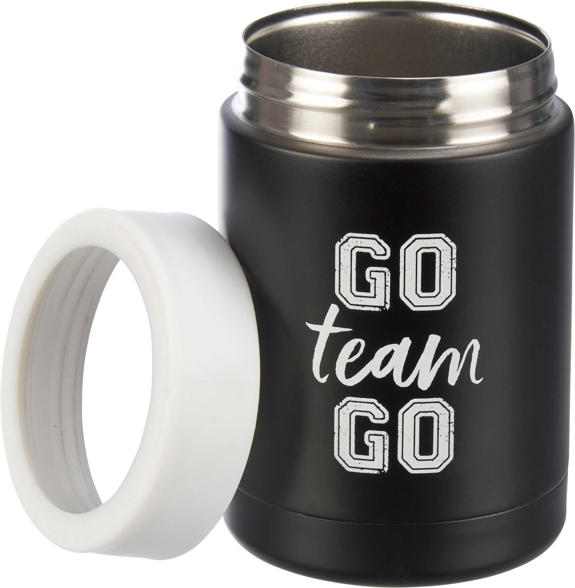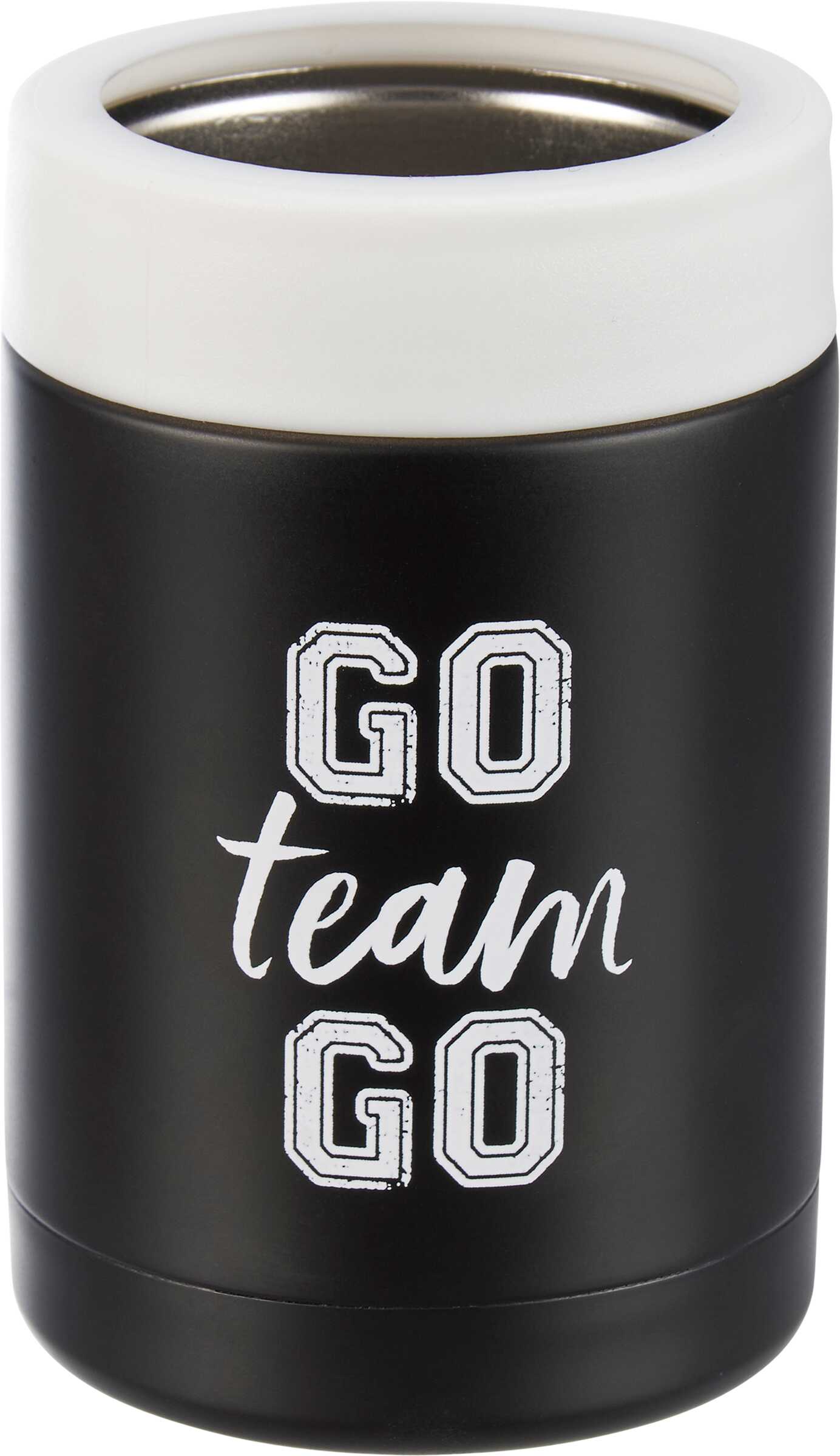 Perfect for warmer weather, this insulated can cooler from our Sports Collection displays a bold "Go Team Go" sentiment. Keep drinks cold up to 4 hours using the convenient screw-top lid to secure a 12 oz can inside the stainless steel cooler. Our Go Team Go can cooler is hand-wash only. Do not microwave.