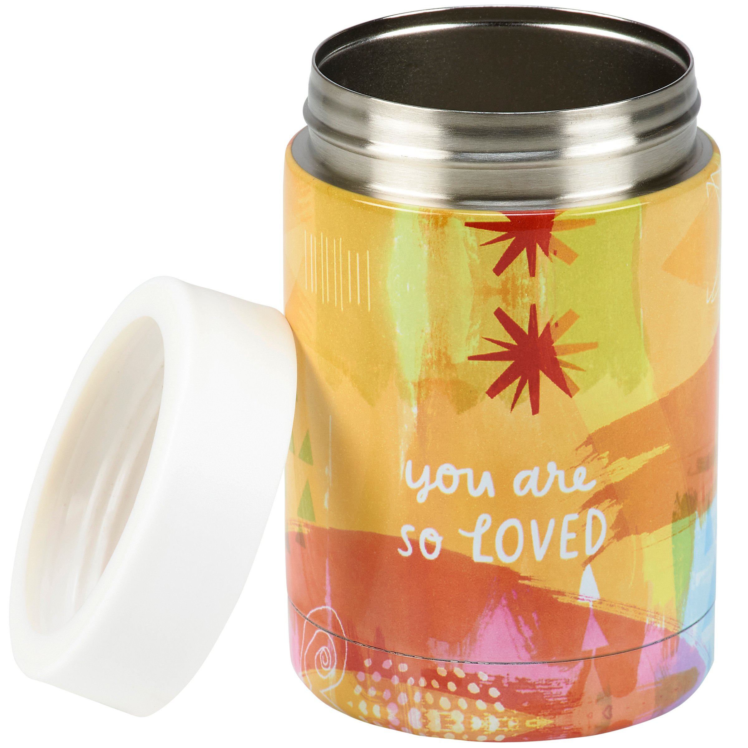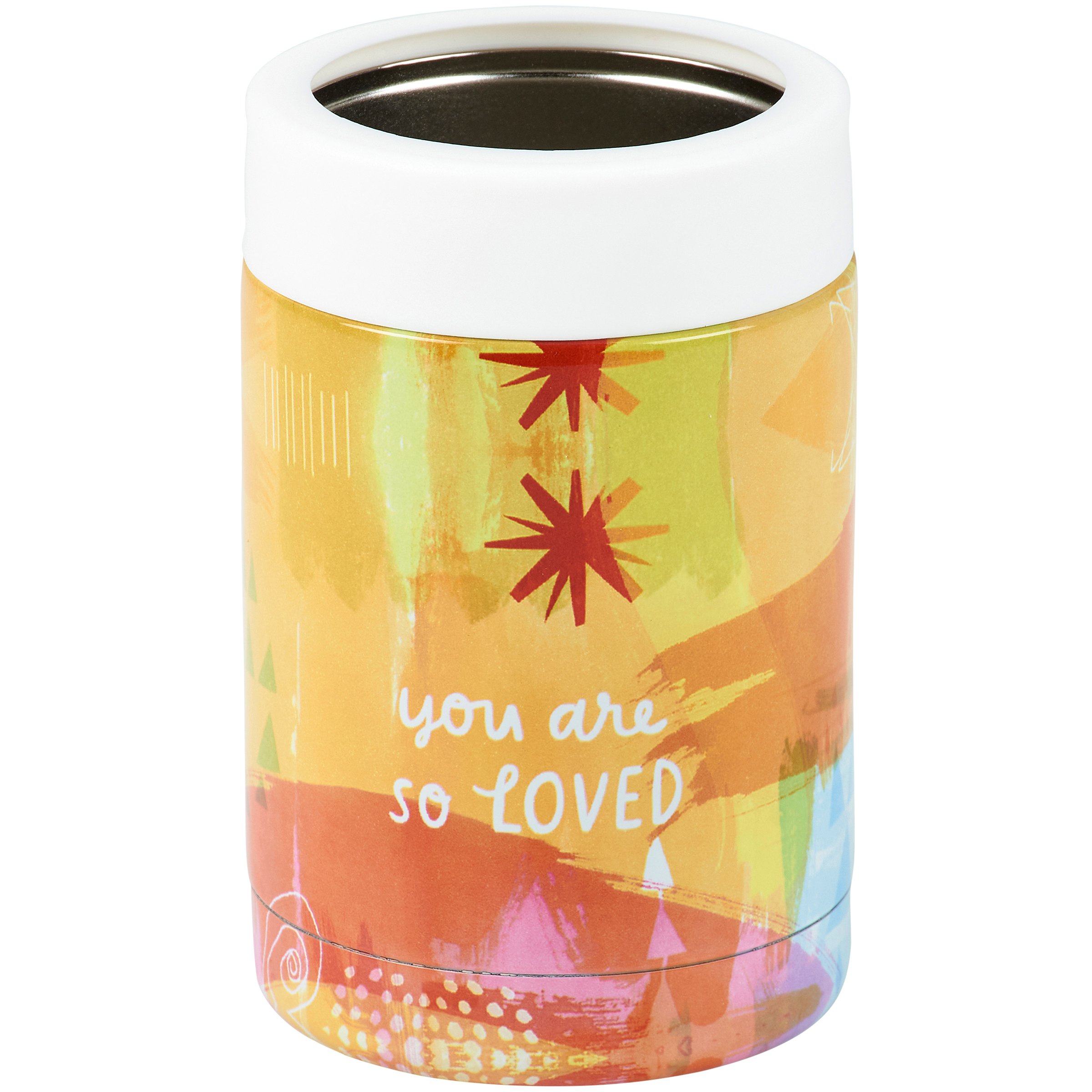 Perfect for warmer weather, this insulated can cooler from our Inspiration & Blooms Collection displays a wrap-around design of hand illustrated abstract art in a warm color palette with an uplifting "You Are So Loved" sentiment. Keep drinks cold up to 4 hours using the convenient screw-top lid to secure a 12 oz can inside the stainless steel cooler. Our So Loved can cooler is hand-wash only. Do not microwave.