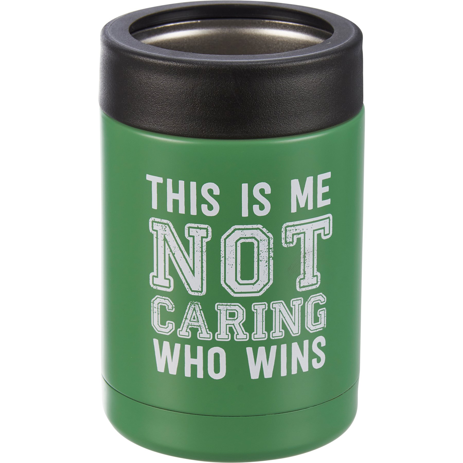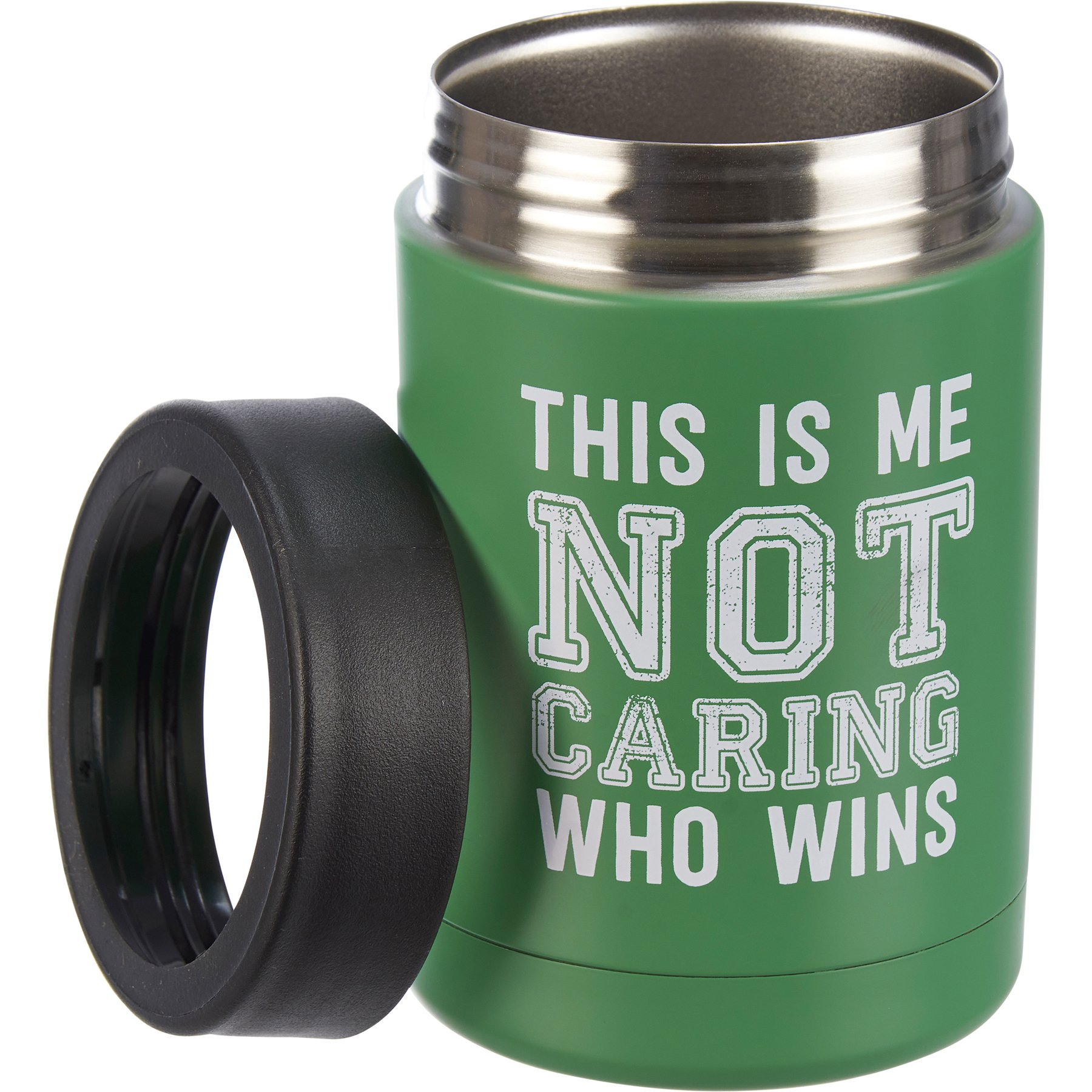 Perfect for warmer weather, this insulated can cooler from our Sports Collection displays a humorous "This Is Me Not Caring Who Wins" sentiment on grass green background. Keep drinks cold up to 4 hours using the convenient screw-top lid to secure a 12 oz can inside the stainless steel cooler. Our This Is Me Not Caring can cooler is hand-wash only. Do not microwave.