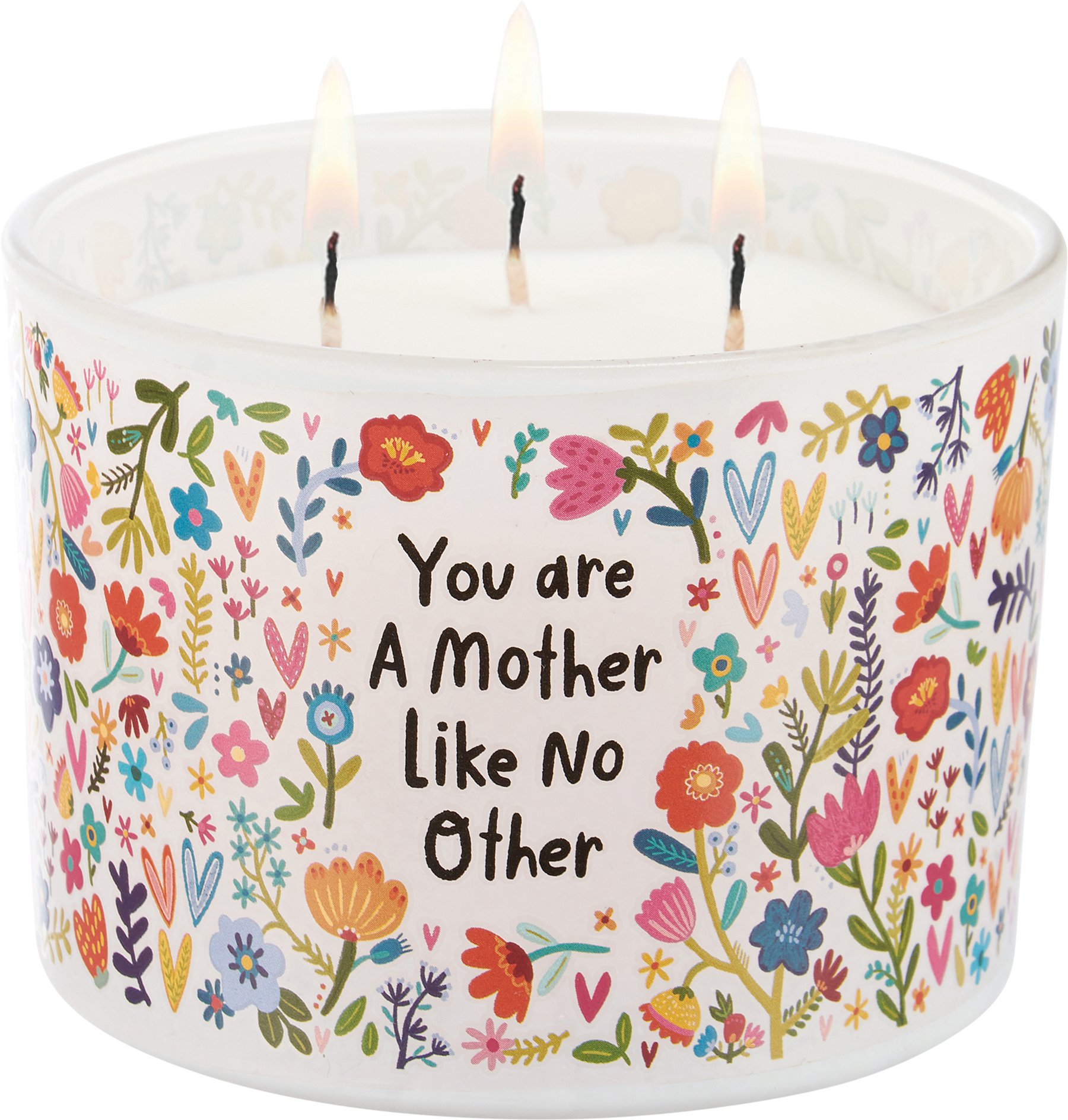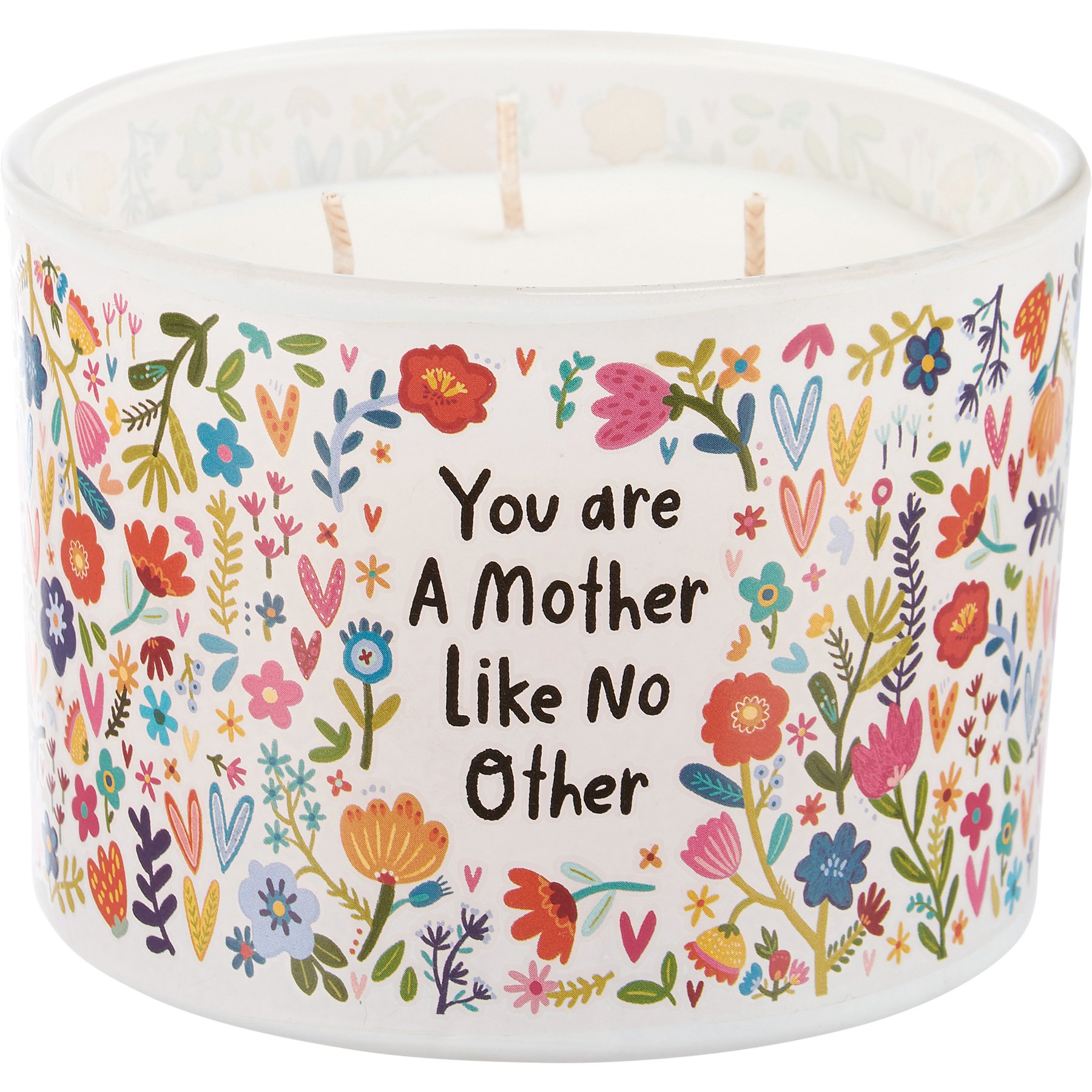 A jar candle from our Mother's Day Collection displaying a vibrant full wrap-around design of flowers on frosted white glass with heart-warming "You Are A Mother Like No Other" sentiment. Candle features soy-based wax and 3 fabric wicks with 30 hours of burn time activating a calming Vanilla scent. Our A Mother Like No Other jar candle includes a dust cover and plastic lid for protection and polished appearance.