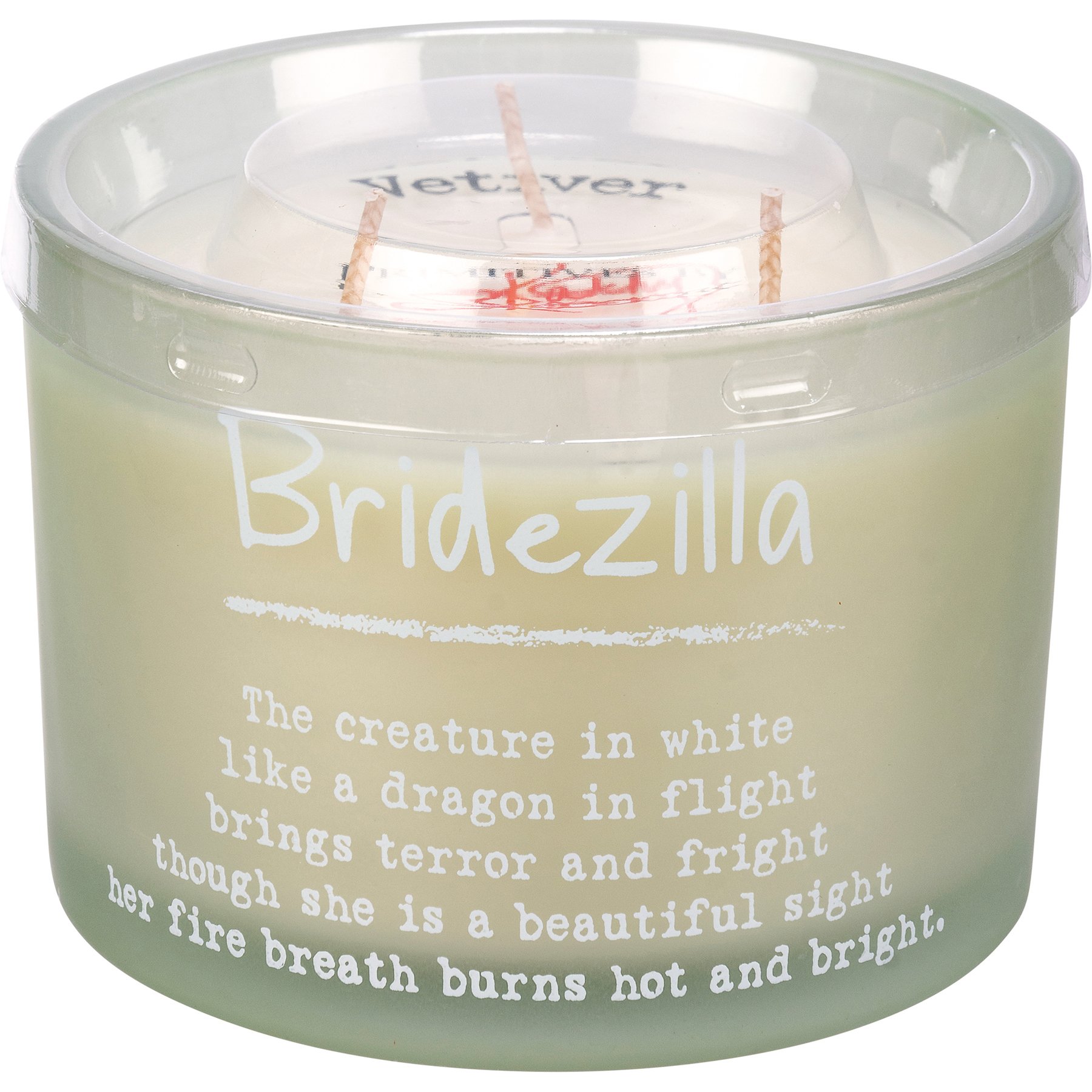 A green-colored frosted glass vessel holds this soy-based wax candle from our Wedding Collection featuring a refreshing vetiver scent with "Bridezilla The Creature In White Like A Dragon In Flight Brings Terror And Flight Though She Is A Beautiful Sight Her Fire Breath Burns Hot And Bright." sentiment. This 14 oz. candle makes a perfect gift. Our Bridezilla candle contains three fabric wicks for a total of 30 hours of burn time. Includes a plastic wax cover for protection and a polished look.