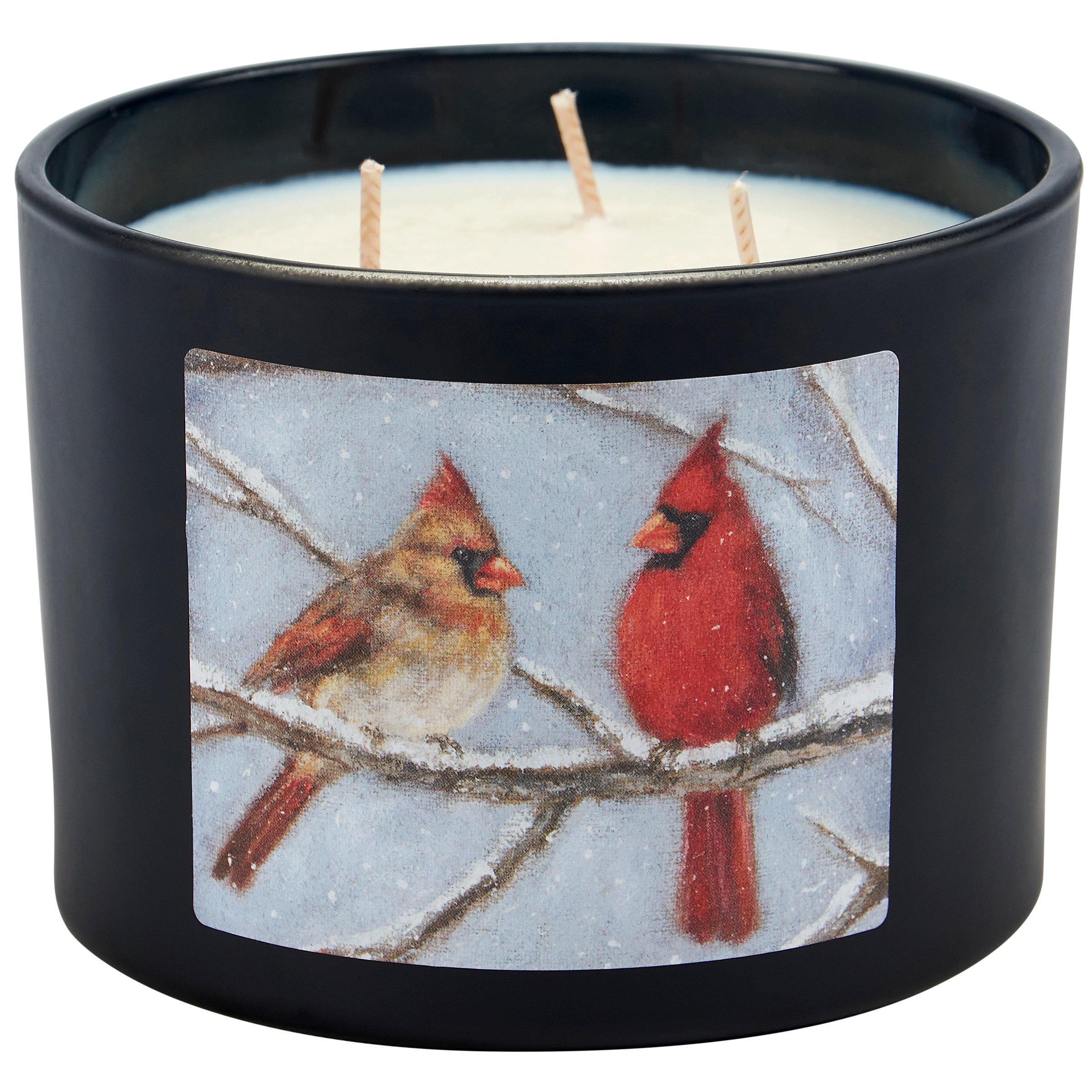 A candle from our Christmas Collection displaying a double-sided design of a perched cardinal couple on matte black glass. Cardinals design is replicated from original artwork painted onto burlap canvas, giving the art a unique depth and texture. Seasonal candle features soy-based wax and 3 fabric wicks with 30 hours of burn time activating a calming Spruce scent. Our Cardinal Couple candle includes a dust cover and plastic lid for protection and enhanced appearance on store displays. A cardinal-themed Christmas gift perfect for a seasonal home accent.