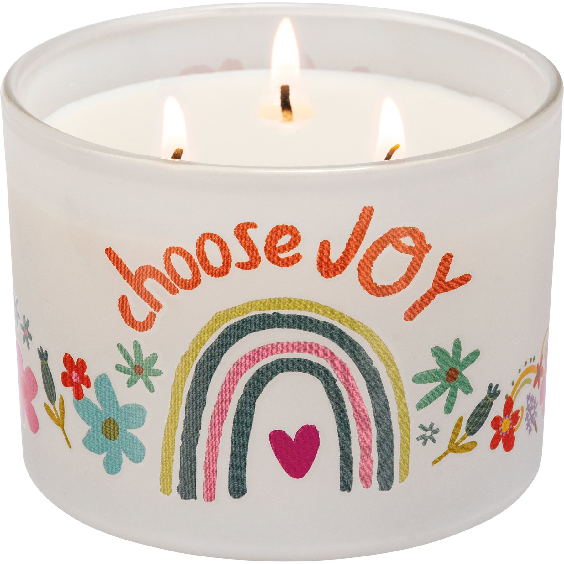 A frosted glass vessel holds this soy-based wax candle featuring a refreshing vetiver scent, an inspirational "Choose Joy" sentiment, and colorful rainbow and floral designs. This 14 oz. candle makes a perfect gift. Our Choose Joy jar candle contains three fabric wicks for a total of 30 hours of burn time. Includes a plastic wax cover for protection and a polished look.