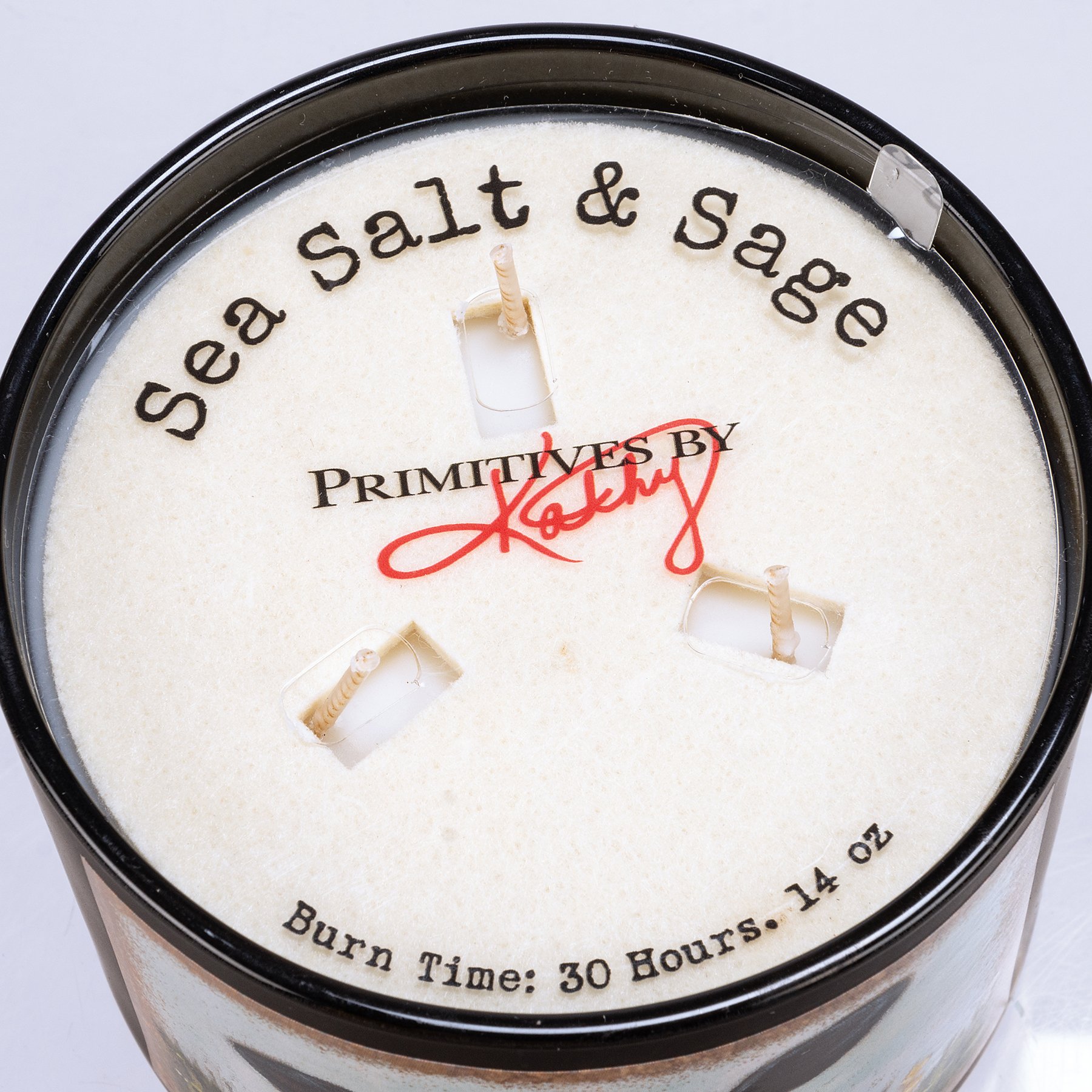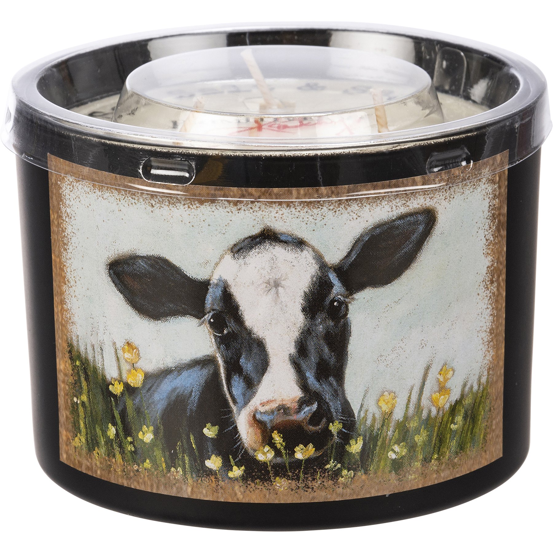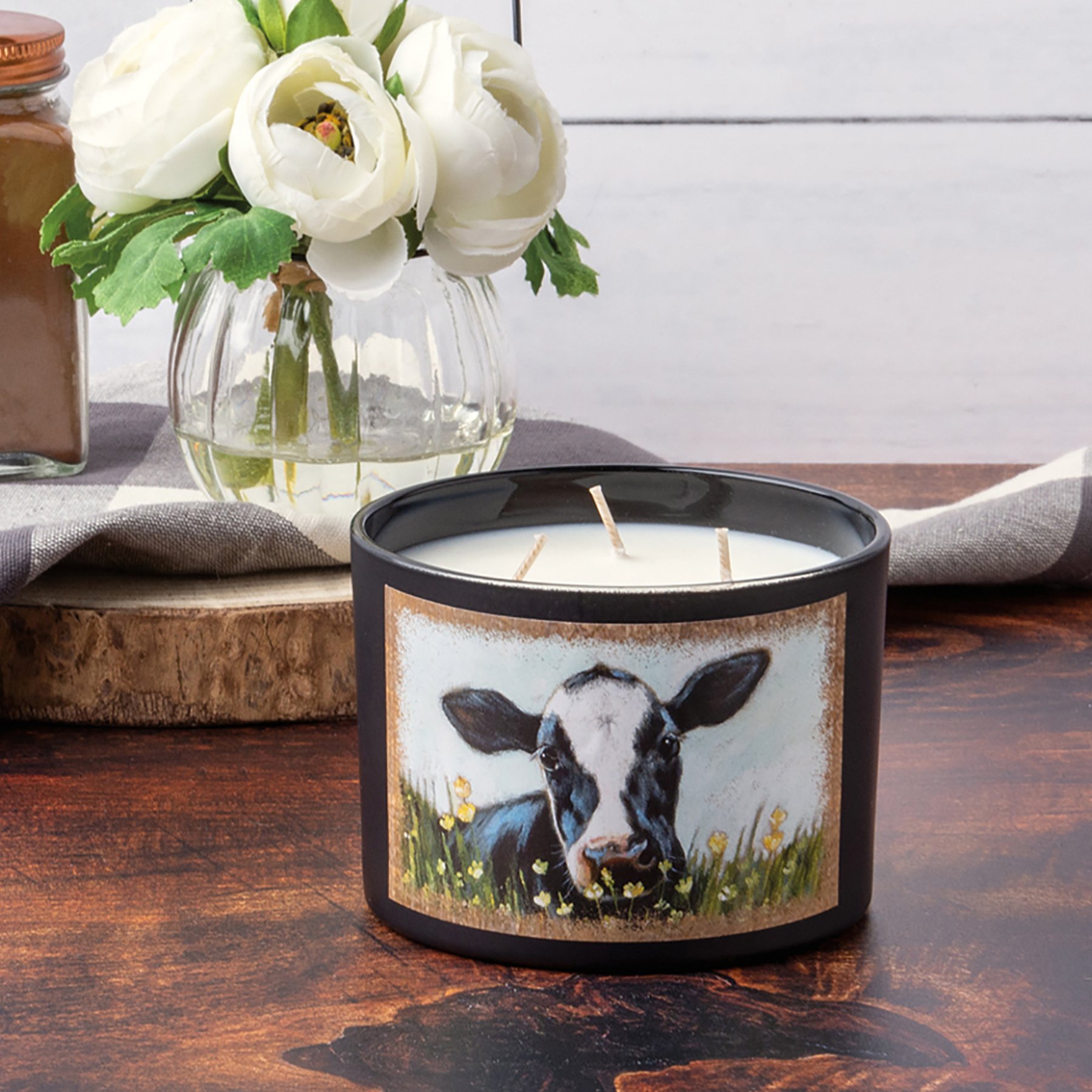 A matte black glass vessel from our Farmhouse Collection holds this soy-based wax candle which features a refreshing sea salt & sage scent and double-sided design of a cow in a field of buttercups. Design is replicated from original artwork painted onto burlap canvas, giving the art a unique depth and texture. Our Cow in Buttercups candle contains three cotton wicks for a total of 30 hours of burn time. Includes a plastic wax cover for protection and a polished look.