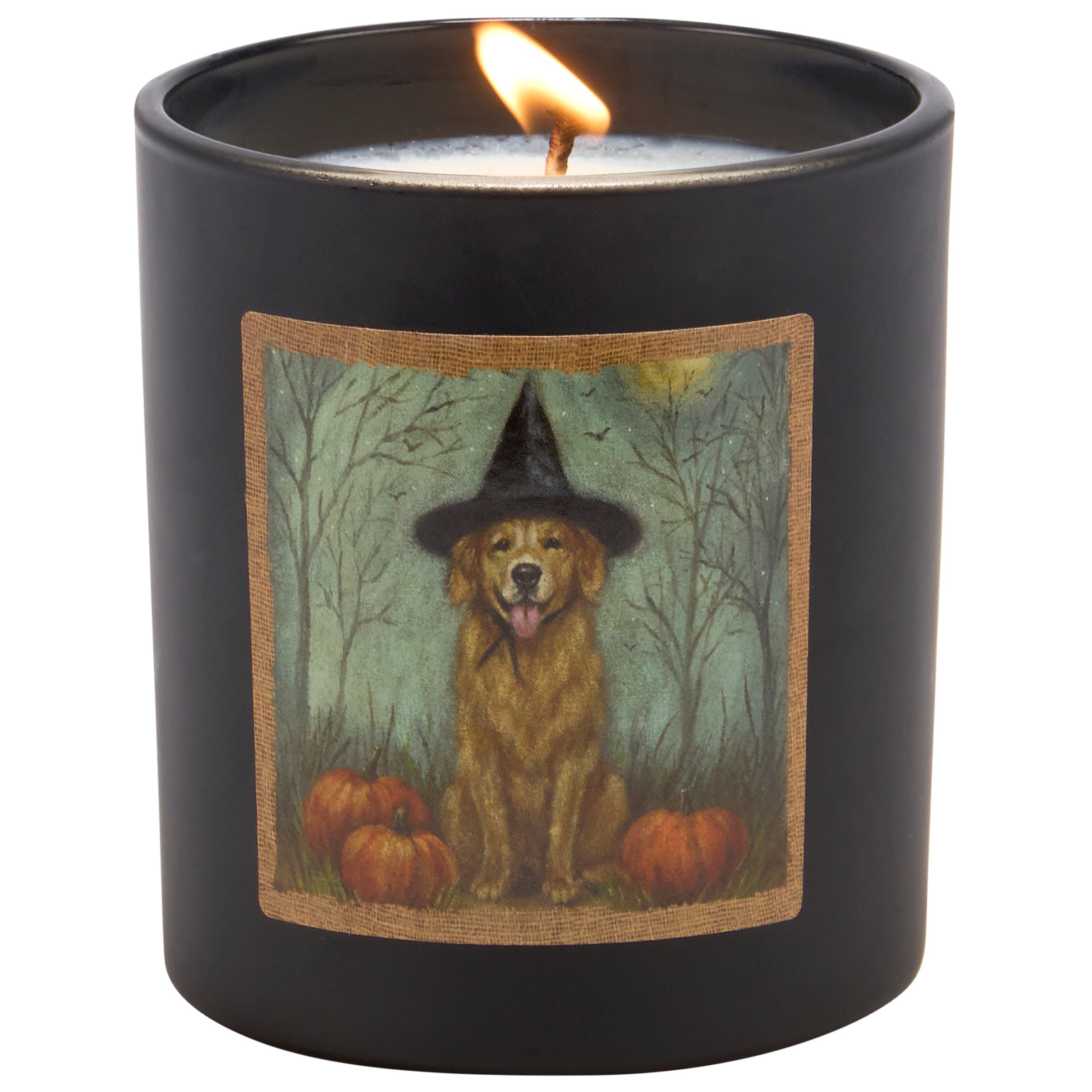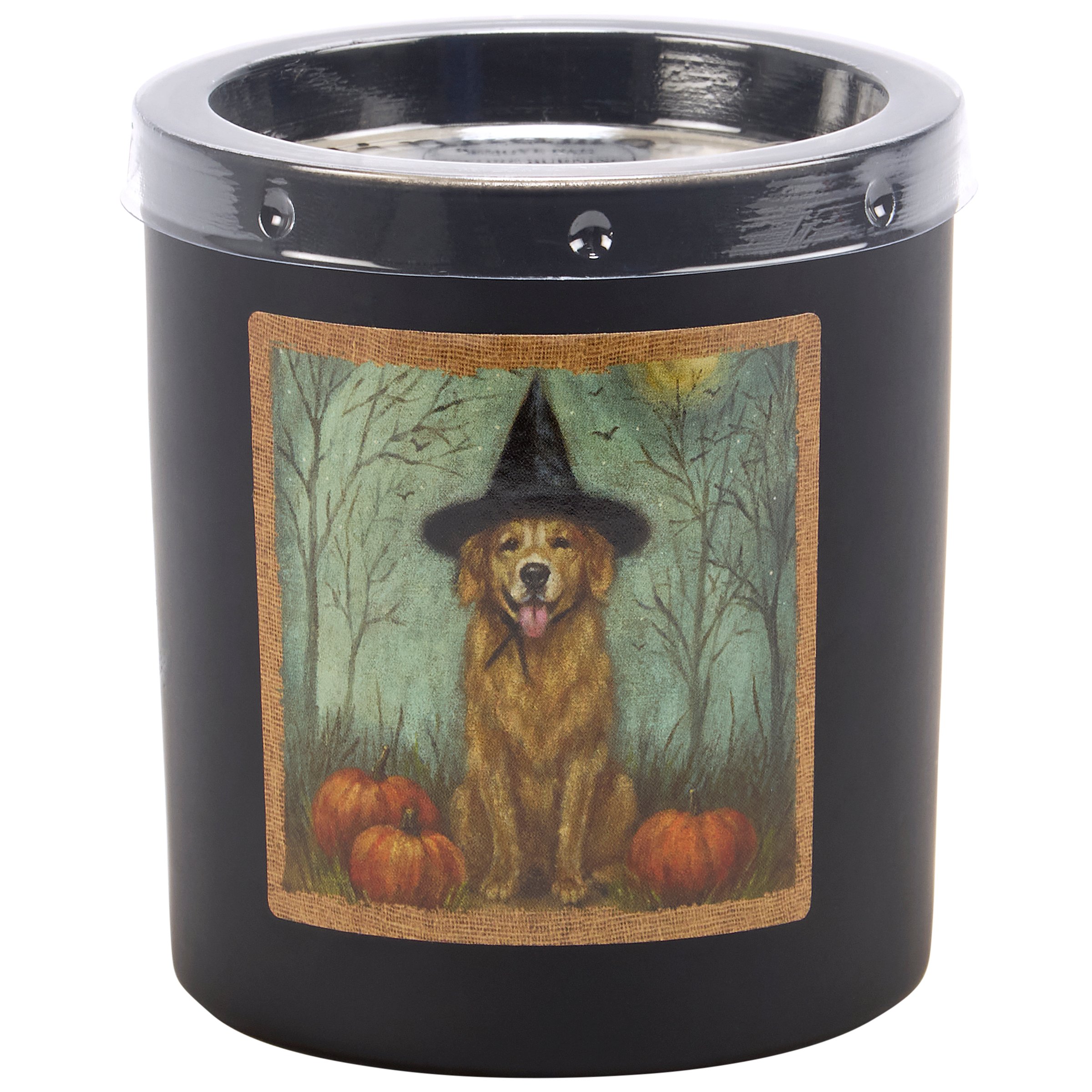 A candle from our Halloween Collection displaying a double-sided design of a dog dressed in a witch costume on matte black glass. Dog witch design is replicated from original artwork painted onto burlap canvas, giving the art a unique depth and texture. Seasonal candle features soy-based wax and a fabric wick with 35 hours of burn time activating a calming Cinnamon scent. Our Dog As A Witch candle includes a dust cover and plastic lid for protection and enhanced appearance on store displays. A pet-themed gift perfect for a seasonal home accent.