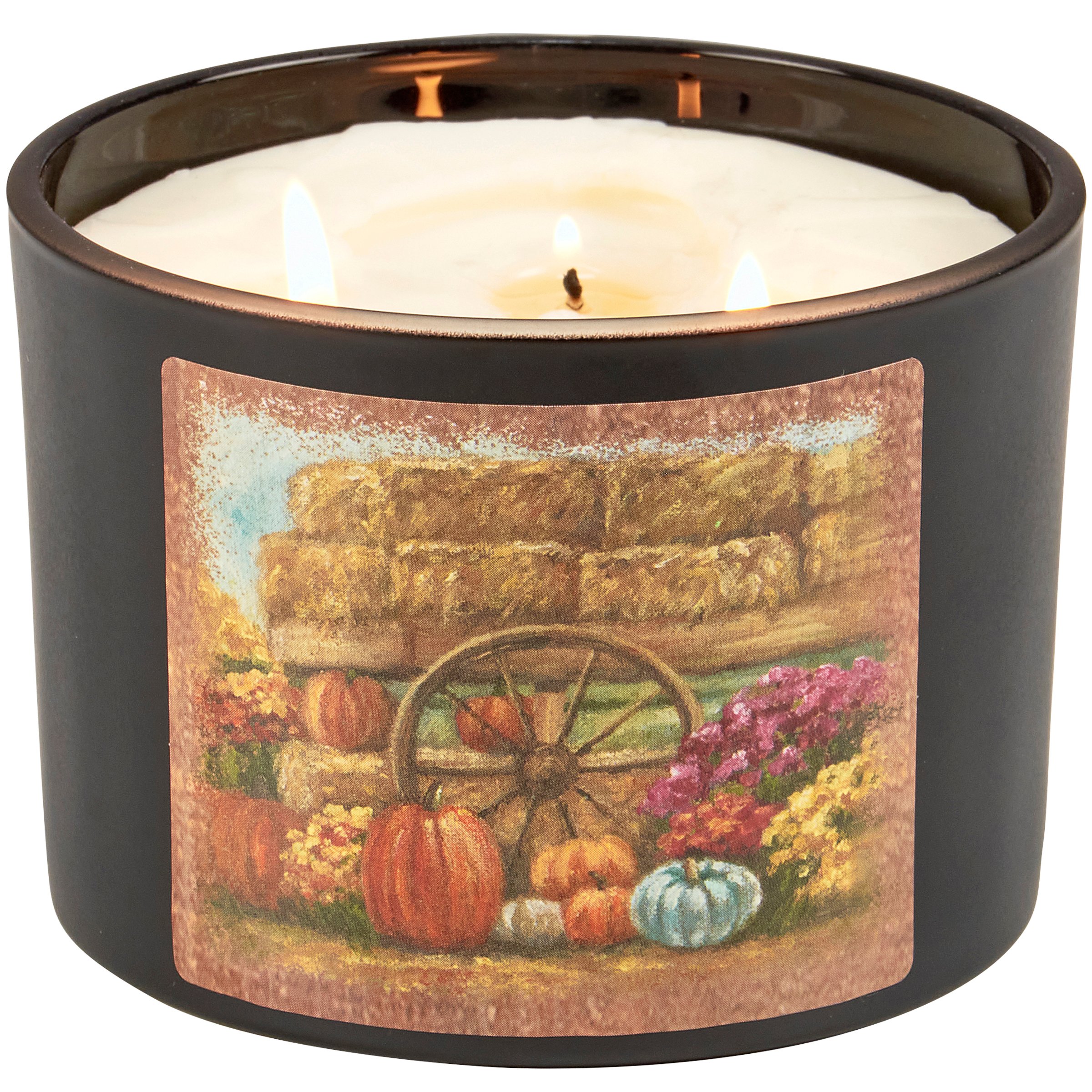 A jar candle from our Fall & Harvest Collection displaying a double-sided design of a farm scene with fall foliage and pumpkins on frosted black glass. Design is replicated from original artwork painted onto burlap canvas, giving the art a unique depth and texture. Seasonal candle features soy-based wax and 3 fabric wicks with 30 hours of burn time activating a calming Pumpkin Spice scent. Our Fall Farm jar candle includes a dust cover and plastic lid for protection and polished appearance. A fall-themed home accent that is great for gifting.