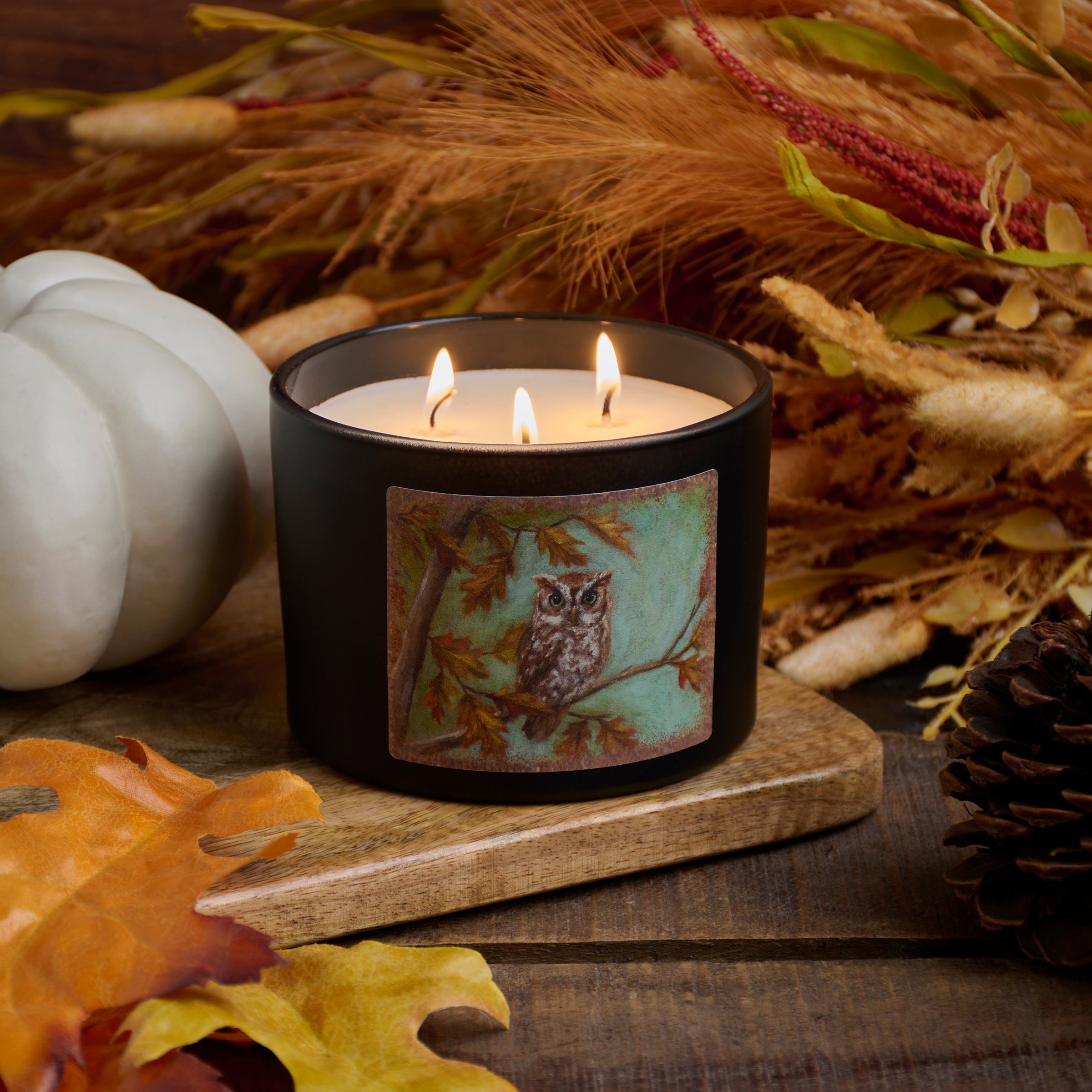 A candle from our Fall & Harvest Collection featuring a double-sided design on matte black glass displaying a charming fall scene of an owl on a branch with autumn leaves. Fall owl design is replicated from original artwork painted onto burlap canvas, giving the art a unique depth and texture. This fall candle features soy-based wax and 3 fabric wicks with 30 hours of burn time activating an earthy Vetiver scent. Our Fall Owl candle includes a dust cover and plastic lid for protection and enhanced appearance on store displays. A nature themed fall home accent that easily adds natural lighting and seasonal style to any home or work space.