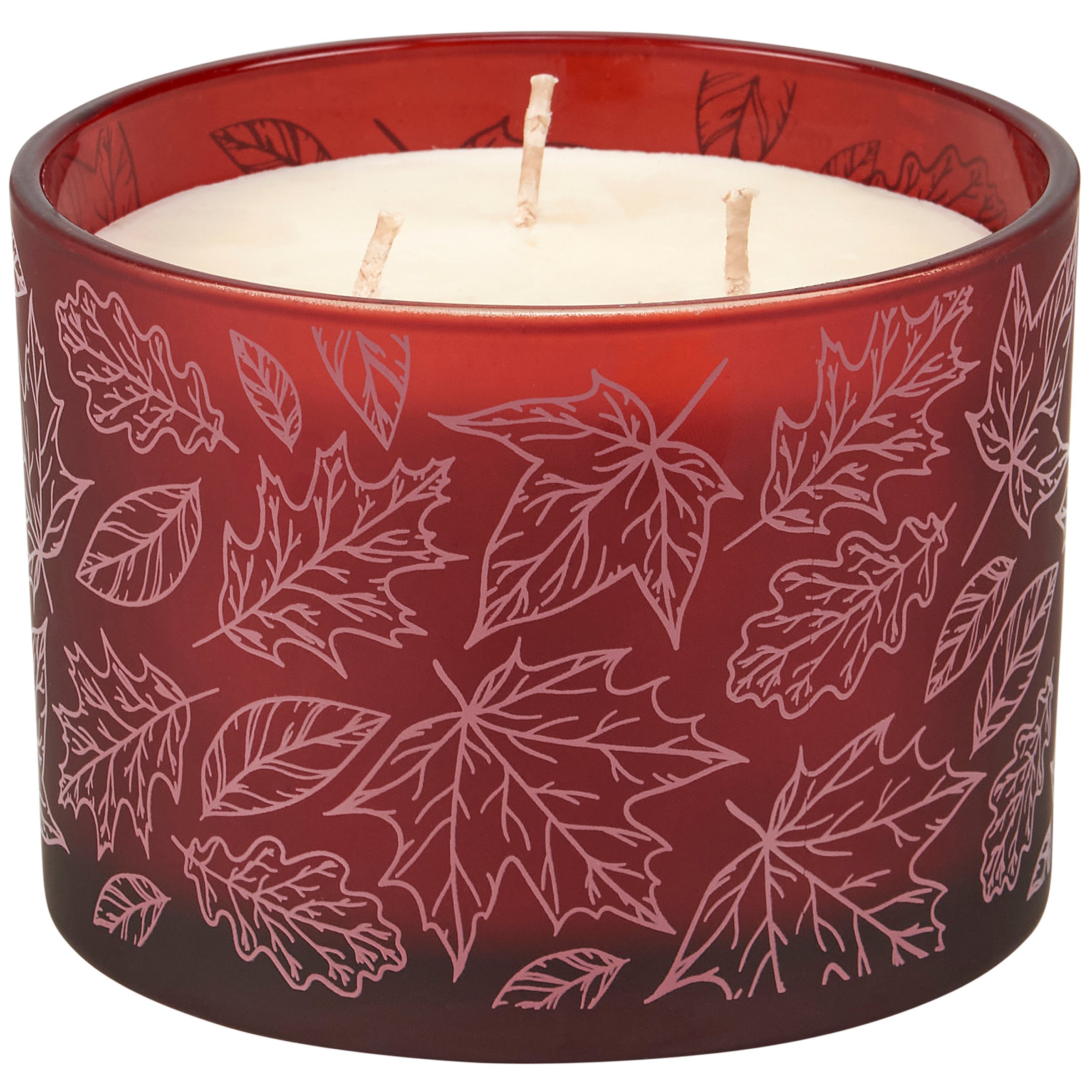 A jar candle from our Fall & Harvest Collection displaying a deep autumn red frosted glass background with hand illustrated designs of falling autumn leaves. Seasonal candle features soy-based wax and 3 fabric wicks with 30 hours of burn time activating a calming Autumn Leaves scent. Our Falling Leaves jar candle includes a dust cover and plastic lid for protection and polished appearance. A fall-themed home accent that is great for gifting.