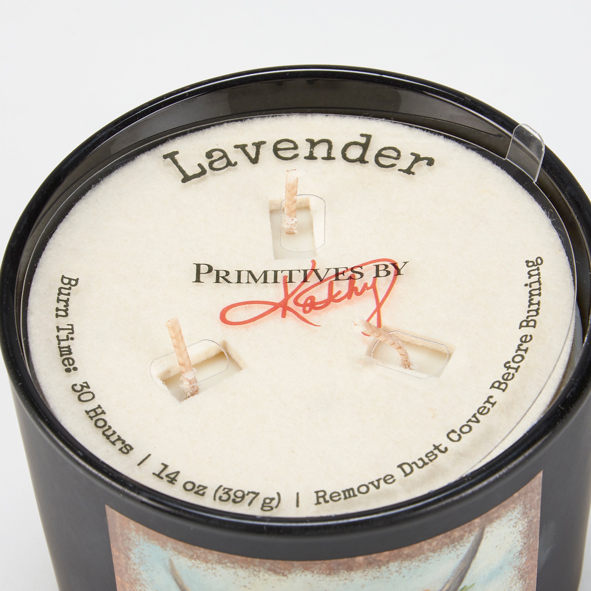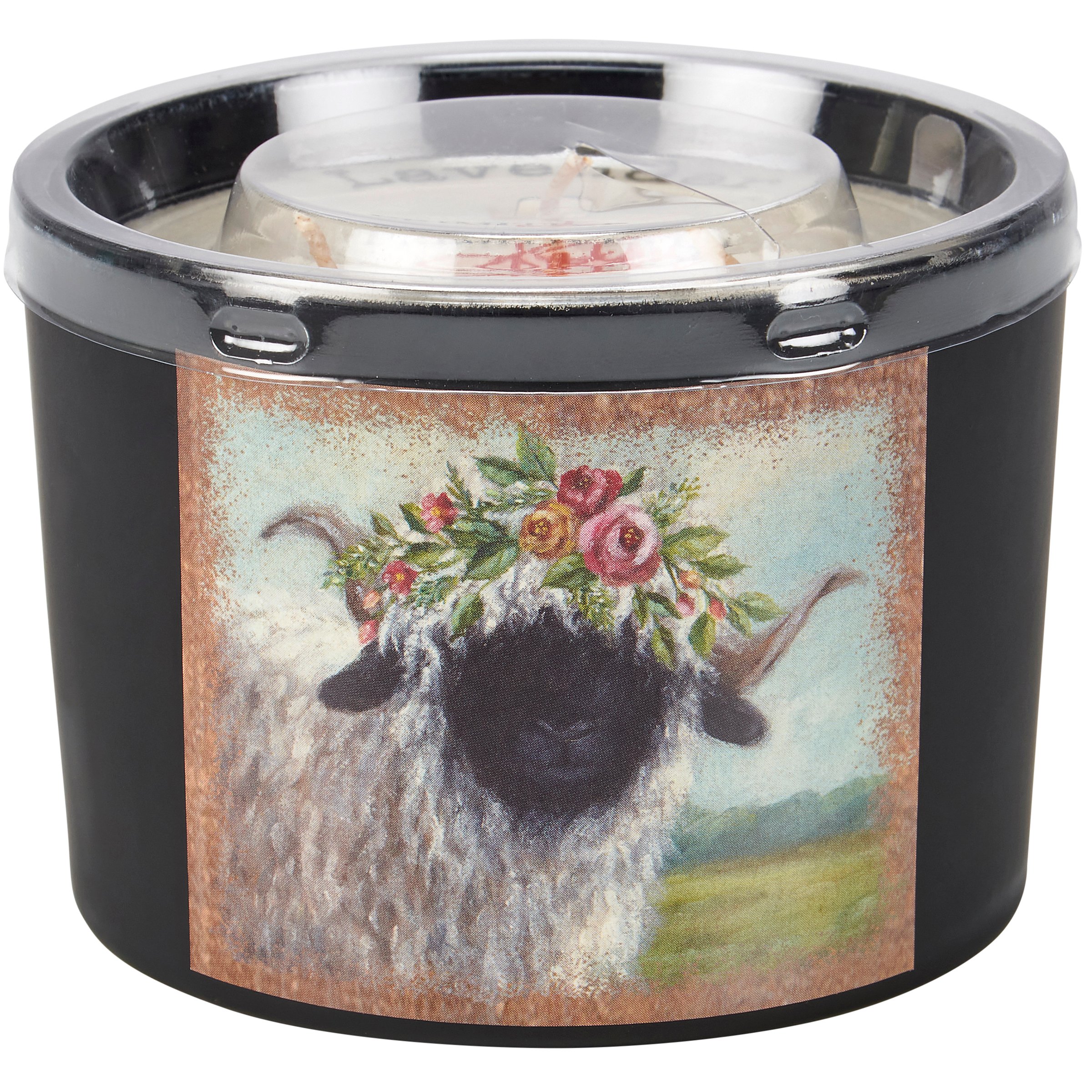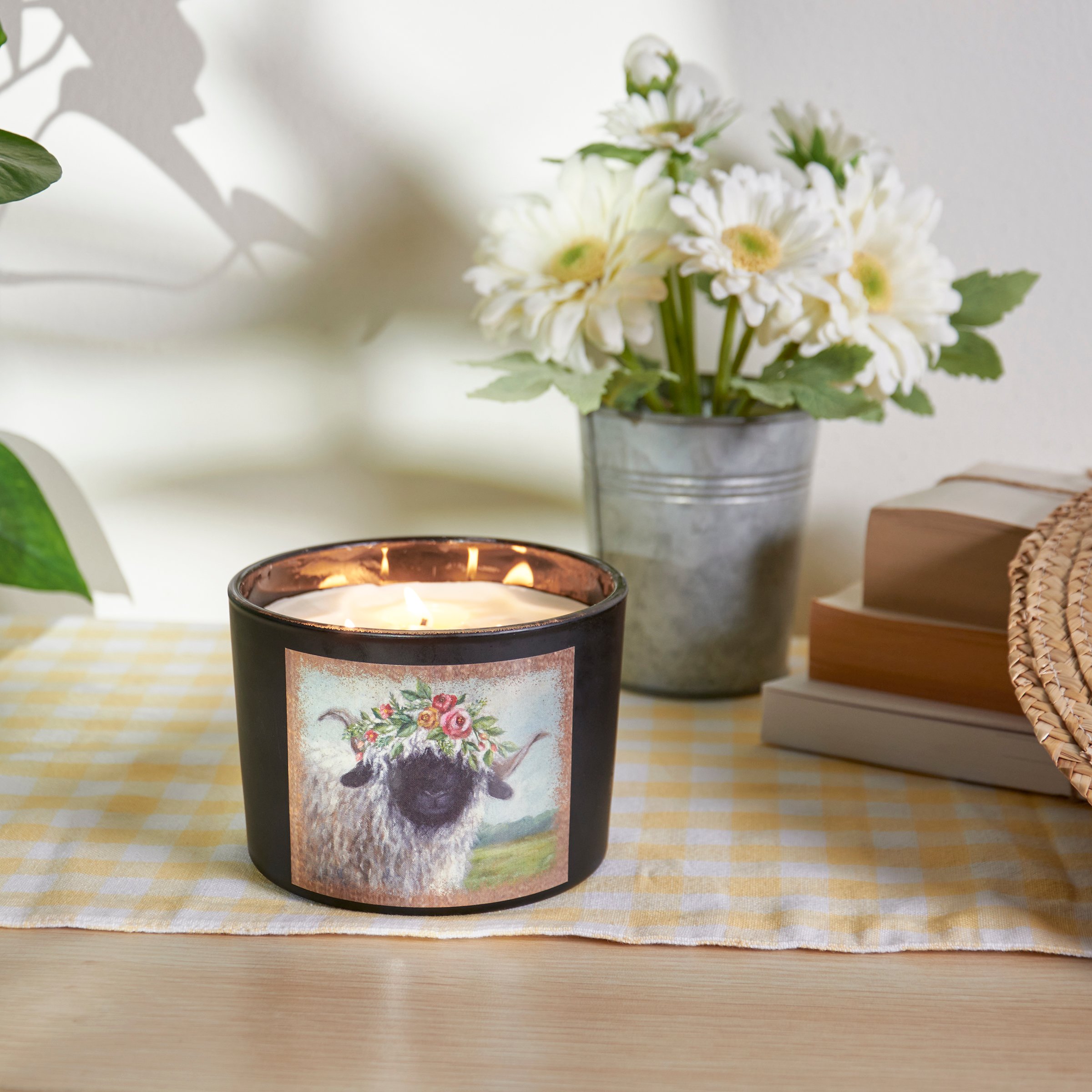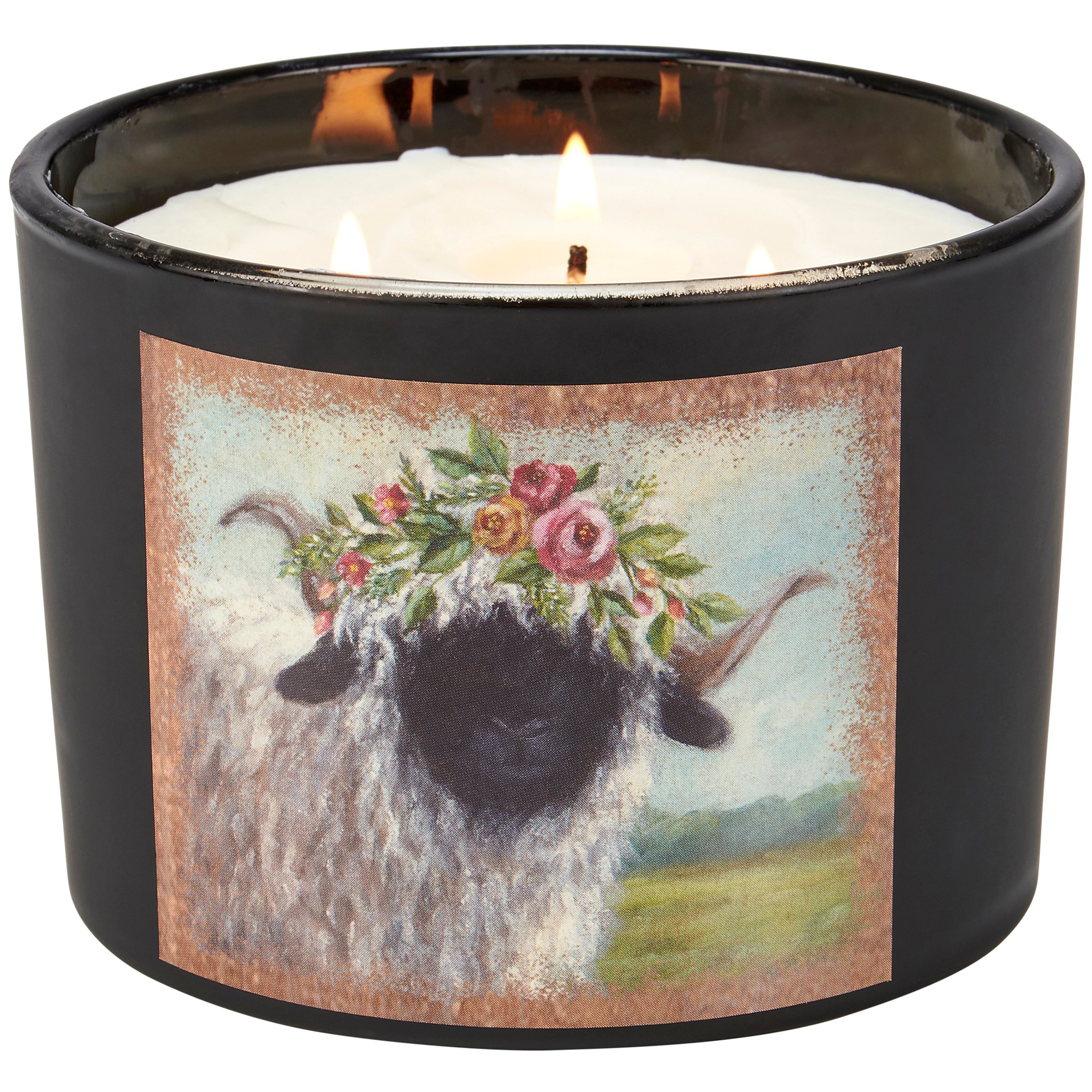 A jar candle from our Easter & Spring Collection displaying a double-sided design of a sheep wearing a crown of spring florals on black matte glass. Design is replicated from original artwork painted onto burlap canvas, giving the art a unique depth and texture. Candle features soy-based wax and 3 fabric wicks with 30 hours of burn time activating a calming Lavender scent. Our Floral Crown Sheep candle includes a dust cover and plastic lid for protection and polished appearance. A charming everyday home accent great for gifting.