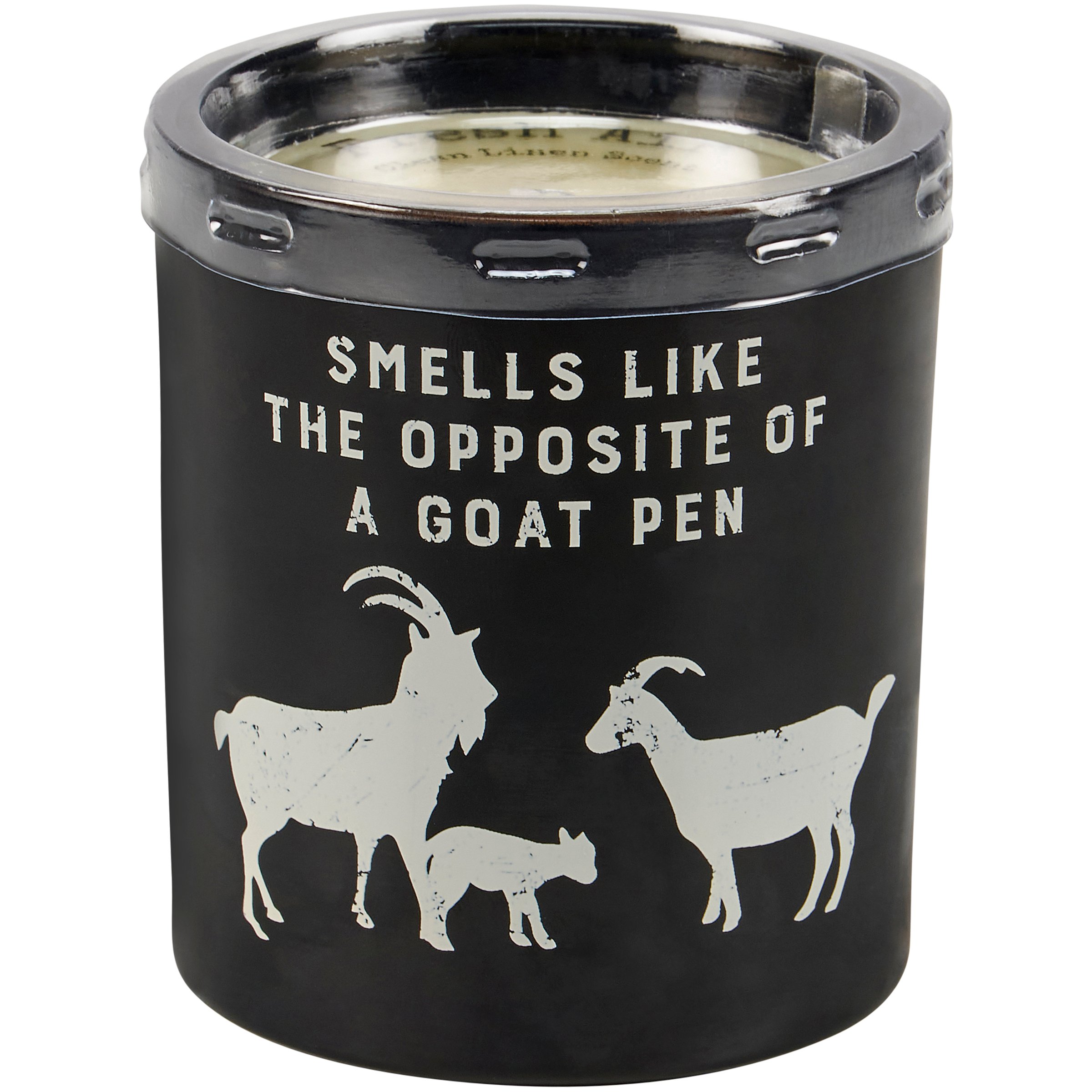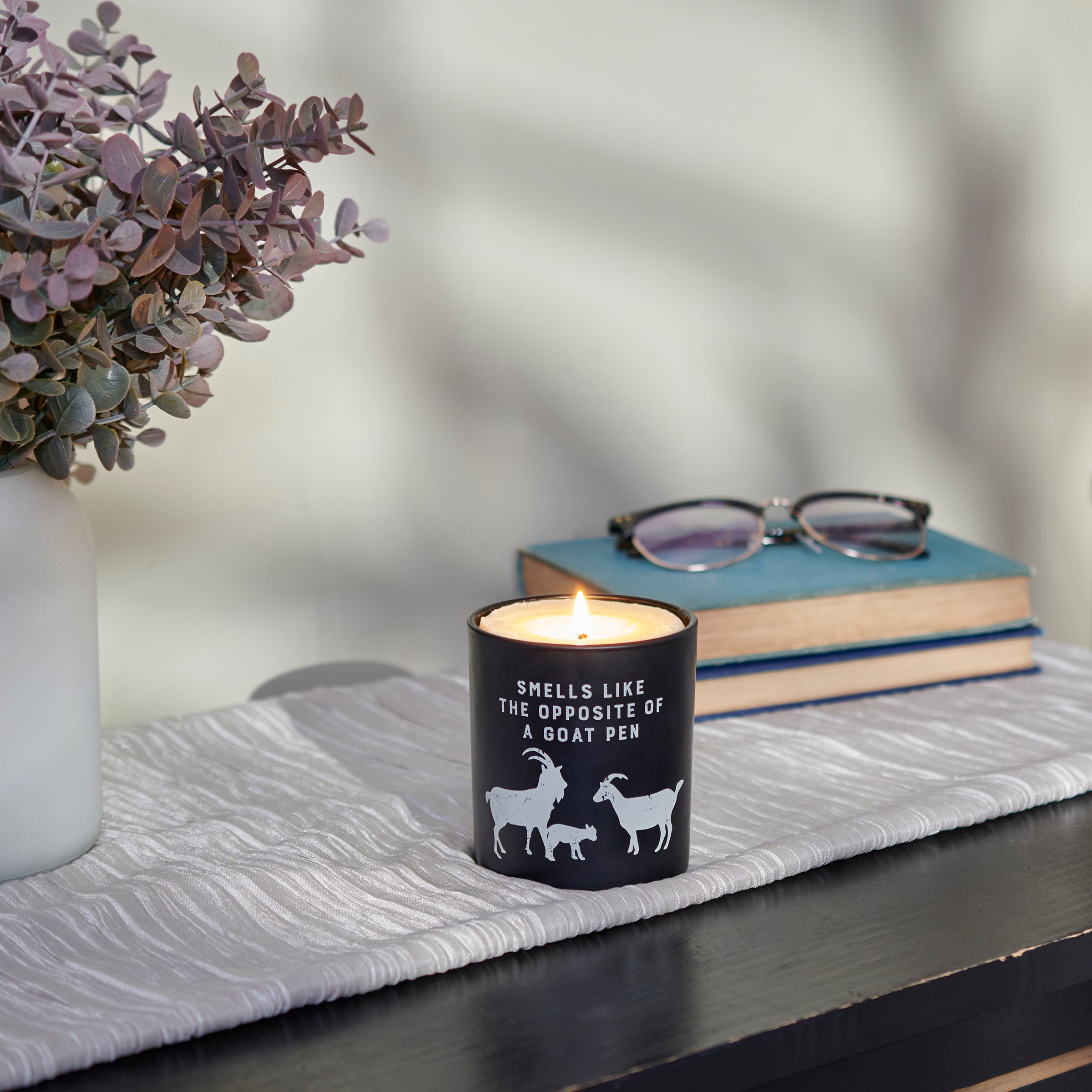 A jar candle from our Farmhouse Collection displaying a design of goats in a rustic style on matte black glass with a farm-themed sentiment that reads "Smells Like The Opposite Of A Goat Pen." Candle features soy-based wax and cotton wick with 35 hours of burn time activating a refreshing Fresh Air scent. Our Goat Pen jar candle includes a dust cover and plastic lid for protection and polished appearance. A fun farm-themed home accent that is great for gifting.