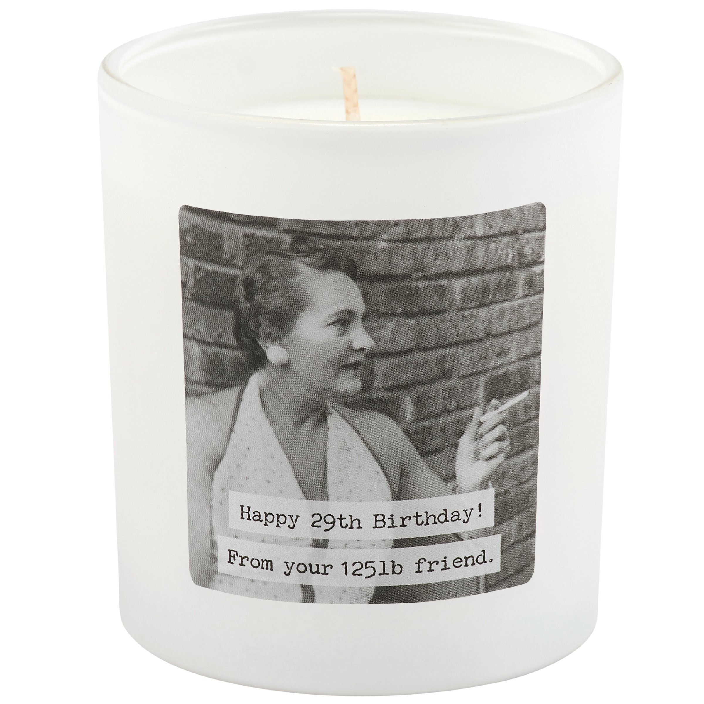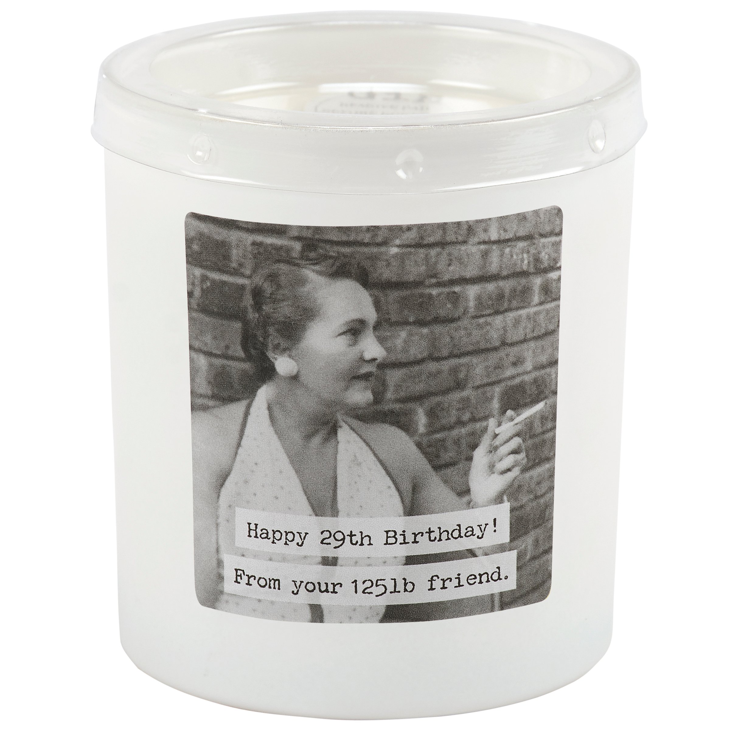 A jar candle from our Trash Talk By Annie Collection displaying a double-sided design of a vintage black and white photograph on frosted white glass complemented with a sassy birthday sentiment that reads "Happy 29th Birthday! From Your 125lb Friend." This funny candle features soy-based wax and a cotton wick with 35 hours of burn time activating a fun Birthday Cake scent. Our Happy 29th Birthday candle includes a dust cover and plastic lid for protection and enhanced appearance on store displays. A fun birthday gift perfect for adding personality to any home or work space.