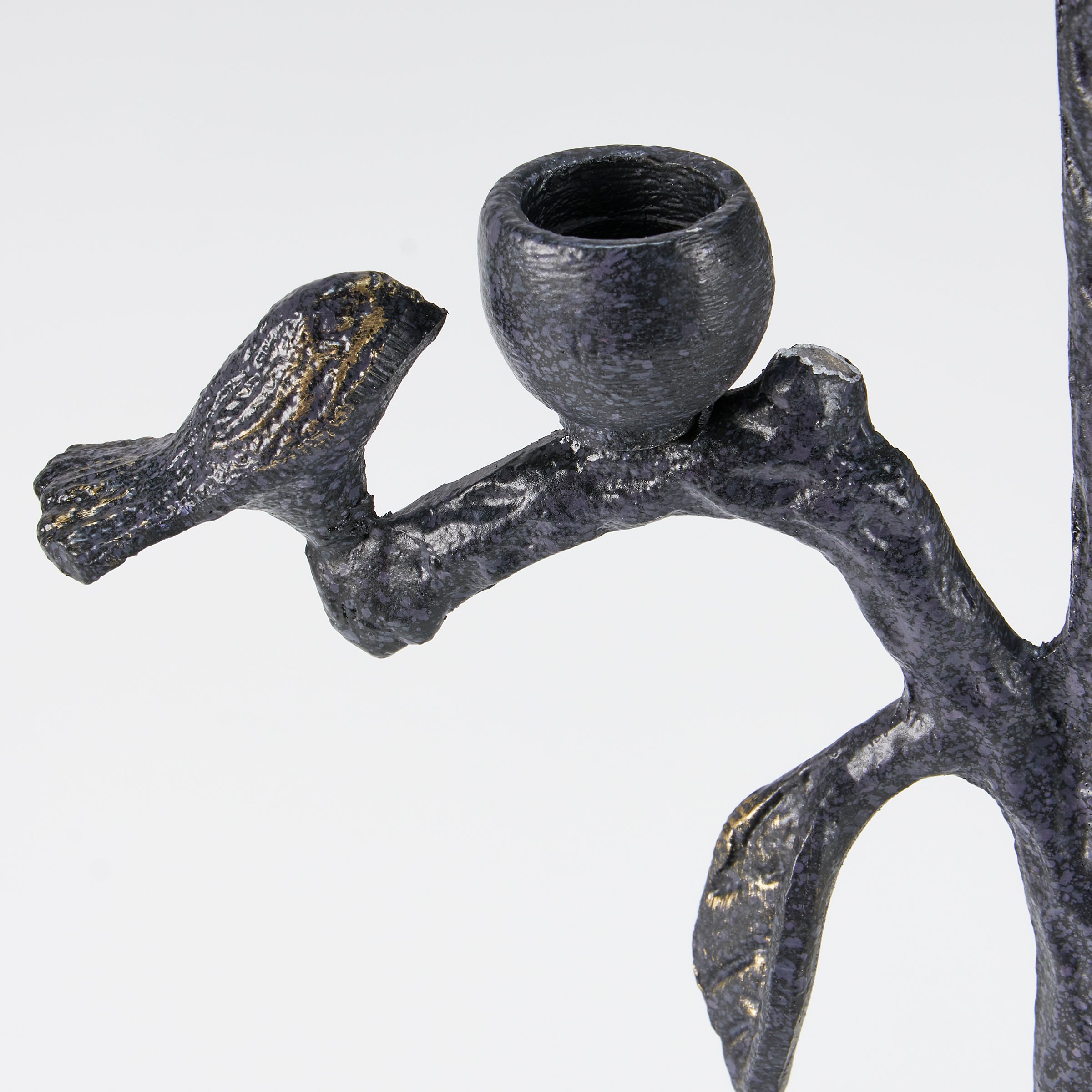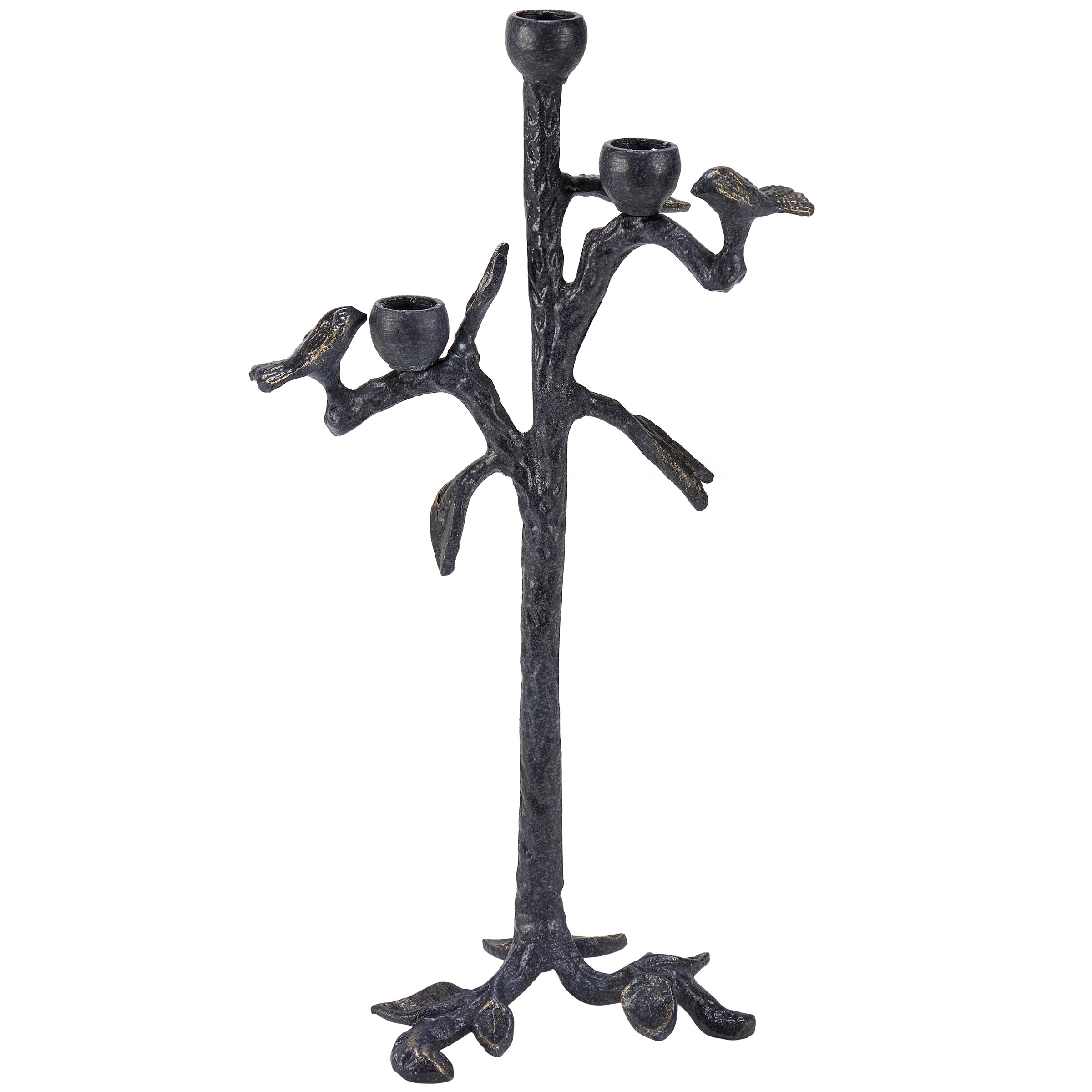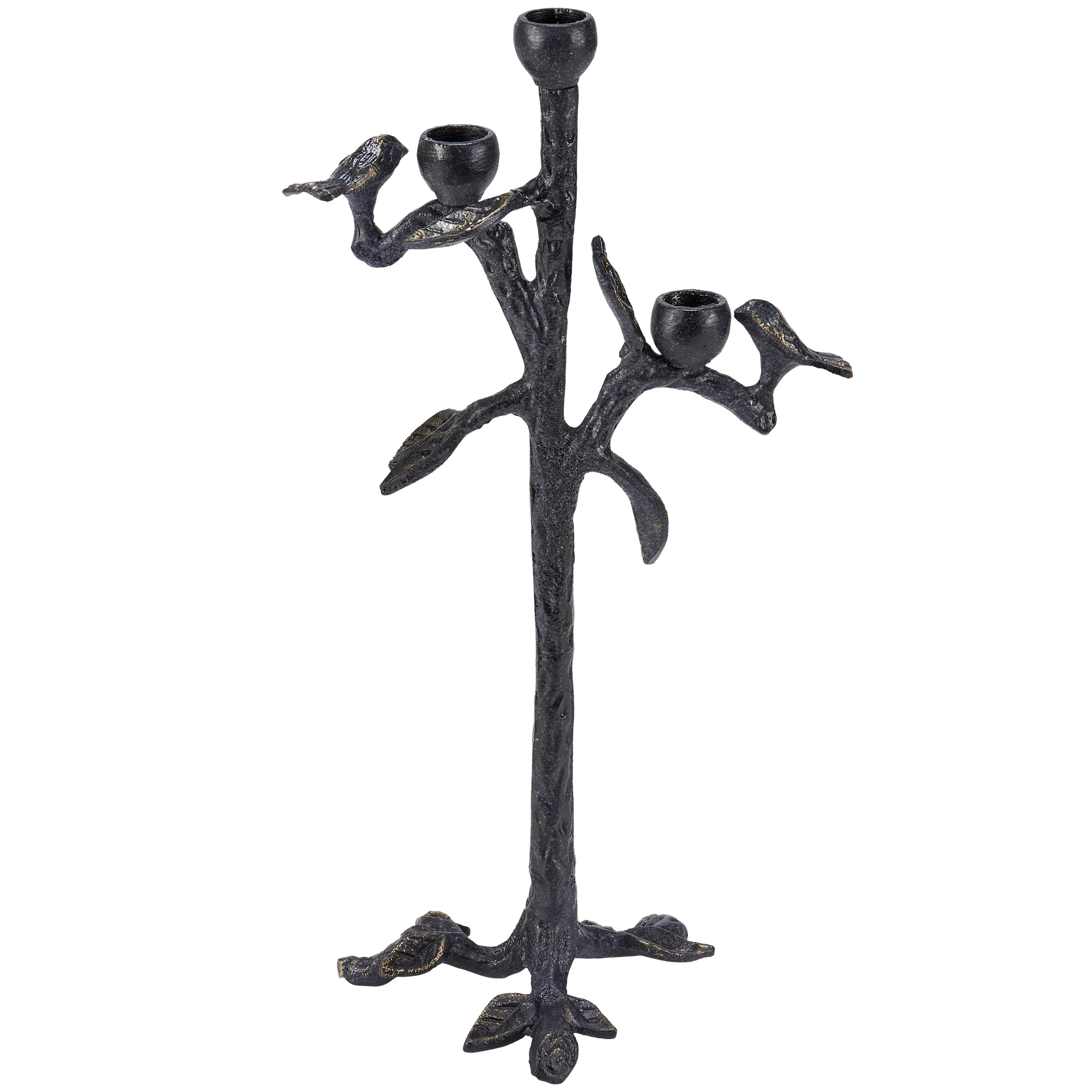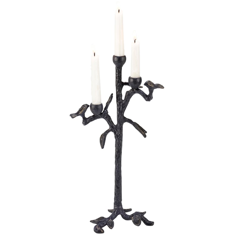 A metal candle holder that coordinates well with décor from our Easter & Spring Collection. Candle holder features a primitive inspired design that emulates a tree with sculpted birds and leaves on the branches. Our Bird Branch candle holder fits up to three standard taper candles and can free-stand on flat surface. Candles pictured not included. A rustic home accent perfect for adding natural lighting to any space.