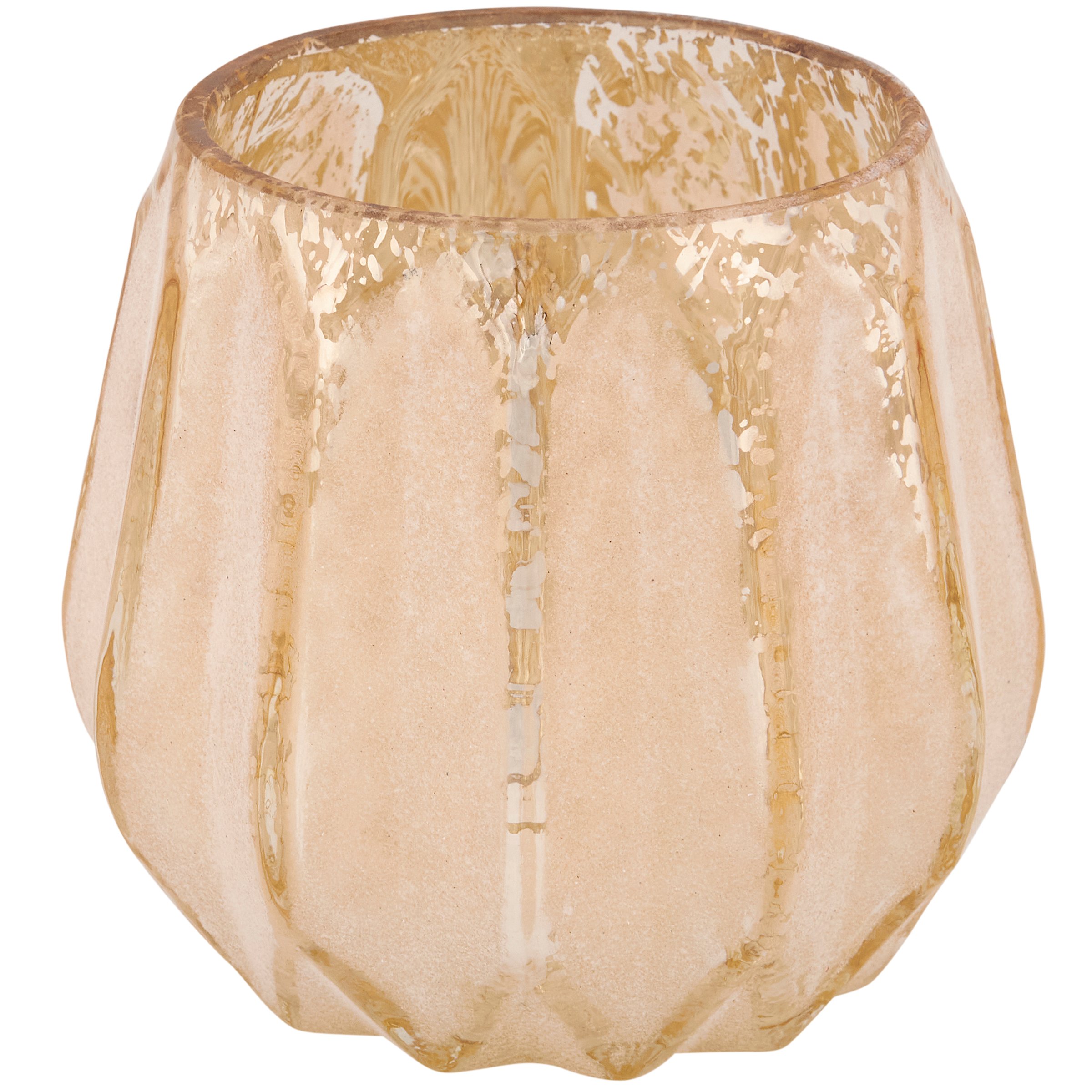 A glass candle holder from ourĀ Fall & Harvest Collection. Candle holder displays a blush inspired gold color with frosted and fleck accents. Our Blush Gold candle holder includes space inside to place a votive candle. Candle pictured not included. Perfect for a stylish seasonal home accent that adds natural lighting to any living space.