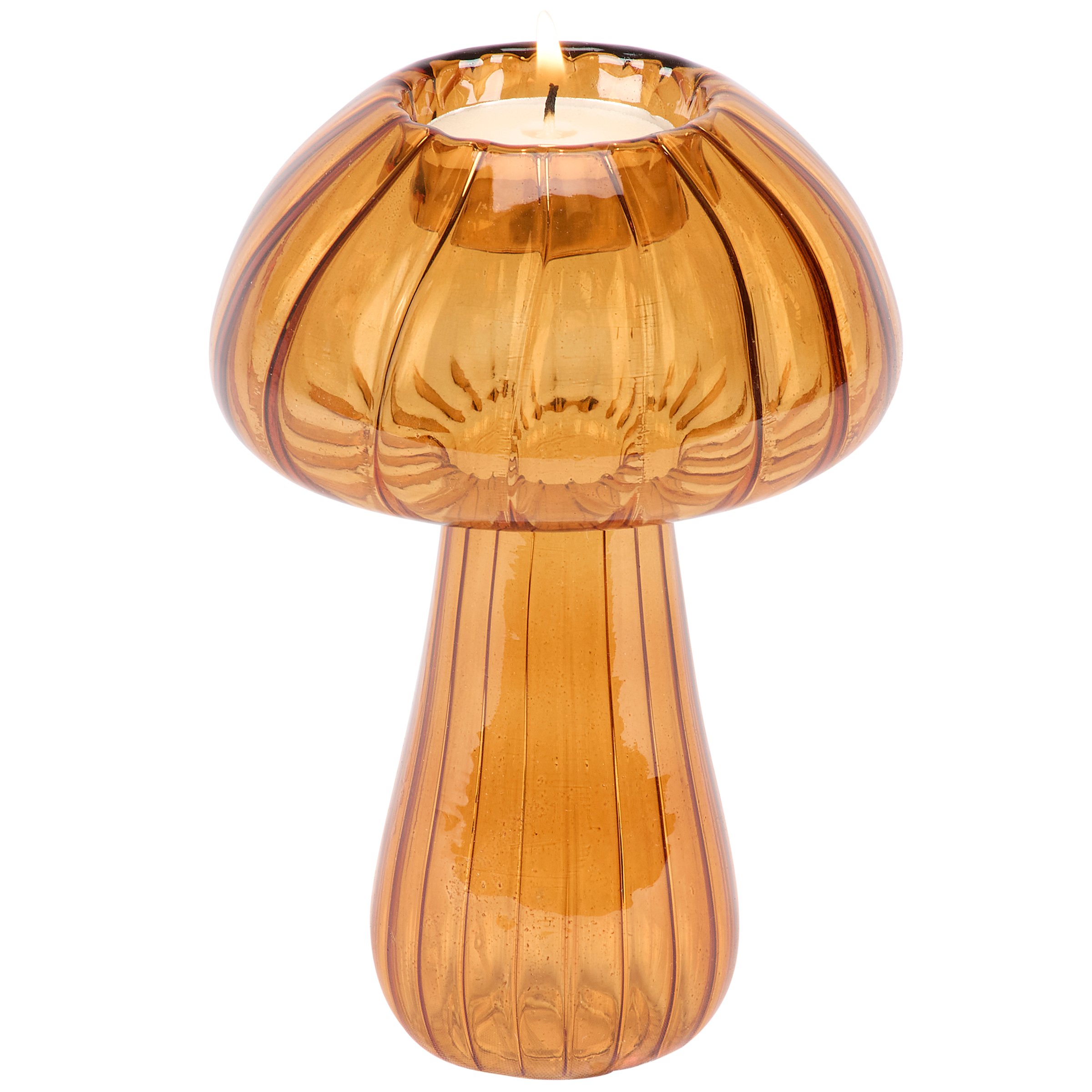 A candle holder that coordinates well with décor from our Fall & Harvest Collection. Seasonal candle holder features a standing mushroom design made from sculpted brown glass with a center slot on top for a single candle. Our Glass Mushroom candle holder fits a standard tealight candle and can free-stand on flat surface for display. Candle pictured not included. A stylish fall home accent perfect for adding natural lighting to any living space.