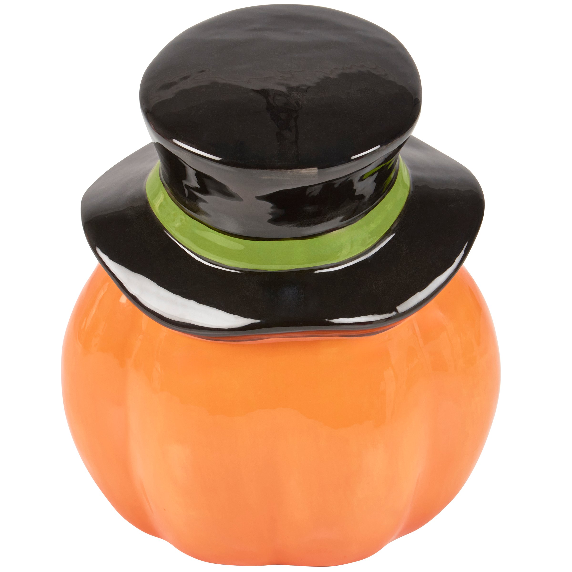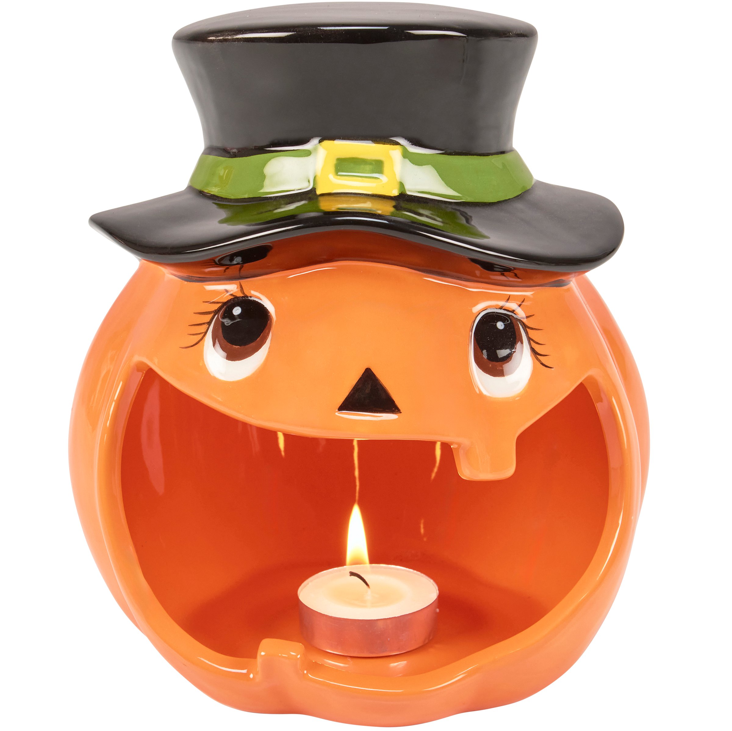 A ceramic candle holder that coordinates well with décor from our Halloween Collection. Seasonal candle holder features a fun sculpted jack o'lantern design with a colorful glaze finish and area inside the mouth for a single candle or wrapped Halloween treats. Hand wash only. Our Jack O'Lantern candle holder fits a standard tealight candle and can free-stand on flat surface. Candle pictured not included. A fun seasonal home accent perfect for adding natural lighting to any living space.
