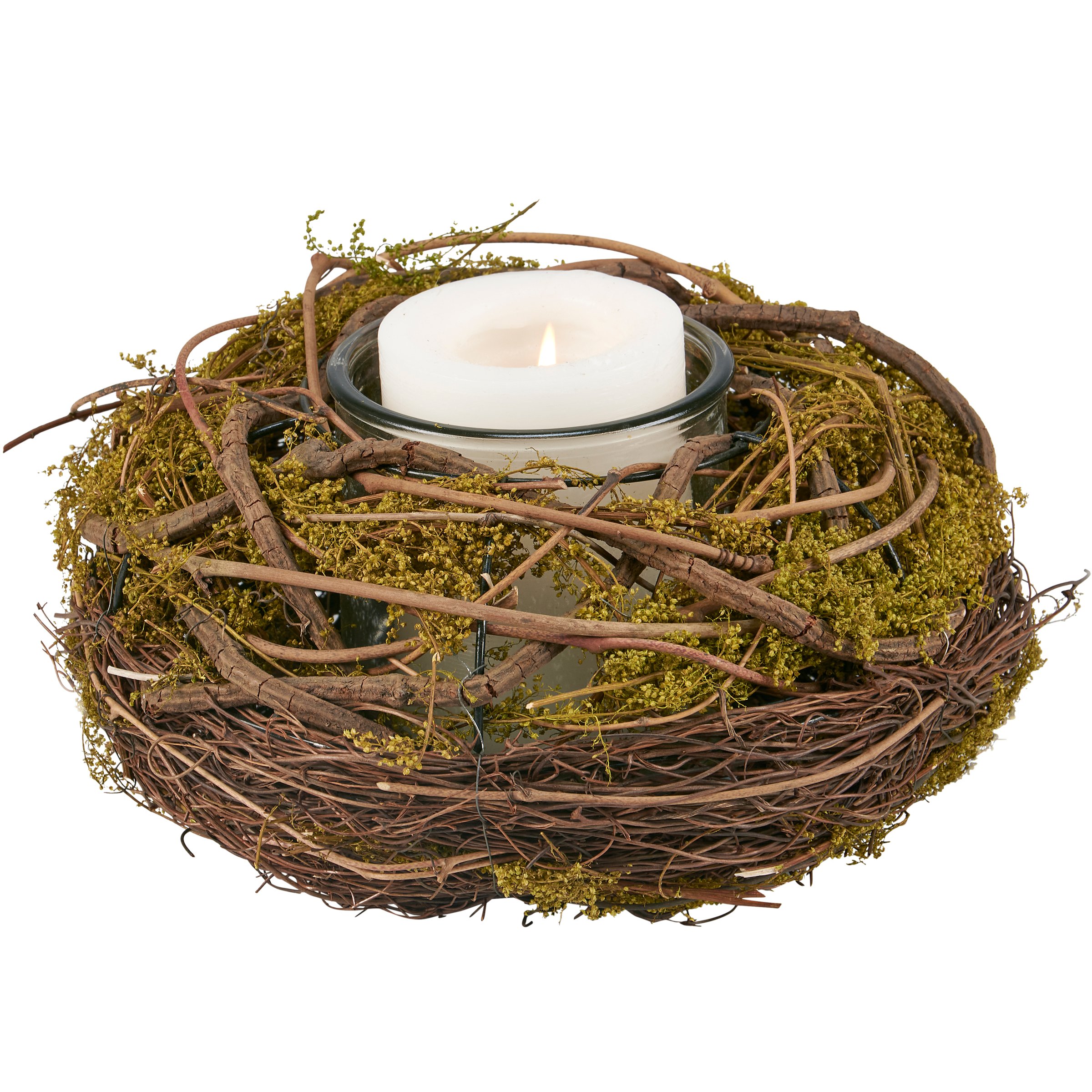 A candle holder from ourĀ Botanical Collection displaying a unique natural appearance. Candle holder features moss ball design using natural wood vines and preserved moss to create a base for a glass candle holder. Our Moss Ball candle holder includes removable glass holder that holds classic pillar candles. Candle pictured not included. A nature-themed home accent perfect for adding natural lighting to any space.