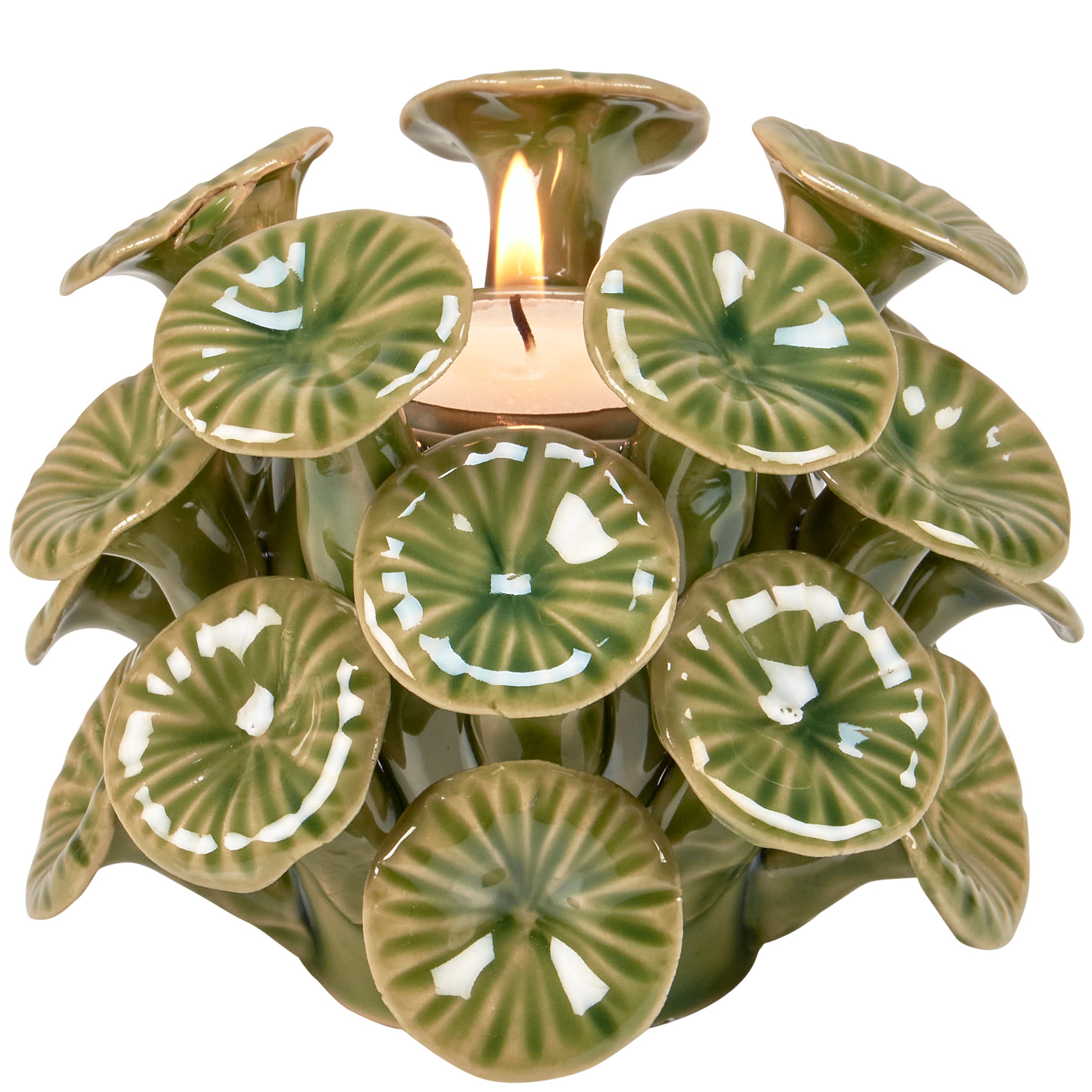 A ceramic candle holder that coordinates well with décor from our Cottagecore Collection. Candle holder features a dimensional mushroom blooms inspired design with a green glaze finish and center slot for a single candle. Our Mushroom Bloom candle holder fits a standard tealight candle and can free-stand on flat surface. Candle not included. A charming home accent perfect for adding natural lighting to any living space.