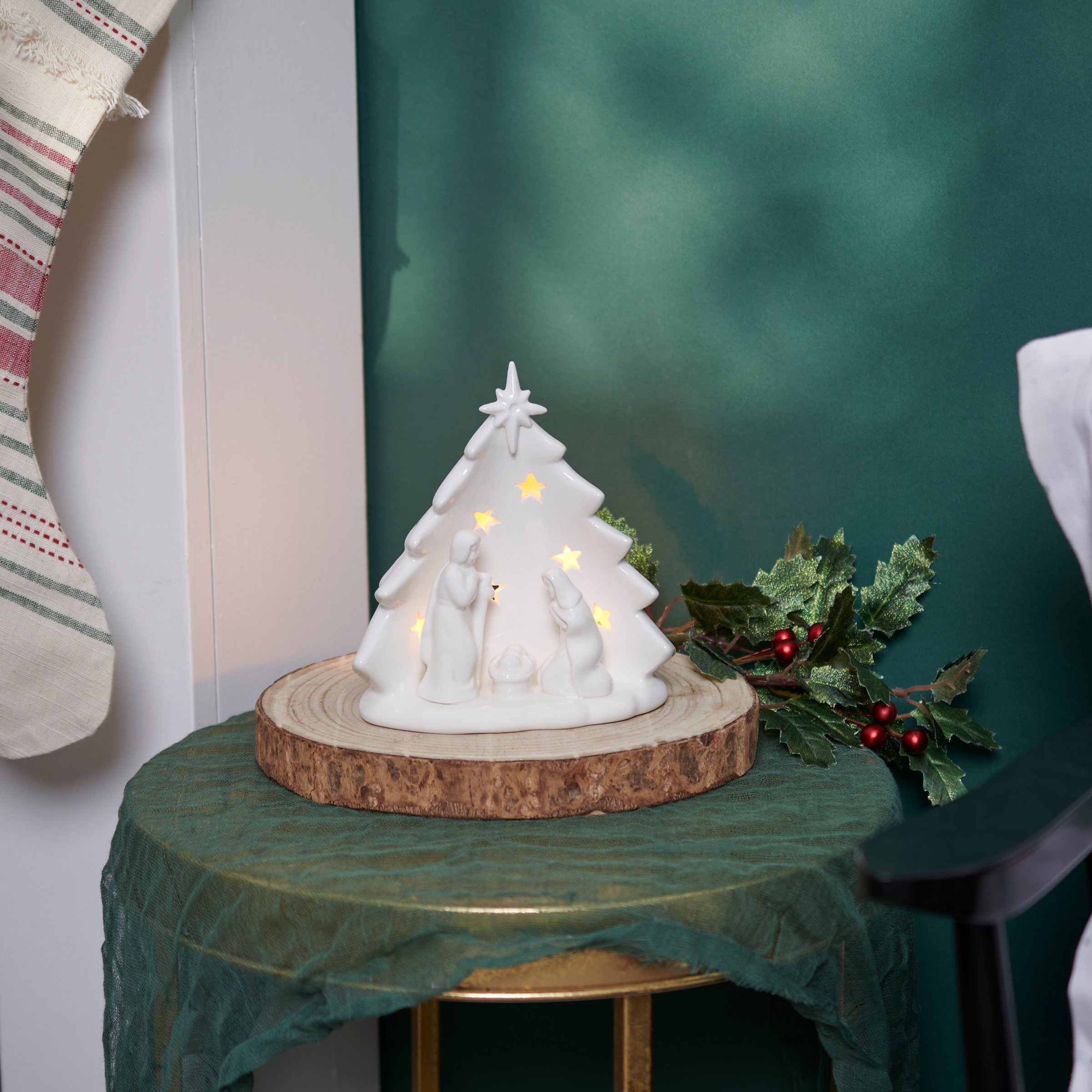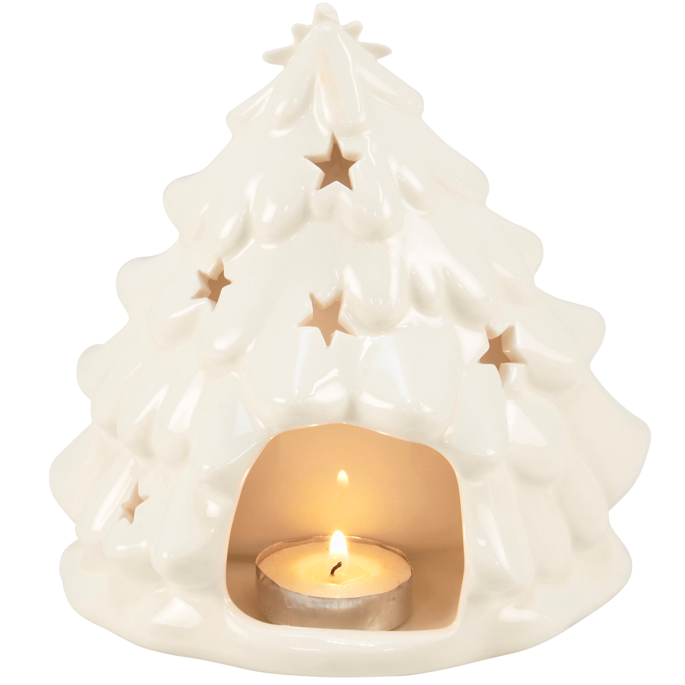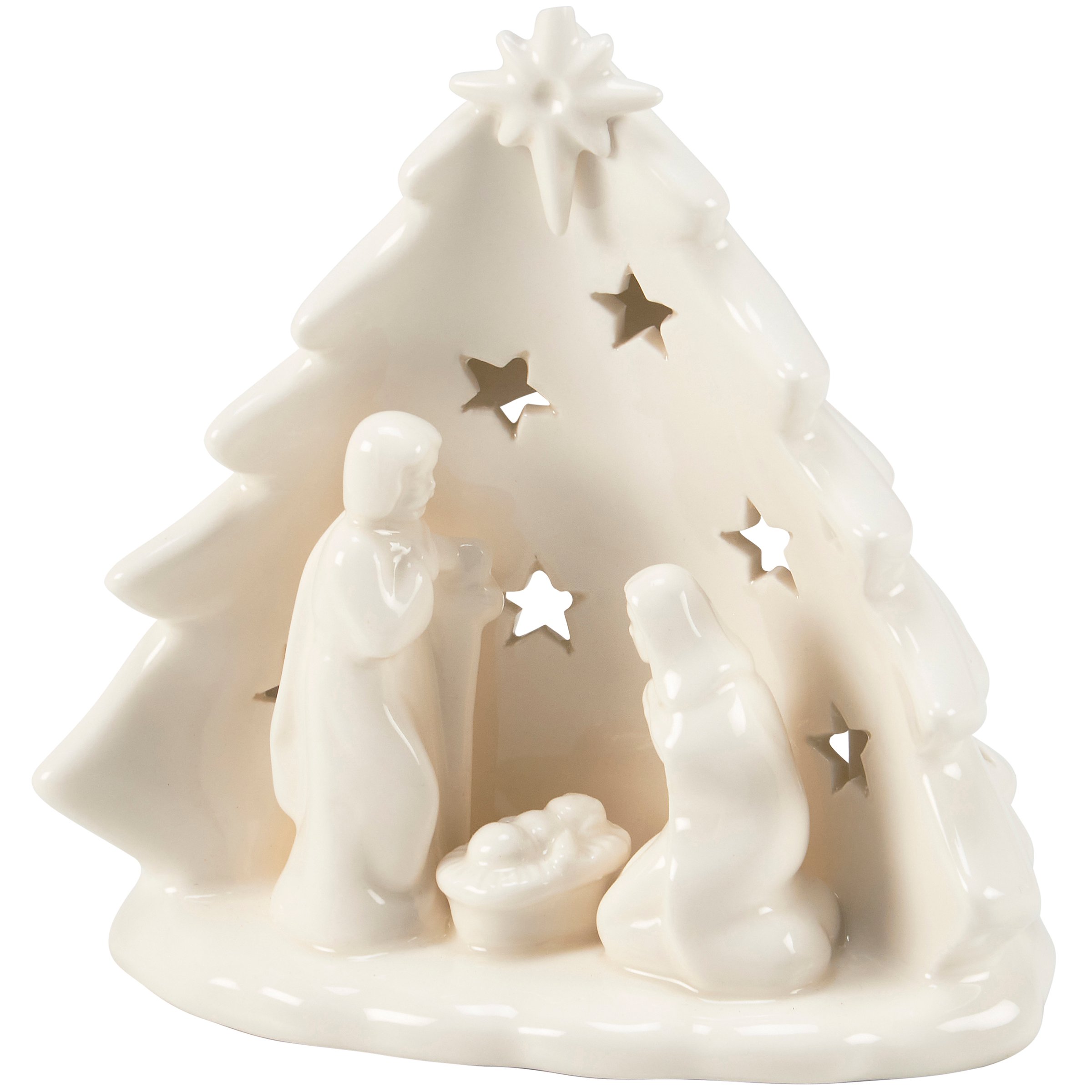 A ceramic candle holder that coordinates well with décor from our Christmas Collection. Seasonal candle holder features a sculpted nativity and Christmas tree design with simple glaze finish and a space in the back for a single candle that illuminates the cutout star designs throughout the tree. Our Nativity candle holder fits a standard tealight candle and can free-stand on flat surface. Candle pictured not included. A nativity-themed home accent perfect for adding natural lighting to any living space.