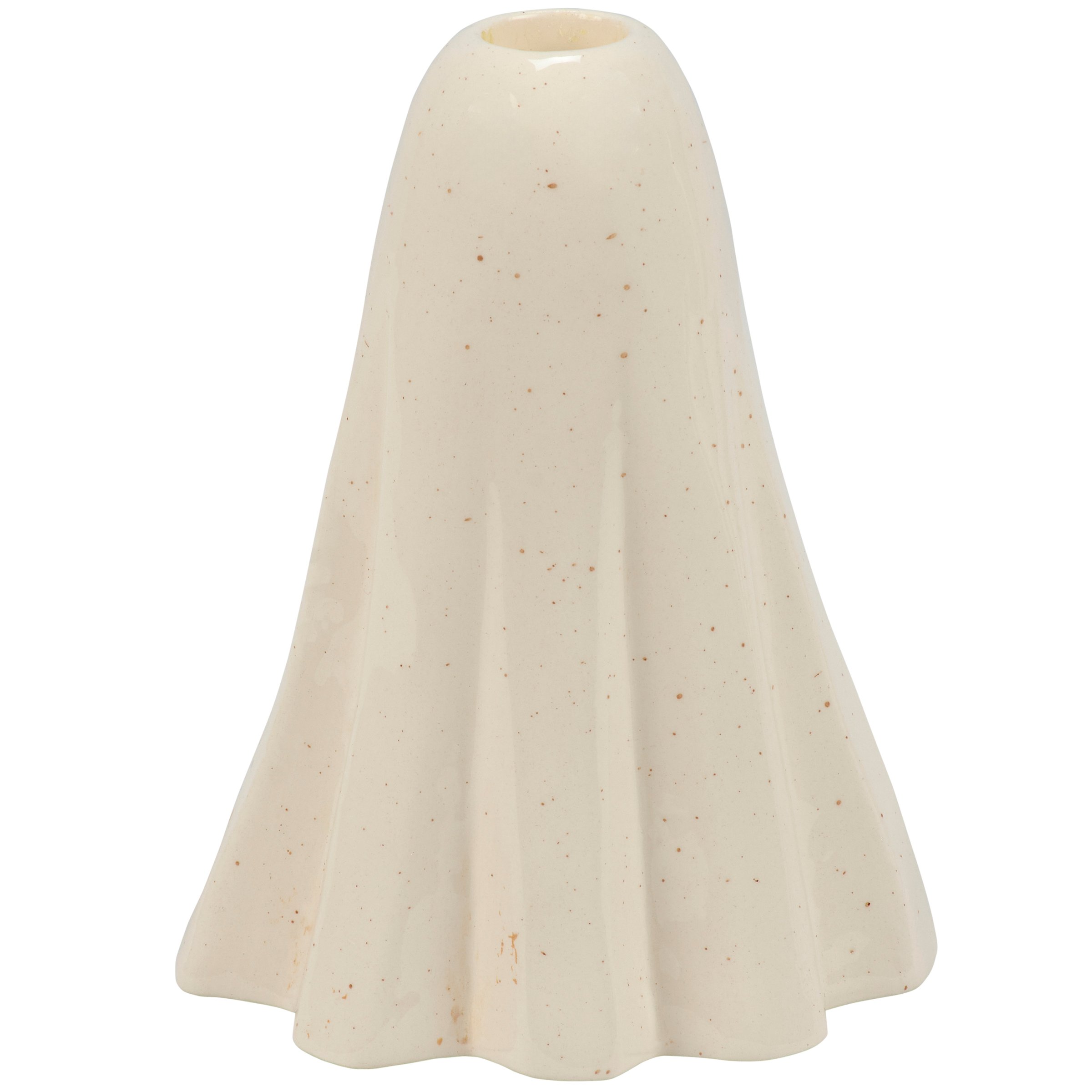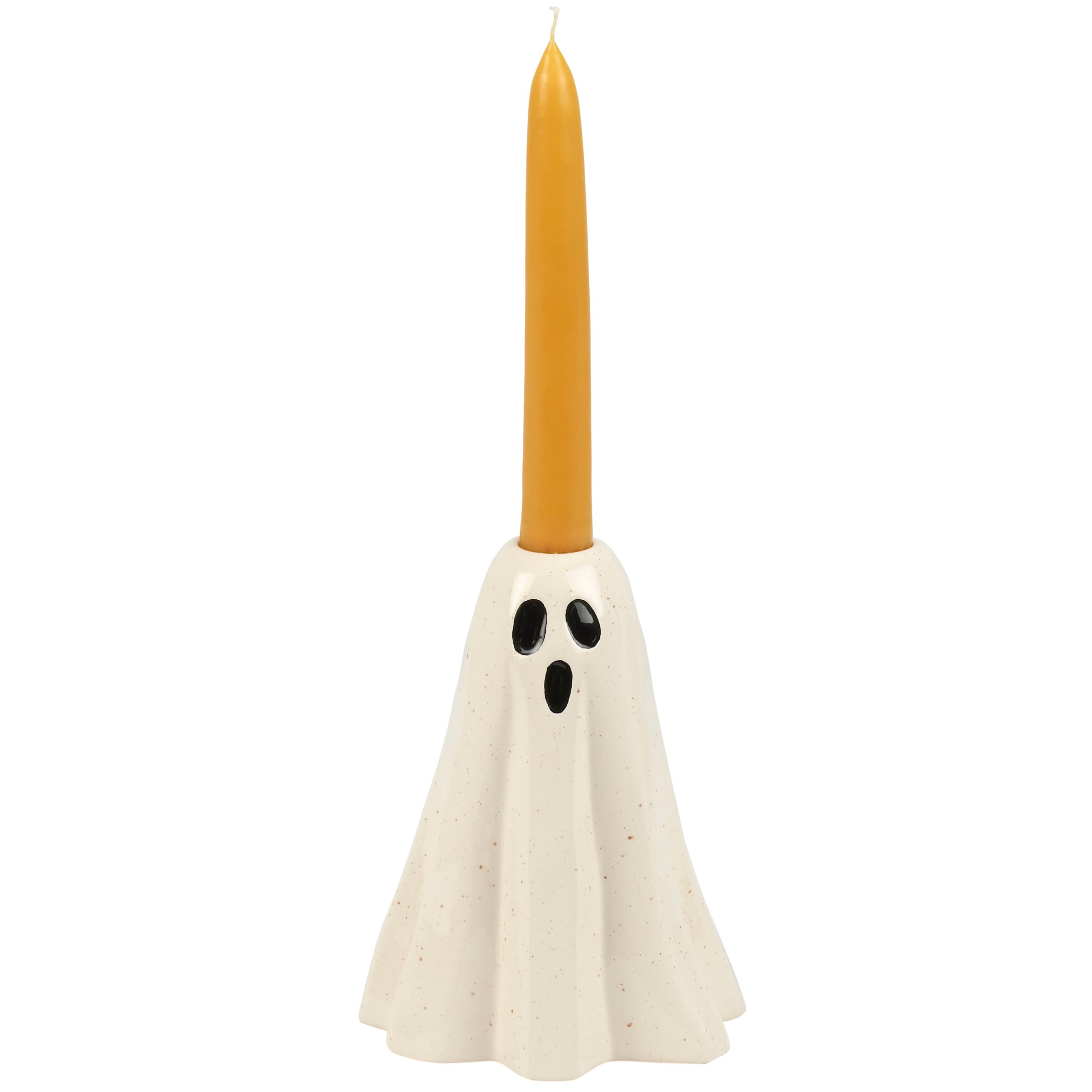 A ceramic candle holder that coordinates well with décor from our Halloween Collection. Seasonal candle holder features a fun sculpted sheet ghost design with a painted boo face and a slot on top to place a single candle. Our Scary Ghost candle holder fits standard taper candles and can free-stand on flat surface for display. Candle pictured not included. A fun Halloween home accent perfect for adding natural lighting to any space.