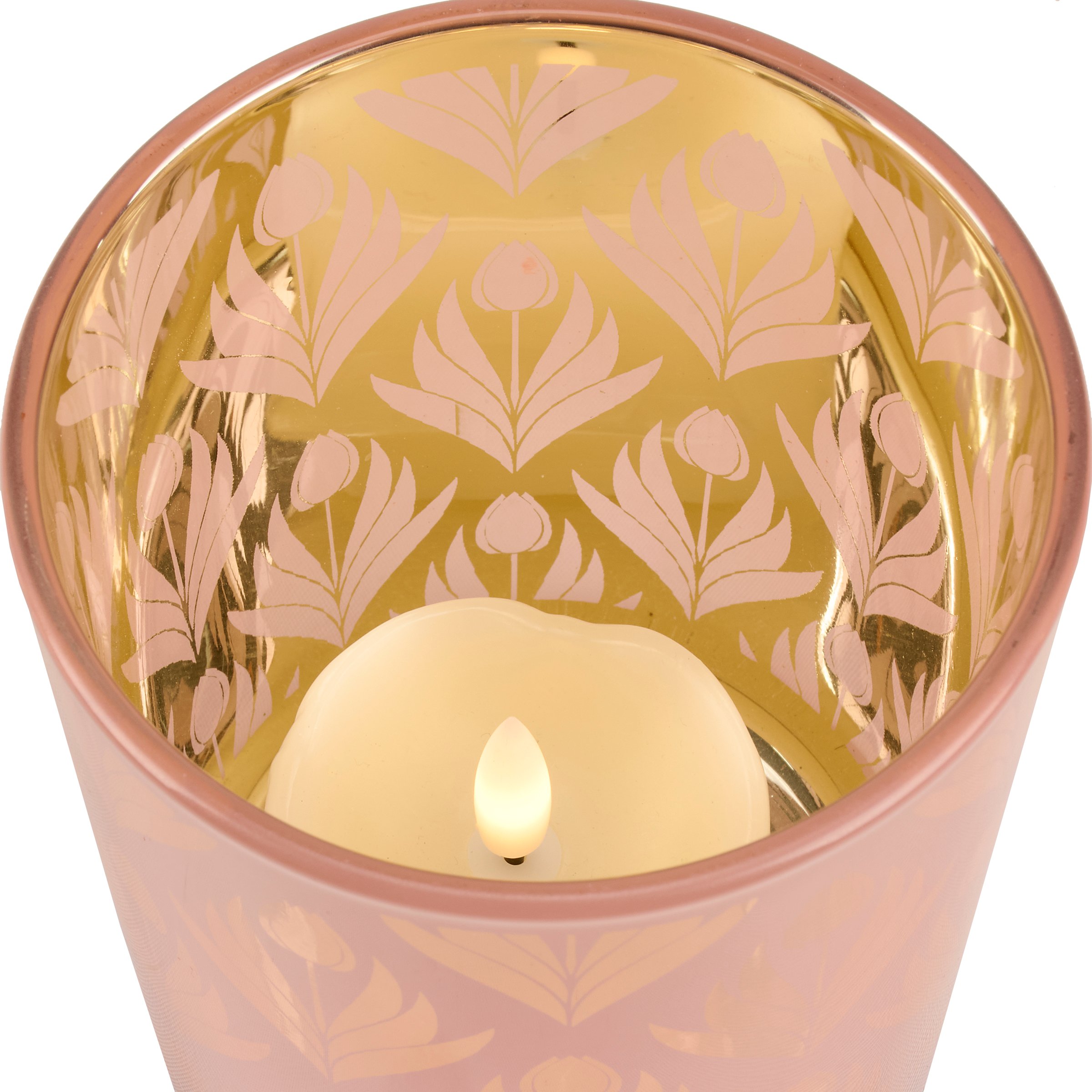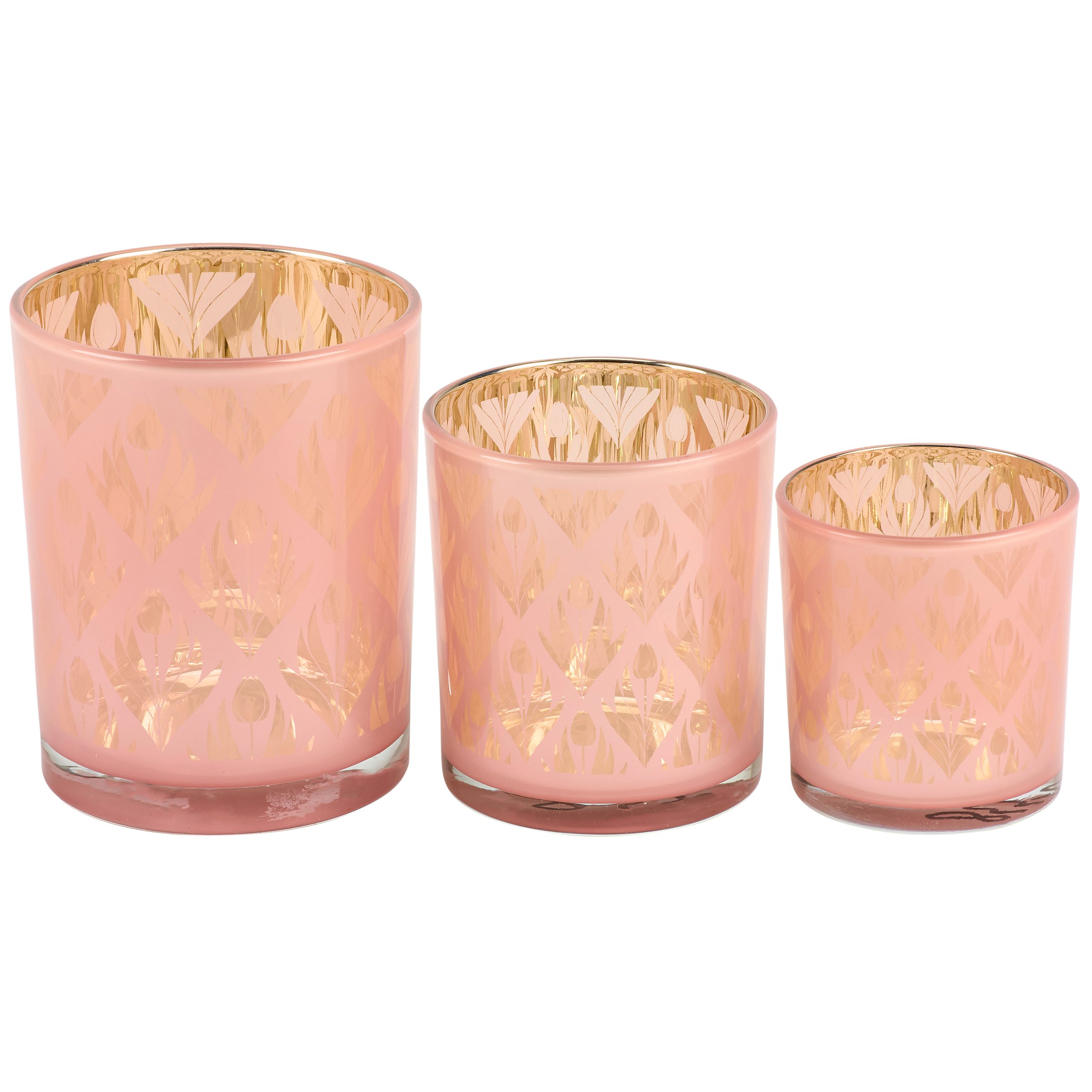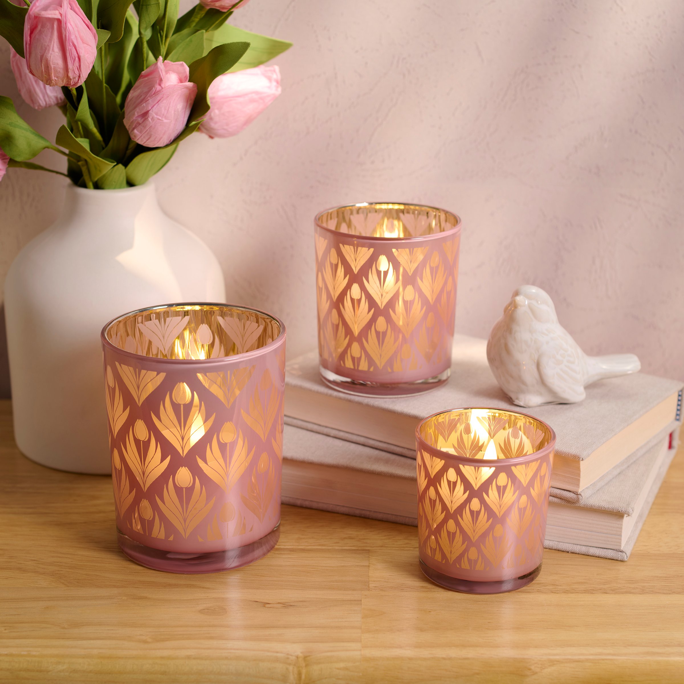 A set of glass candle holders from ourĀ Garden Collection. Each candle holder displays a pattern of diamond shaped florals on pink frosted glass with metallic gold accents inside. Our Floral Diamonds candle holder set includes three different size holders with space inside to place votive or tealight candles. Candles pictured not included. Perfect for a floral-themed home accent that adds natural lighting to any space.