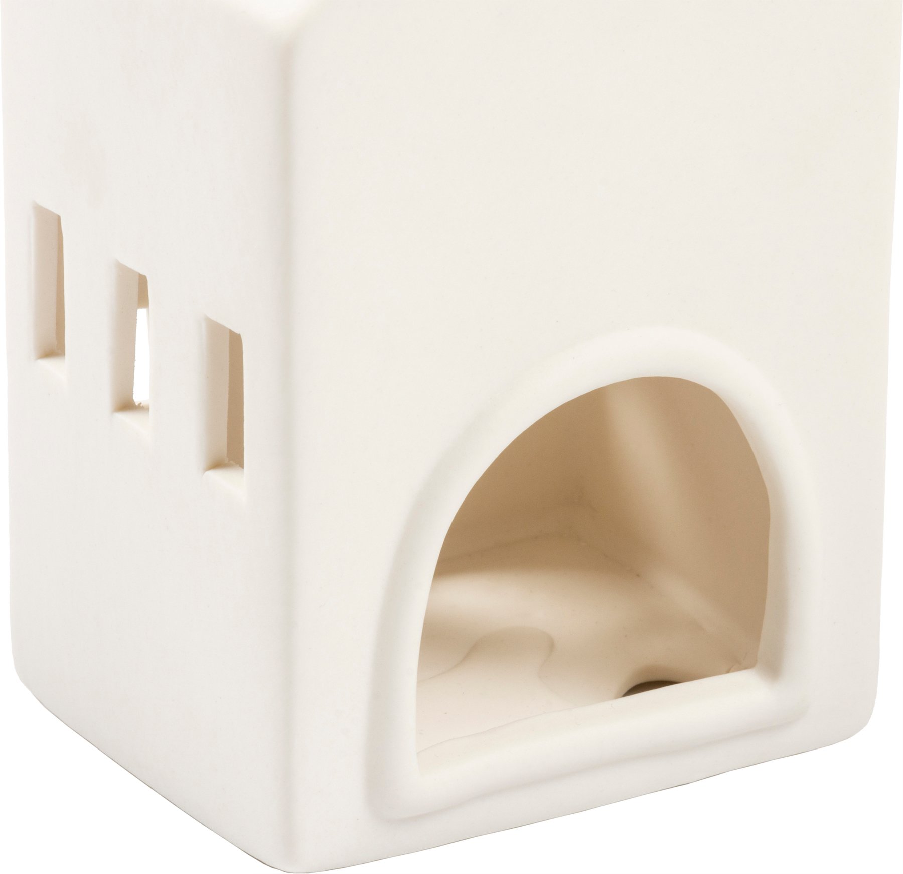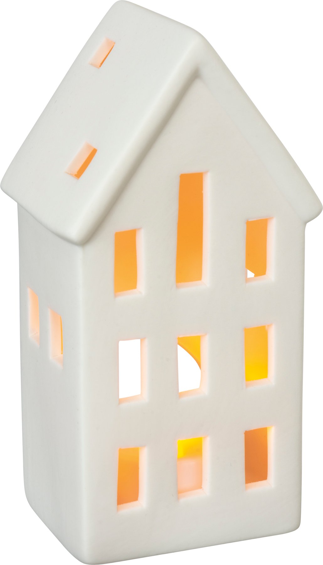 A set of three house-shaped stoneware candle holders, two featuring a matte white finish and one featuring a shiny gray. Set complements well with any décor style. Each house holds one battery-operated tea light (included).