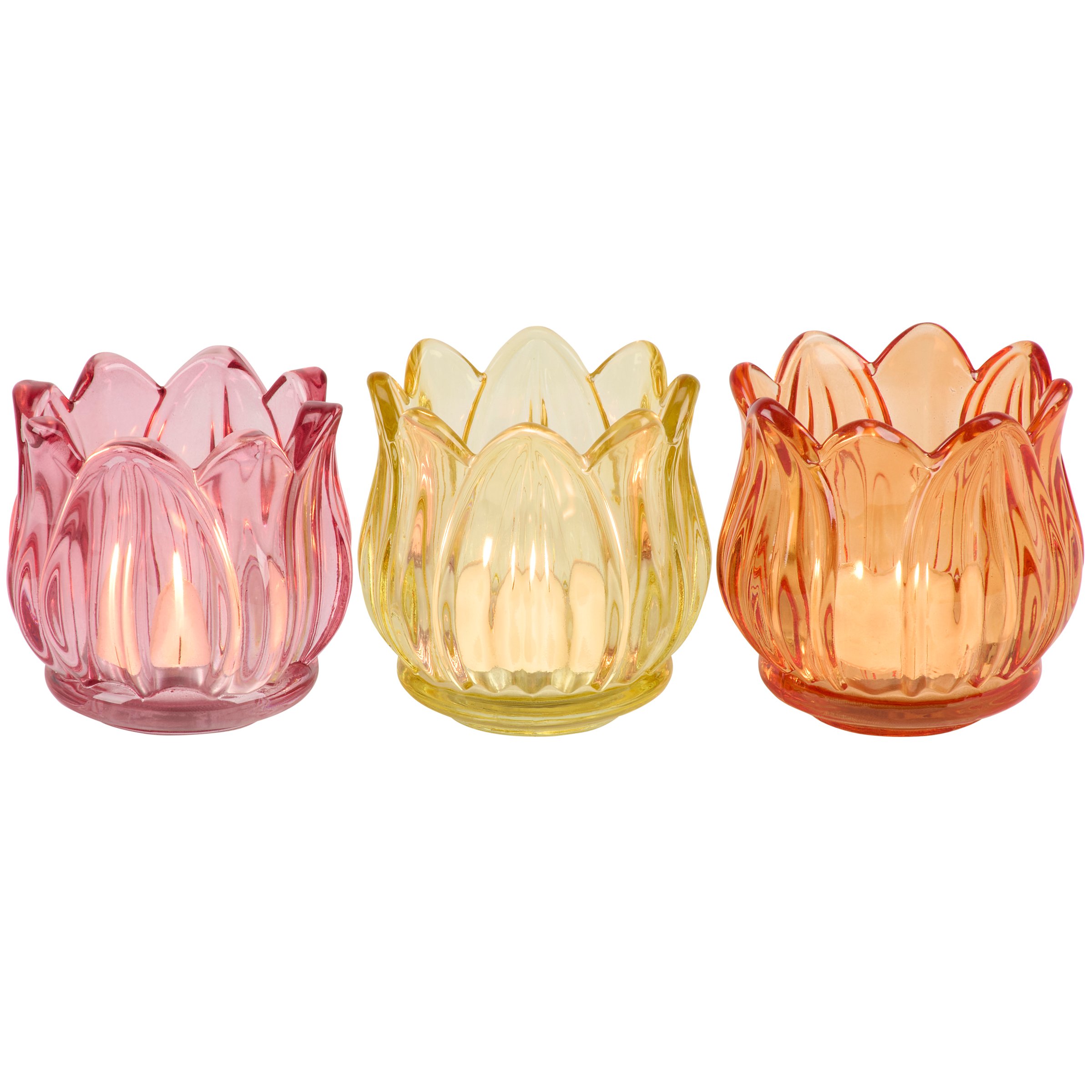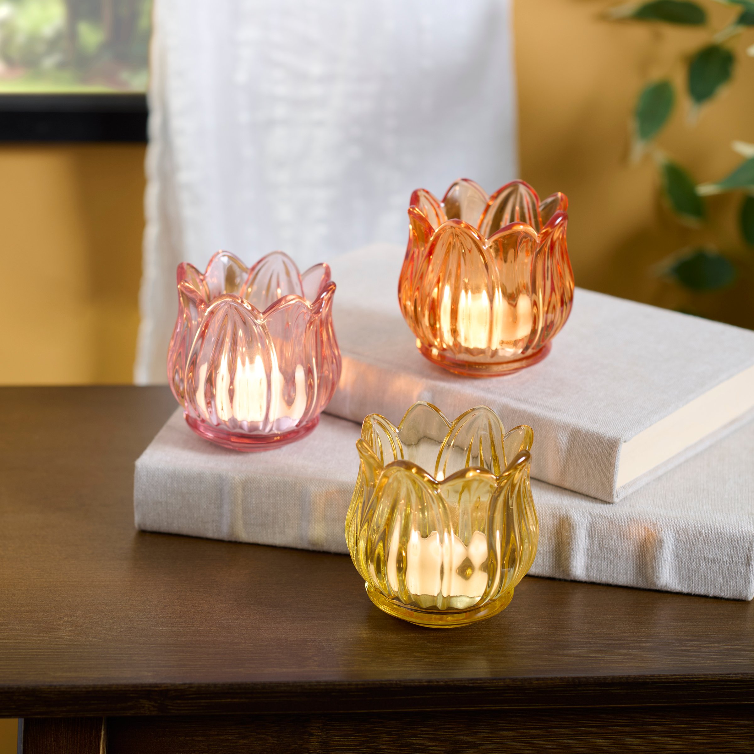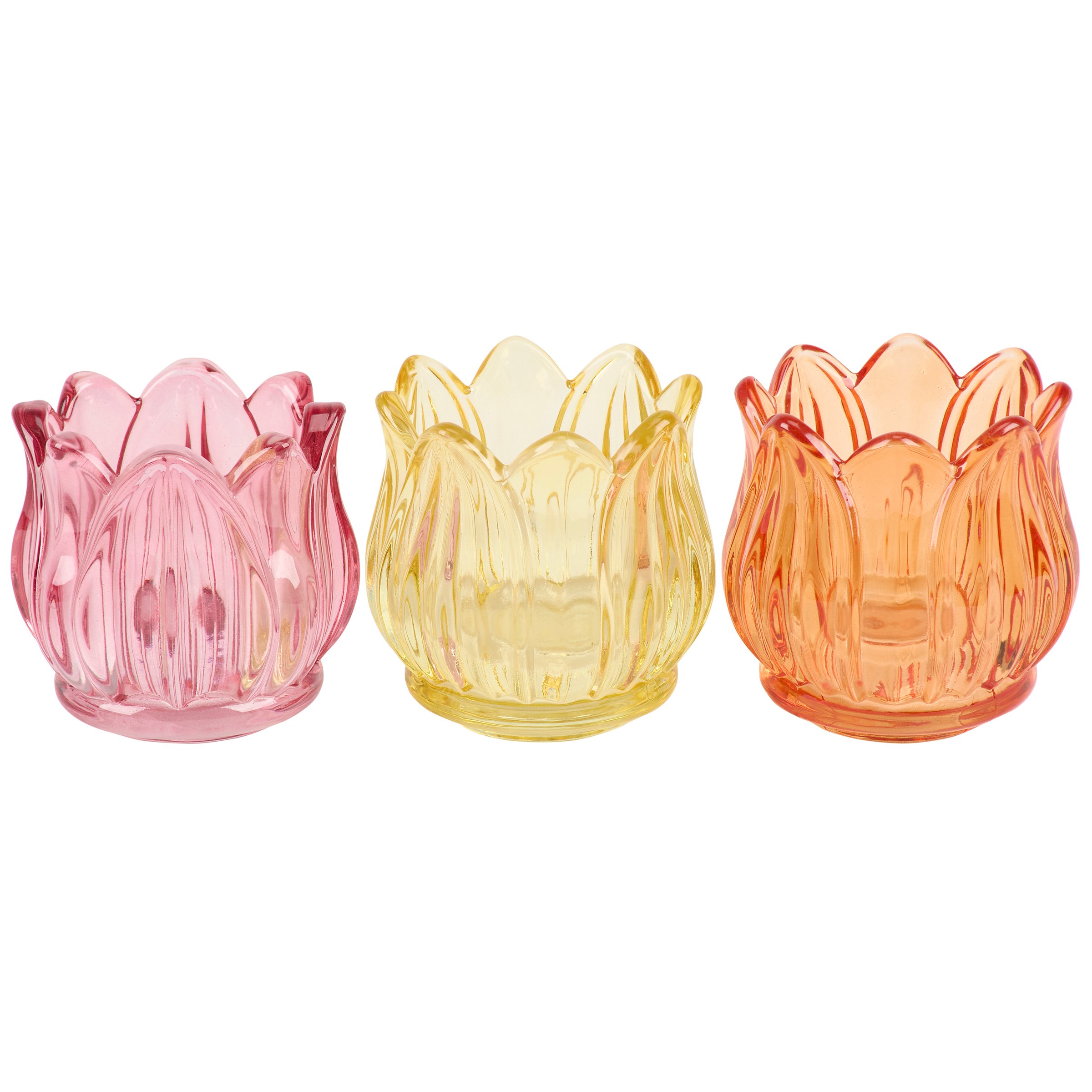 A set of glass candle holders that coordinates well with home decor from ourĀ Easter & Spring Collection. Each candle holder displays a sculpted tulip blossom shape. Our Tulip Blossom candle holder set includes 3 different color holders including pink, yellow, and orange with space inside to place tealight candles. Candles pictured not included. Perfect for a spring themed home accent that adds natural lighting to any space.