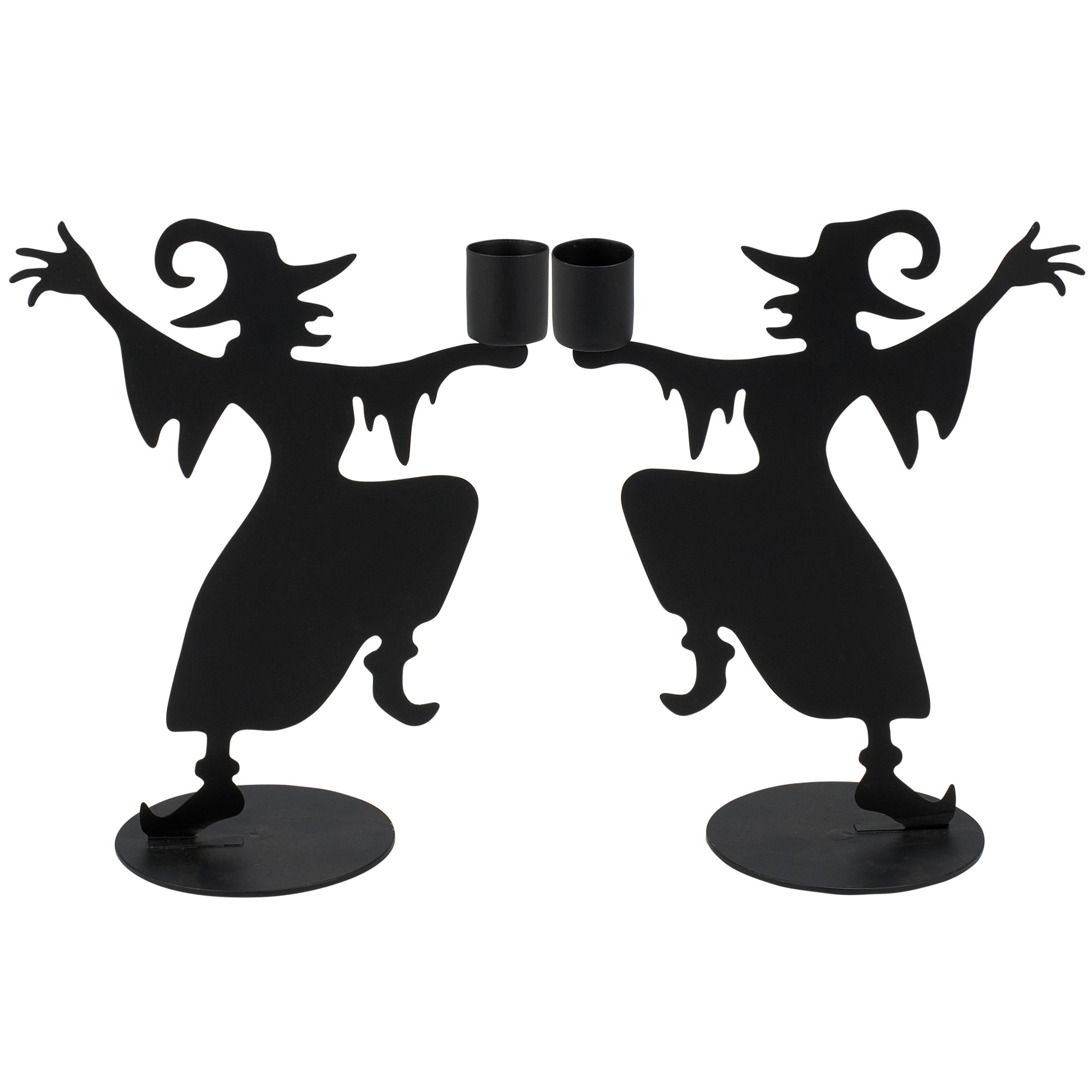 A set of 2 metal candle holders that coordinate well with décor from our Halloween Collection. Seasonal candle holders feature matching metal cutout designs of dancing witches in matte black with holder on their hand. Our Witches candle holder set fits standard taper candles and each piece can free-stand on flat surface for display. Candles pictured not included. A set of fun Halloween home accents perfect for adding natural lighting to any space.