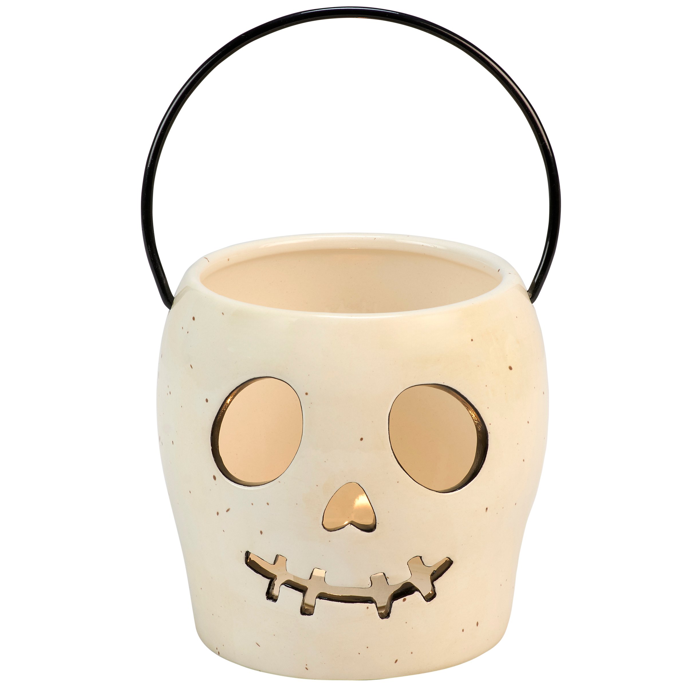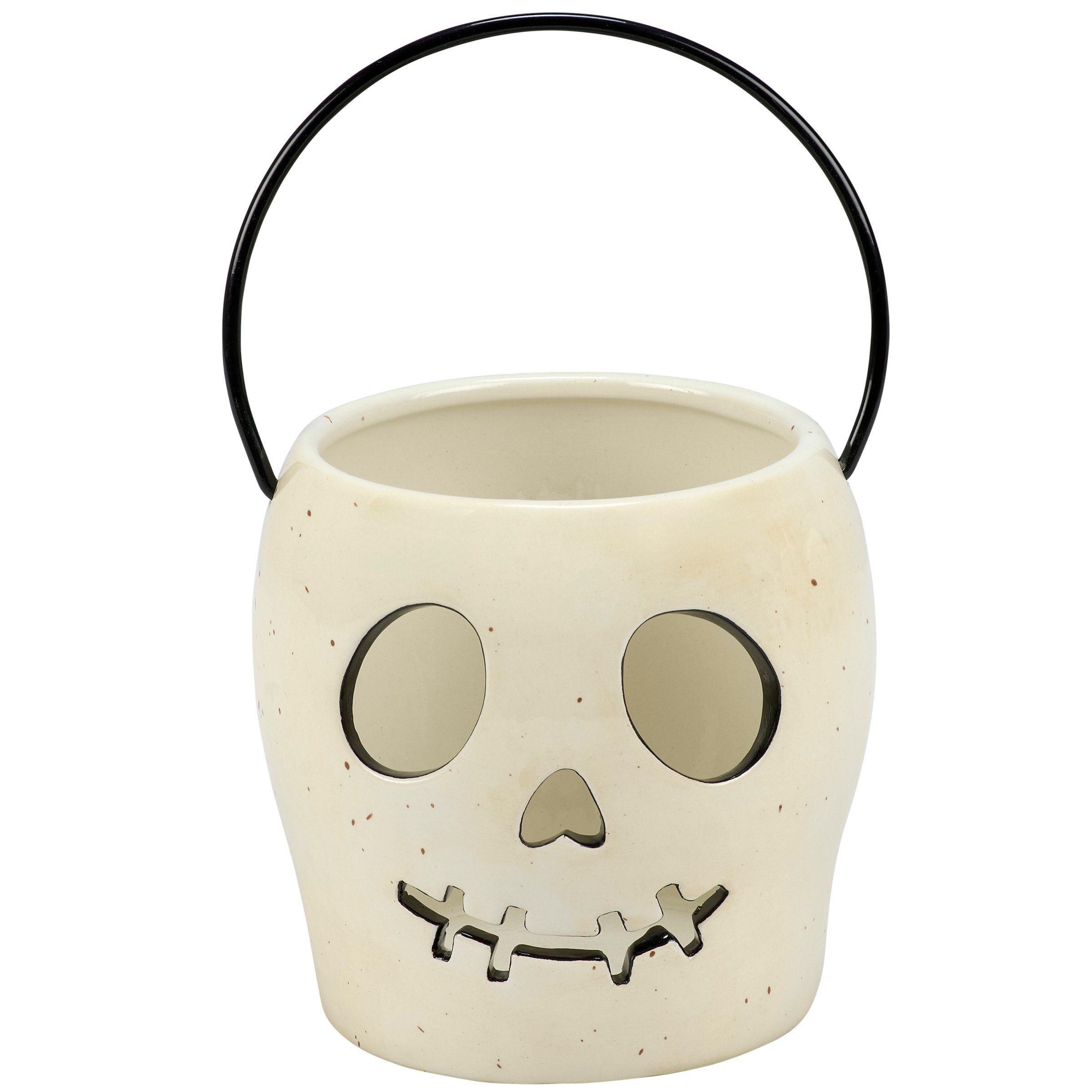 A ceramic candle holder that coordinates well with décor from our Halloween Collection. Seasonal candle holder features a fun skeleton head lantern design with an opening on the top to place a single candle inside and illuminate face cutouts. Our Skeleton Head candle holder fits a votive candle and can free-stand on flat surface for display. Candle pictured not included. A fun Halloween home accent perfect for adding natural lighting to any space.