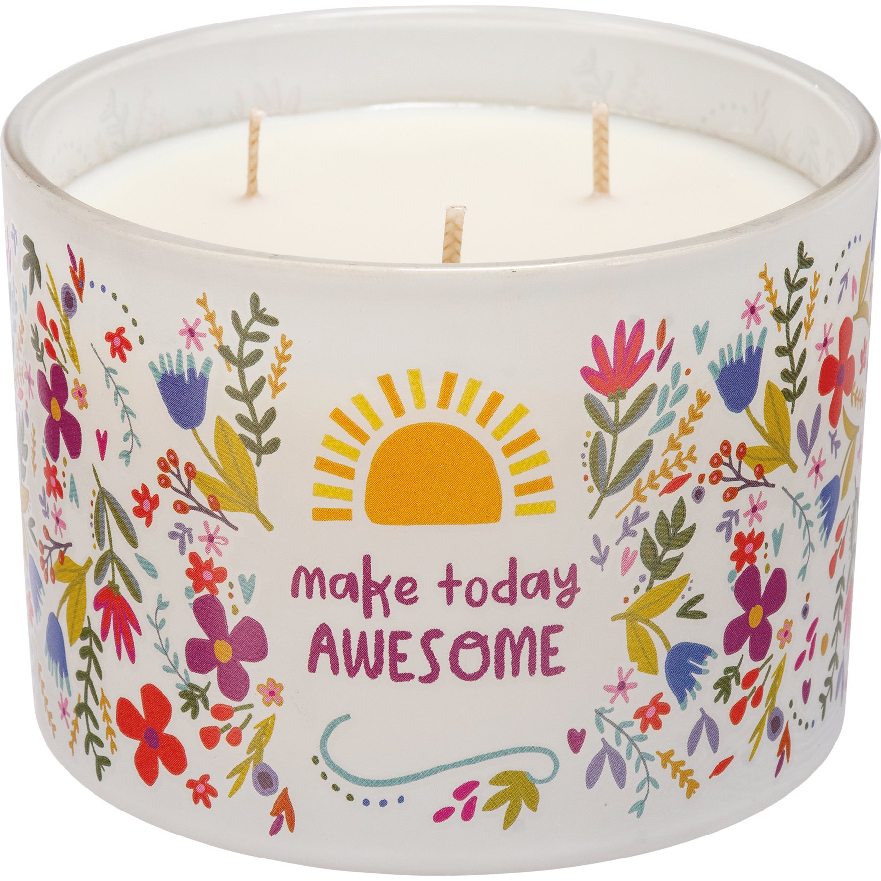 A frosted glass vessel holds this soy-based wax candle featuring a refreshing vanilla scent, an inspirational "Make Today Awesome" sentiment, and vibrant sun and floral designs. This 14 oz. candle makes a perfect gift. Our Today Awesome jar candle contains three fabric wicks for a total of 30 hours of burn time. Includes a plastic wax cover for protection and a polished look.