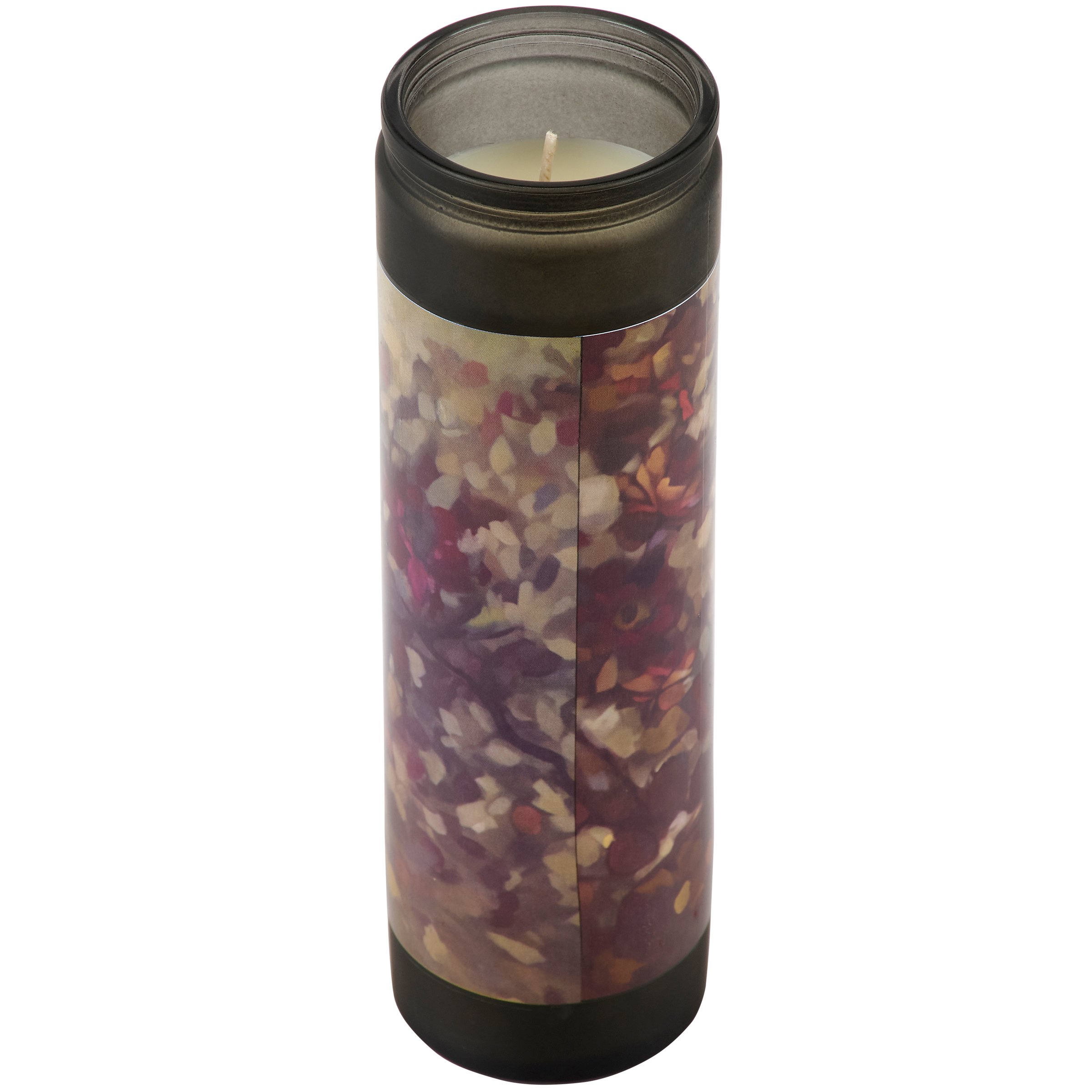 A tall candle from our Halloween Collection featuring a full wrap-around design on frosted black glass displaying moody art of a raven inspired by dark academia decor. Raven design is replicated from original artwork hand painted in a unique textured style. This Halloween candle features soy-based wax and a fabric wick with 80 hours of burn time activating a warm Sandalwood Spice scent. Our Night Raven candle includes a dust cover and plastic lid for protection and enhanced appearance on store displays. A moody Halloween home accent that easily adds natural lighting and seasonal style to any home or work space.