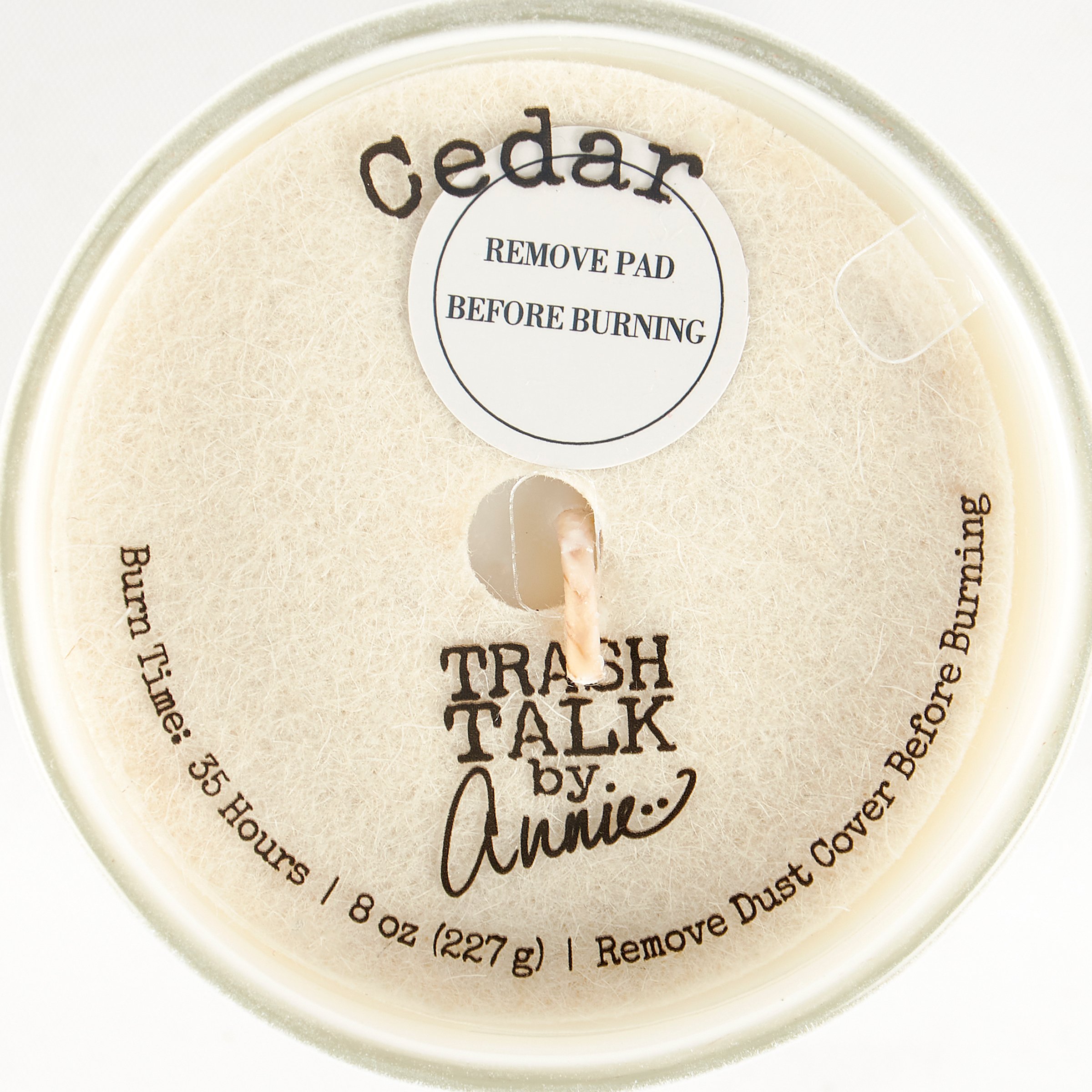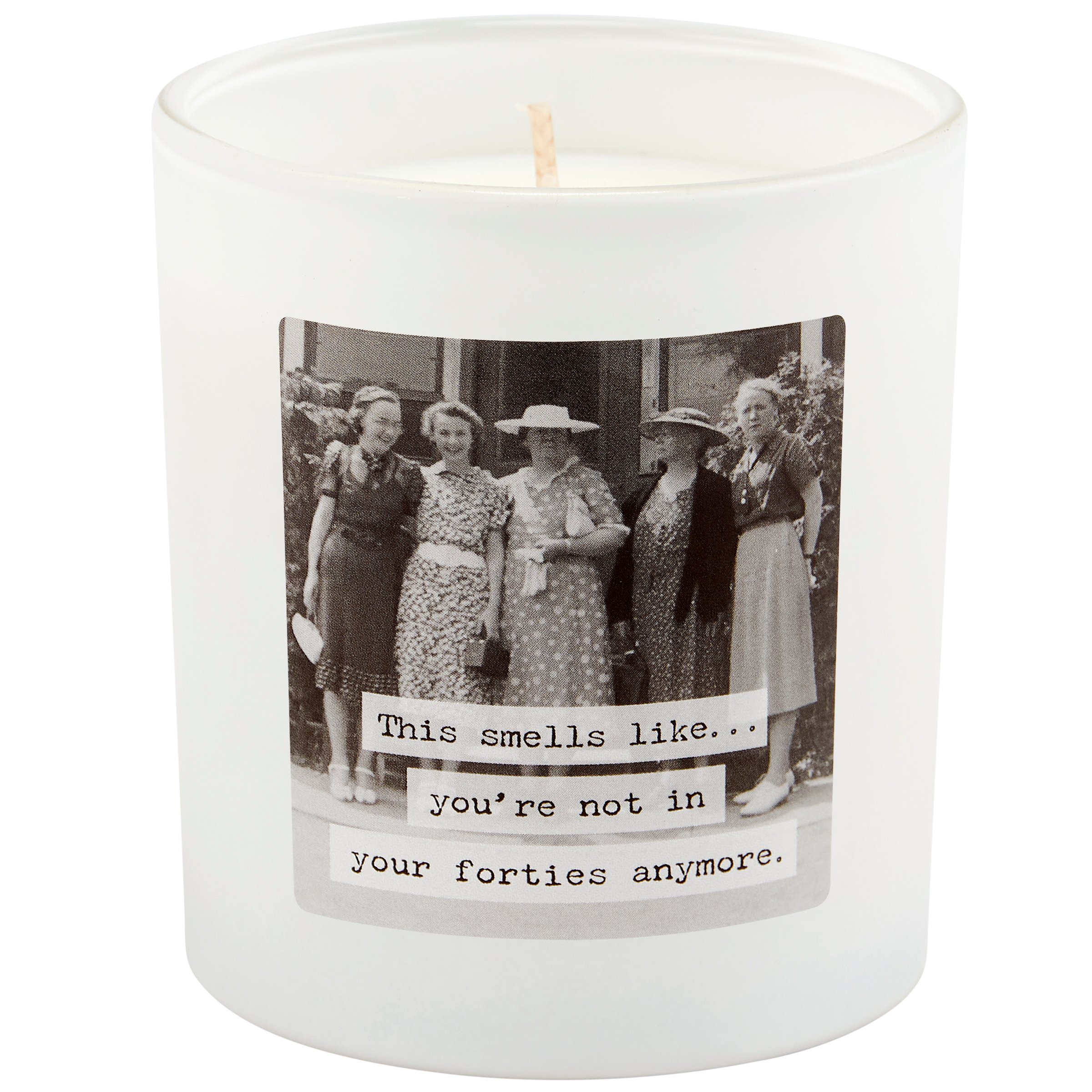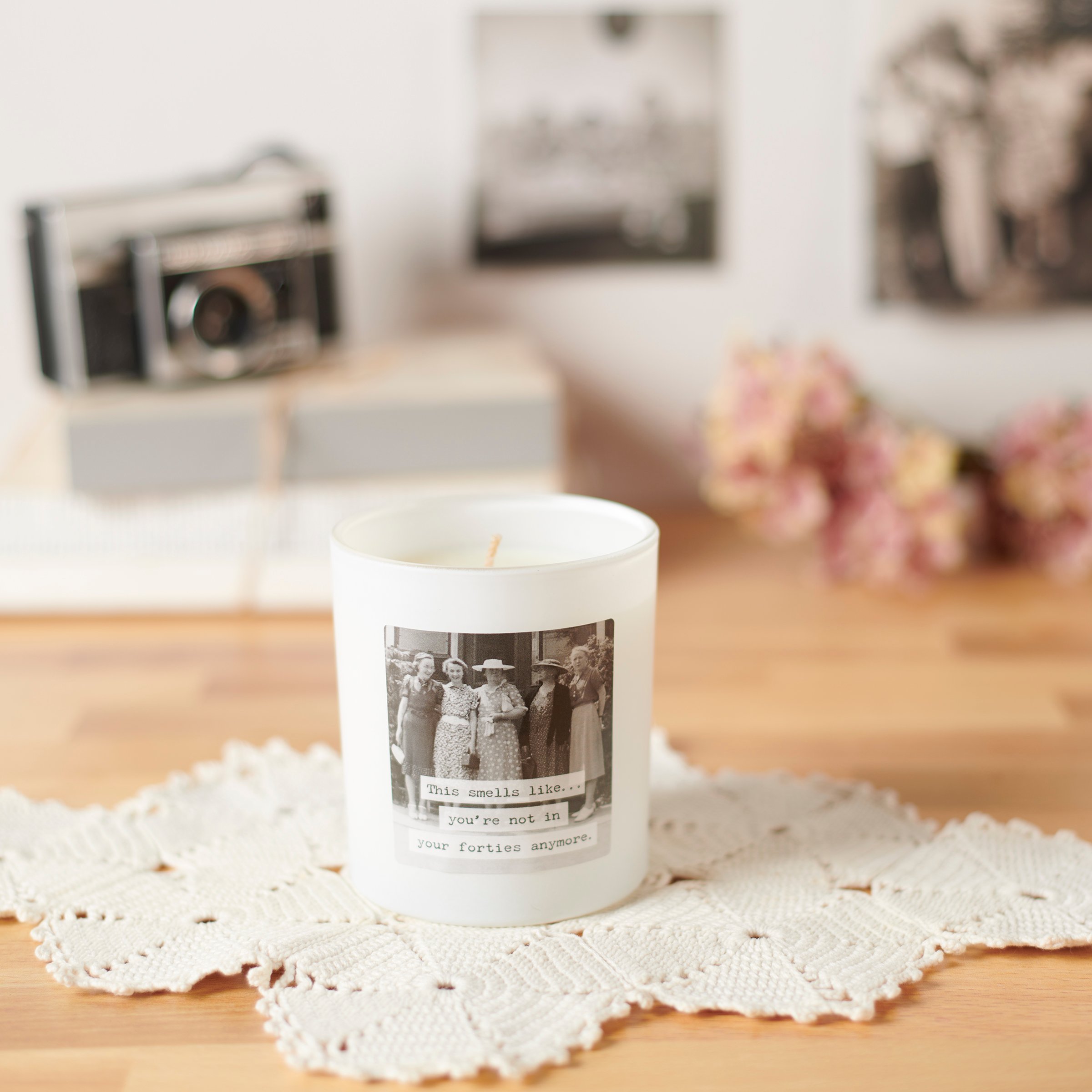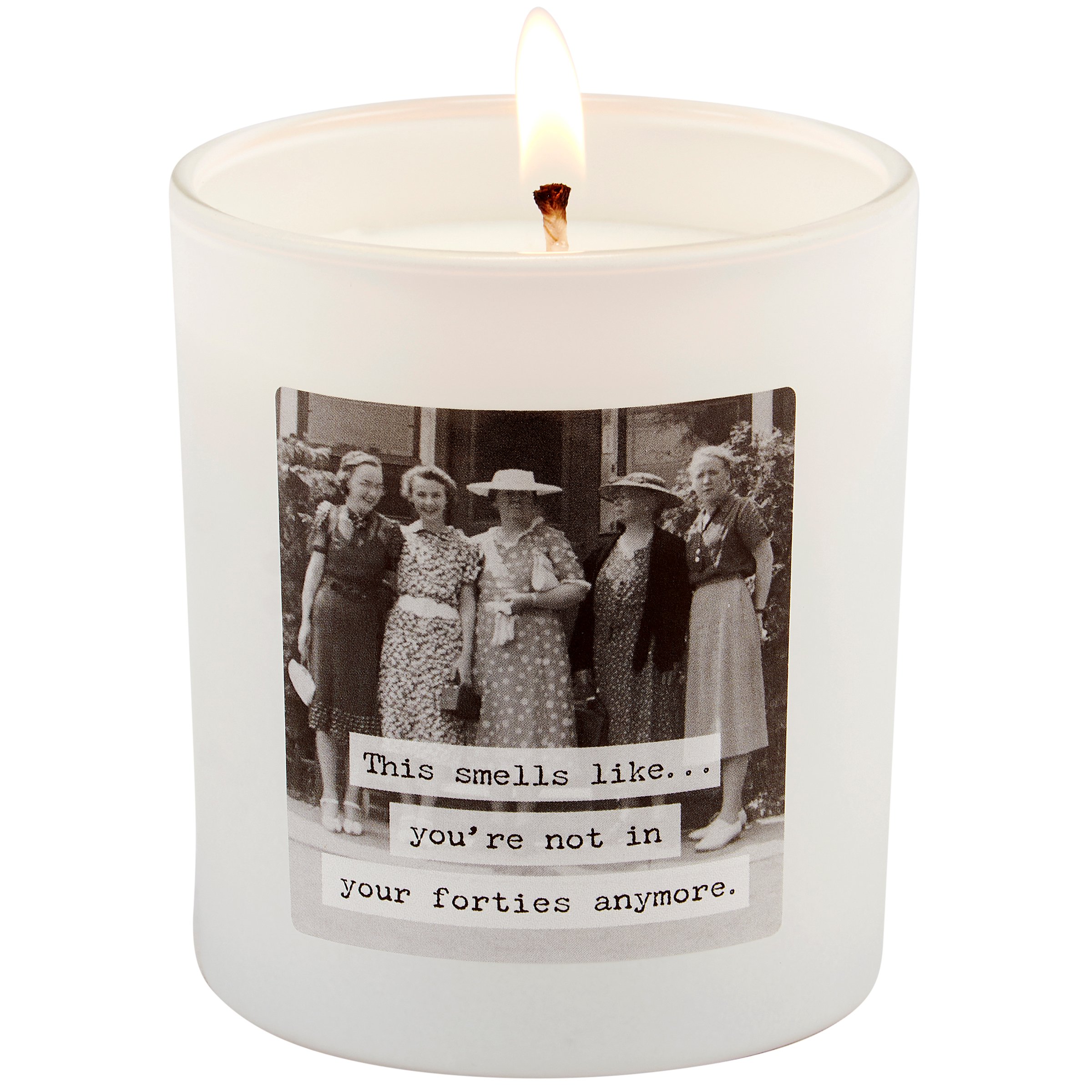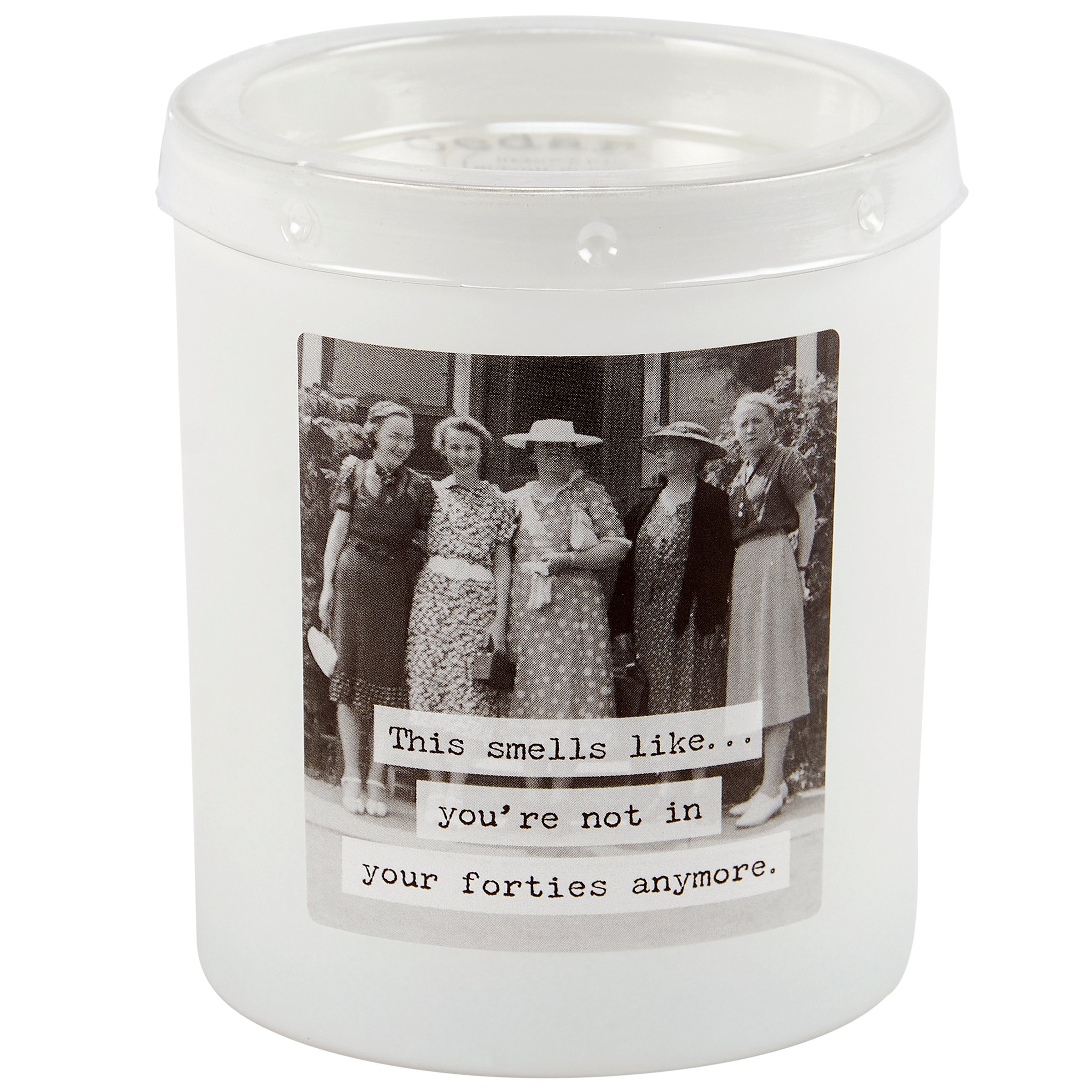 A candle from our Trash Talk By Annie Collection displaying a double-sided design of a vintage black and white photograph on frosted white glass complemented with a humorous sentiment that reads "This Smells Like... You're Not In Your Forties Anymore." Candle features soy-based wax and a cotton wick with 35 hours of burn time activating a calming Cedar scent. Our Not In Your Forties candle includes a dust cover and plastic lid for protection and polished appearance. A hilarious home accent that is great for everyday gifting.