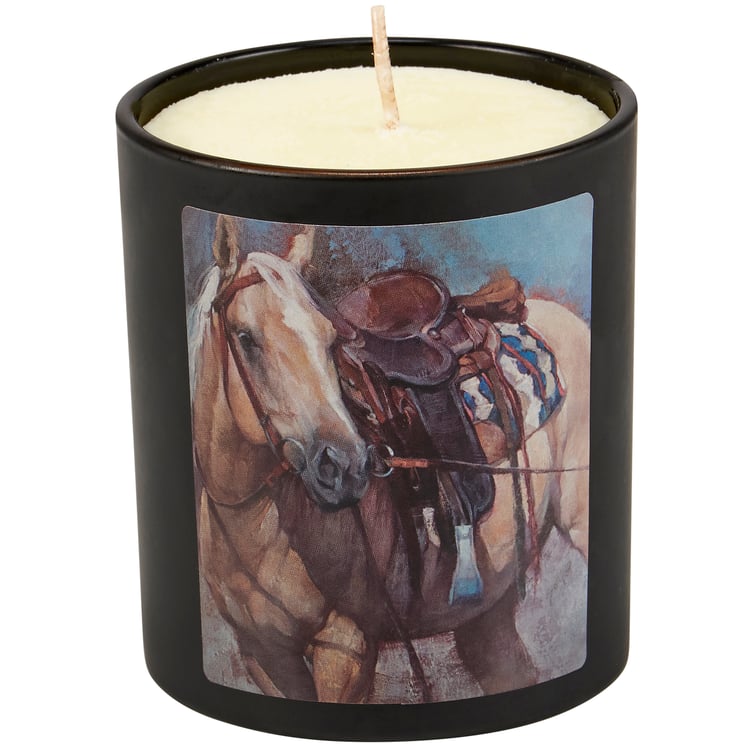 A jar candle from our Western Collection displaying a double-sided design of a palomino horse wearing a saddle that coordinates well with western home décor. Design is replicated from original hand painted artwork for added texture. Candle features soy-based wax and cotton wick with 35 hours of burn time activating a refreshing Sandalwood scent. Our Palomino jar candle includes a dust cover and plastic lid for protection and polished appearance. A western-themed home accent that is great for gifting.