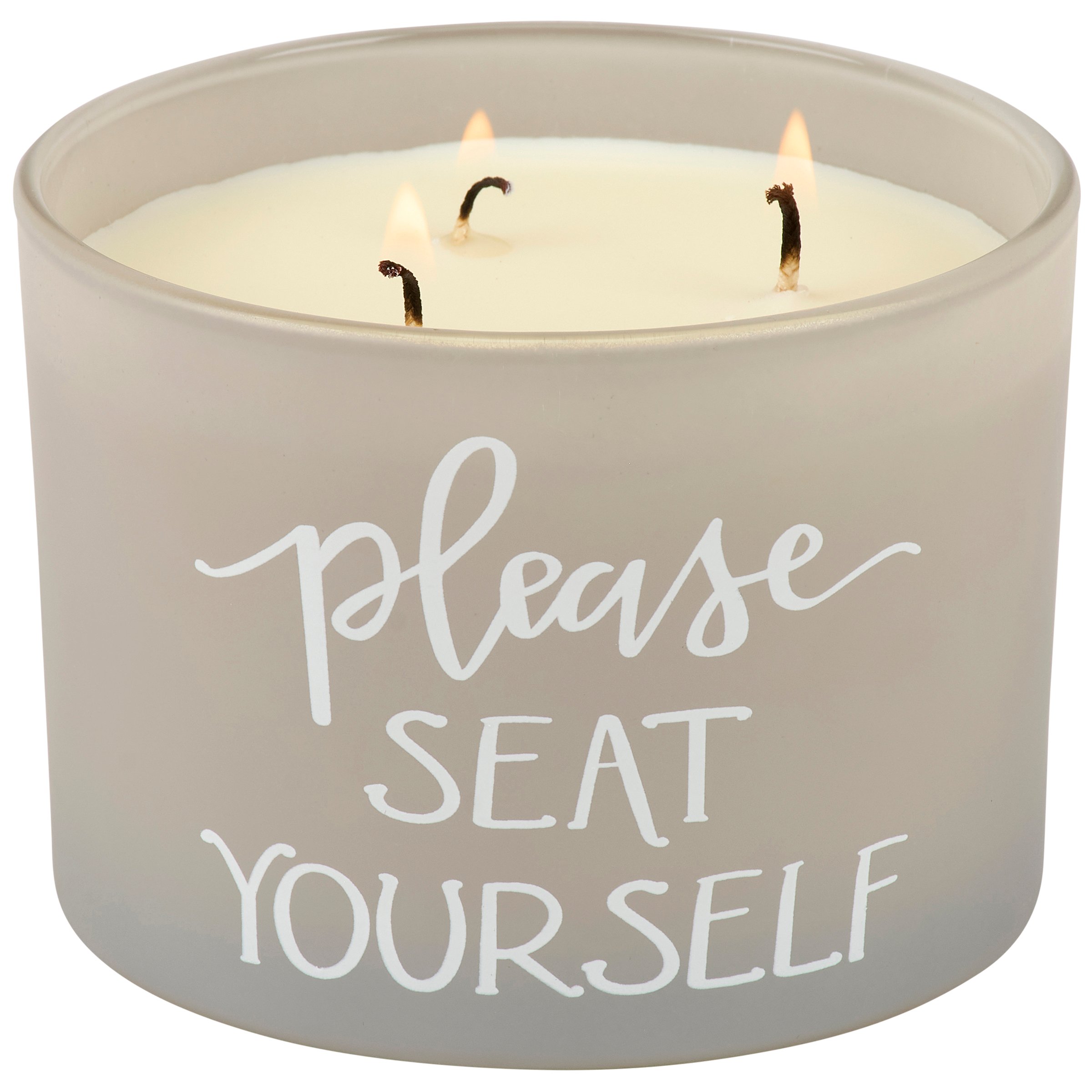 A candle from our Hand Illustrated Collection displaying a double-sided design of a funny bathroom inspired sentiment in an original hand illustrated style that reads "Please Seat Yourself." The sentiment style and neutral matte gray glass easily coordinates with a variety of bathroom decor. This funny bathroom candle features soy-based wax and 3 cotton wicks with 30 hours of burn time activating an invigorating Sea Salt & Sage scent. Our Please Seat Yourself candle includes a dust cover and plastic lid for protection and enhanced appearance on store displays. A fun gift perfect for adding personality to any bathroom.