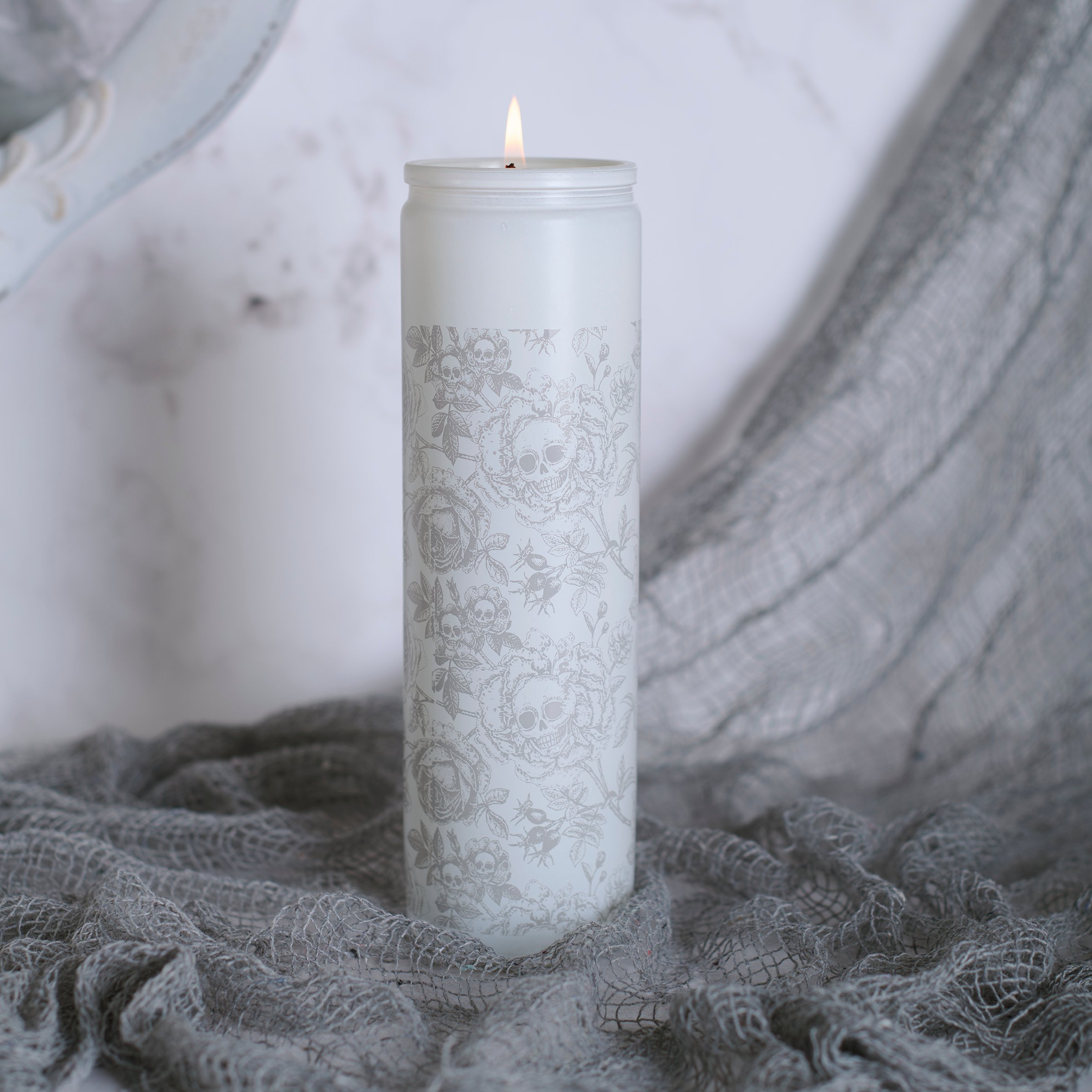 A candle from our Haunted White Collection displaying a full wrap-around design of skulls and roses on a tall opaque white glass jar. Rose skull design is in a spooky monochrome hand illustrated style. Seasonal candle features soy-based wax and a cotton wick with 80 hours of burn time activating a Rose scent. Our Rose Skull Flower candle includes a dust cover and plastic lid for protection and enhanced appearance on store displays. A moody Halloween home accent perfect for adding natural lighting to any living space.