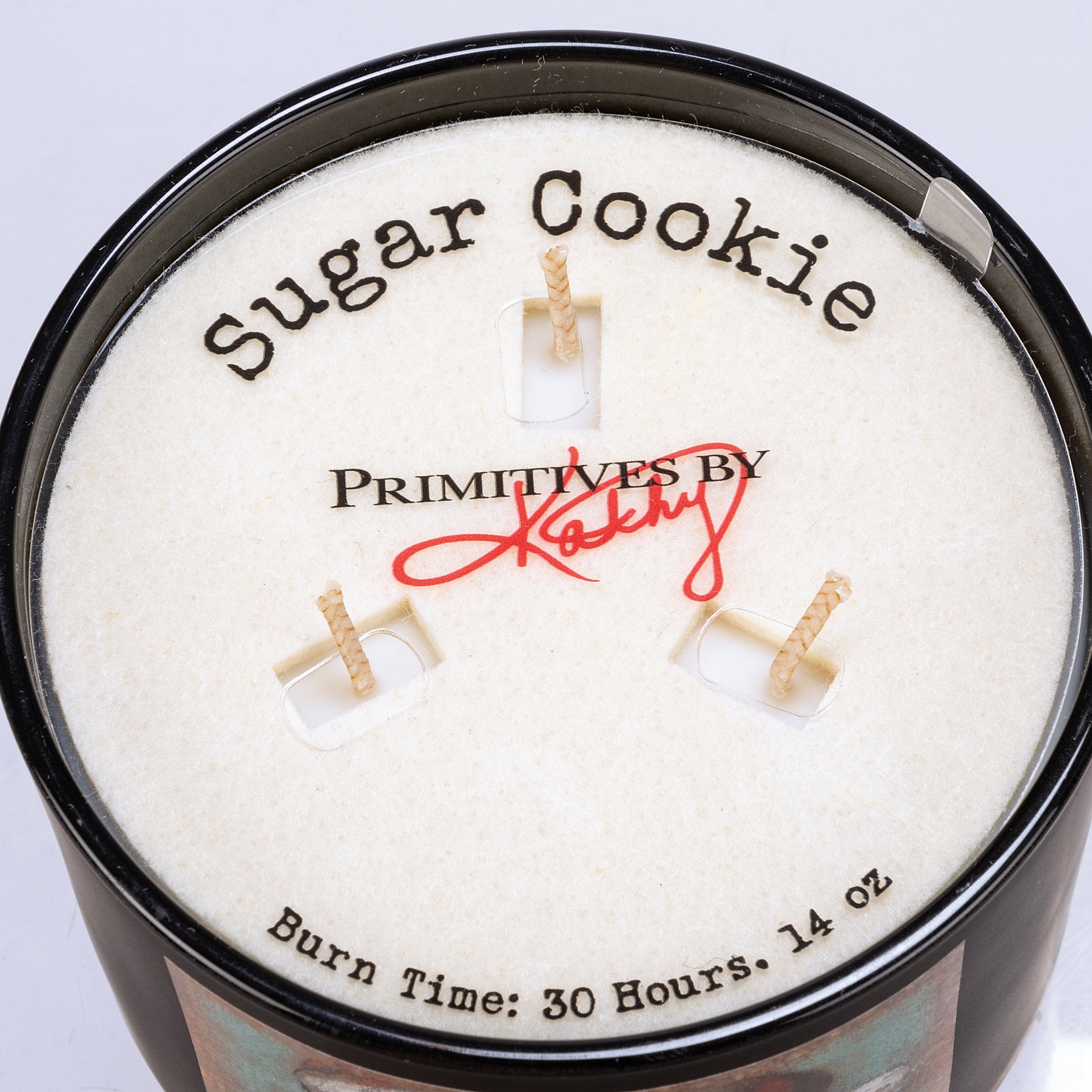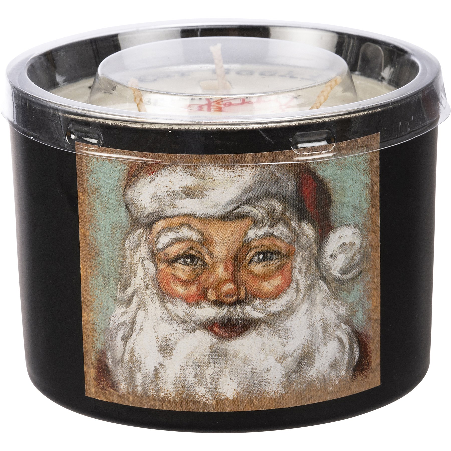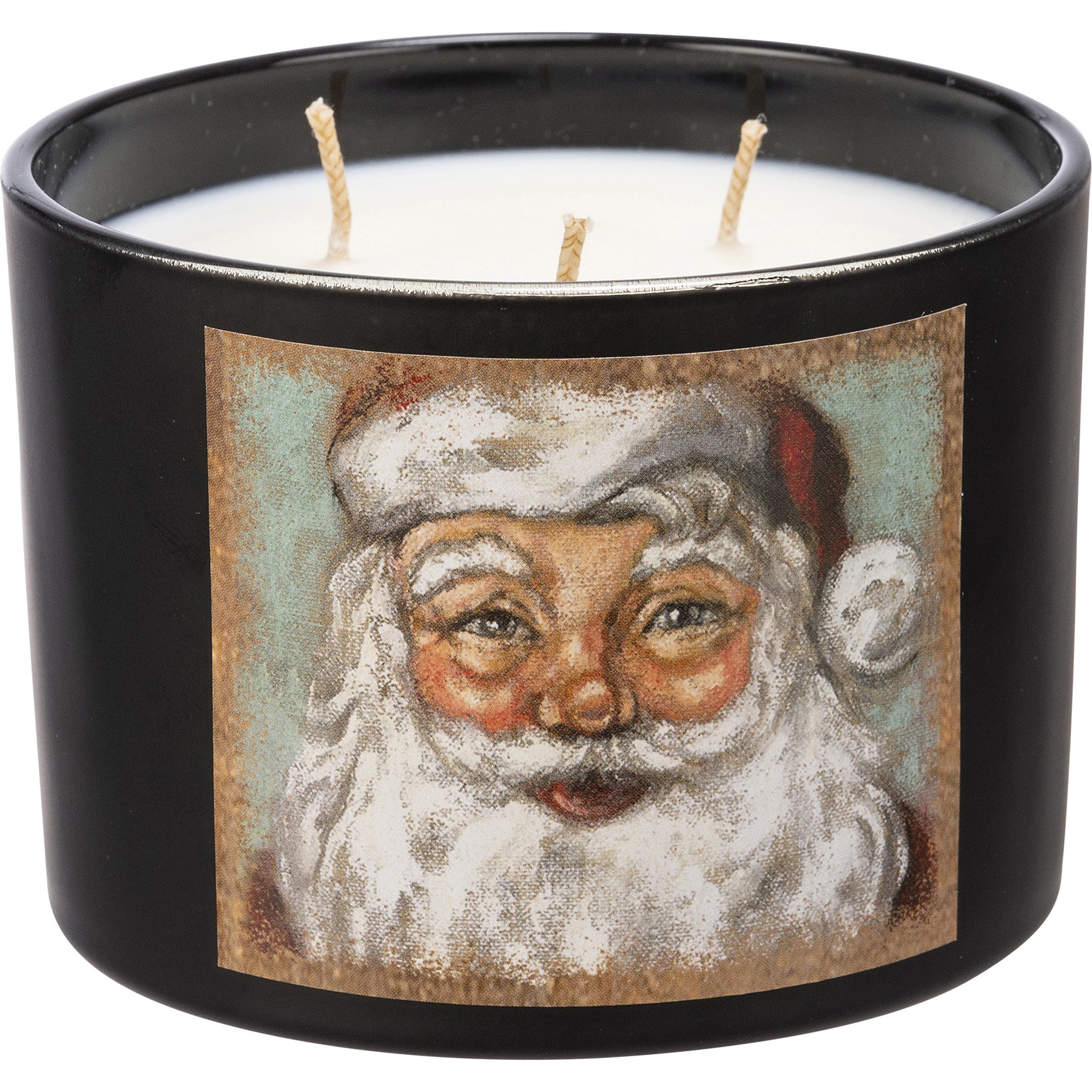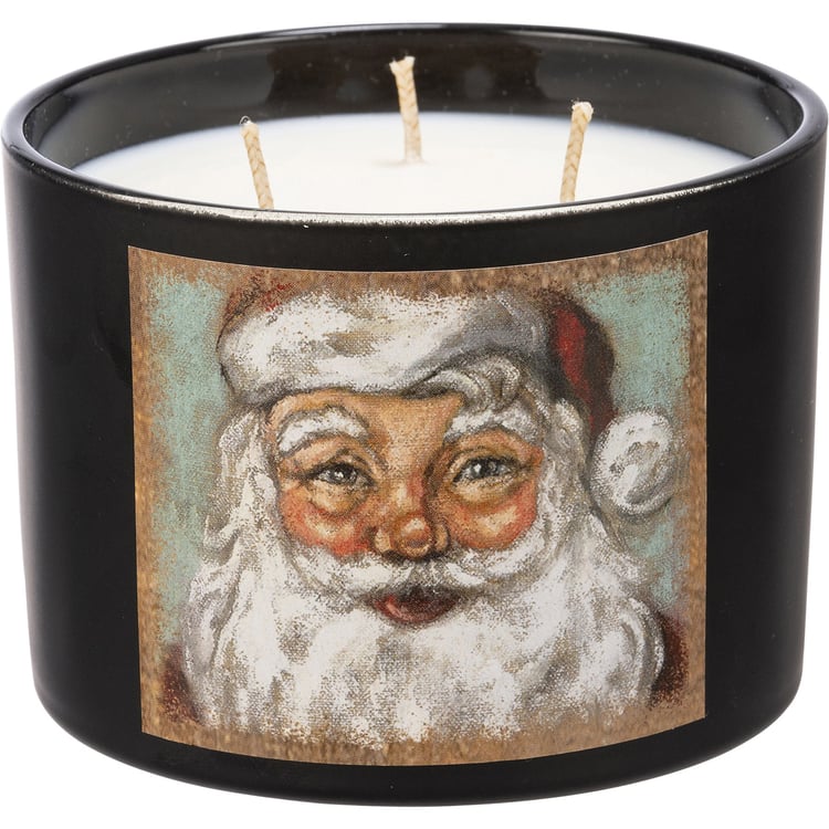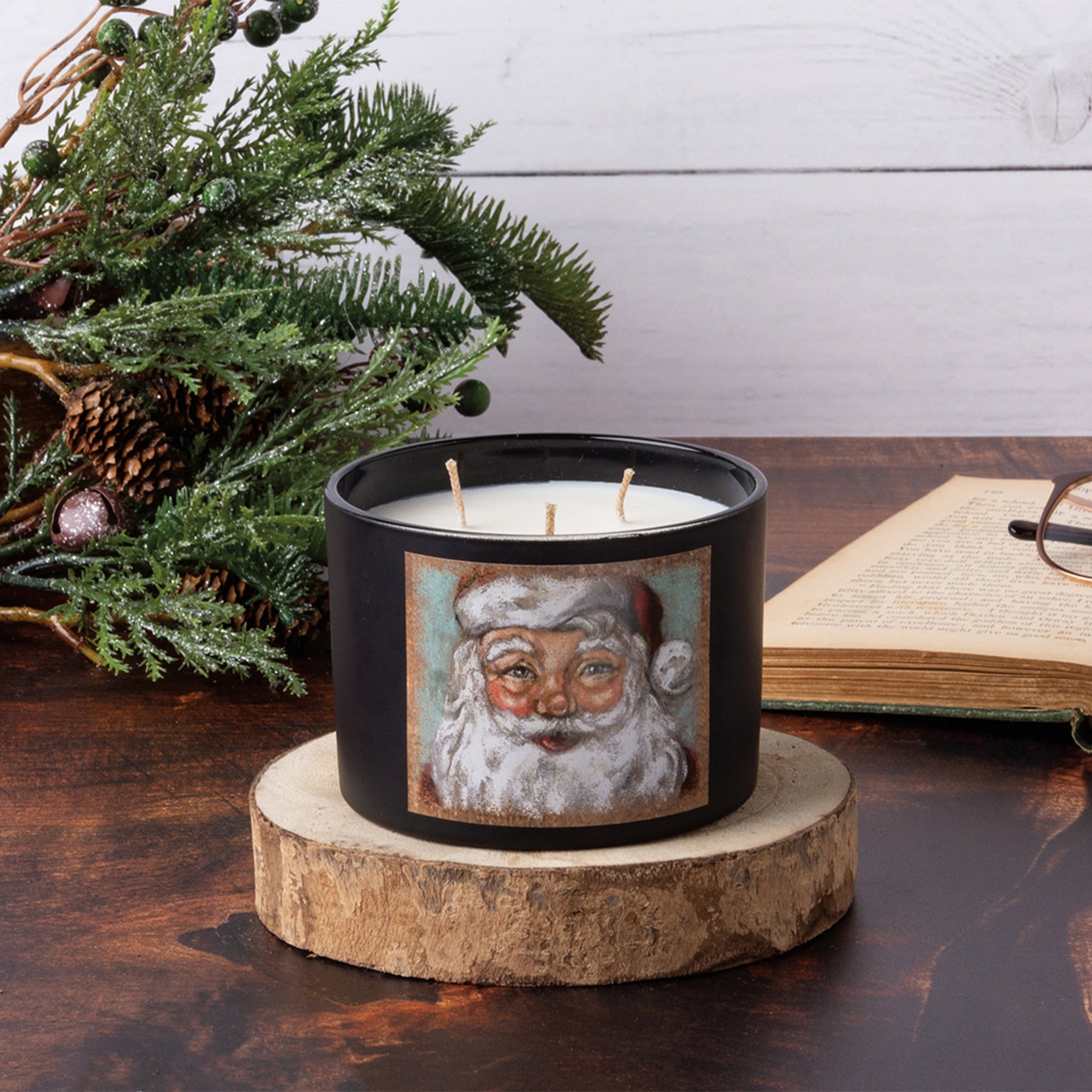 A matte black glass vessel holds this soy-based wax candle from our Christmas Collection which features a festive sugar cookie scent and double-sided holiday Santa design. Design is replicated from original artwork painted onto burlap canvas, giving the art a unique depth and texture. Our Santa candle contains three cotton wicks for a total of 30 hours of burn time. Includes a plastic wax cover for protection and a polished look.