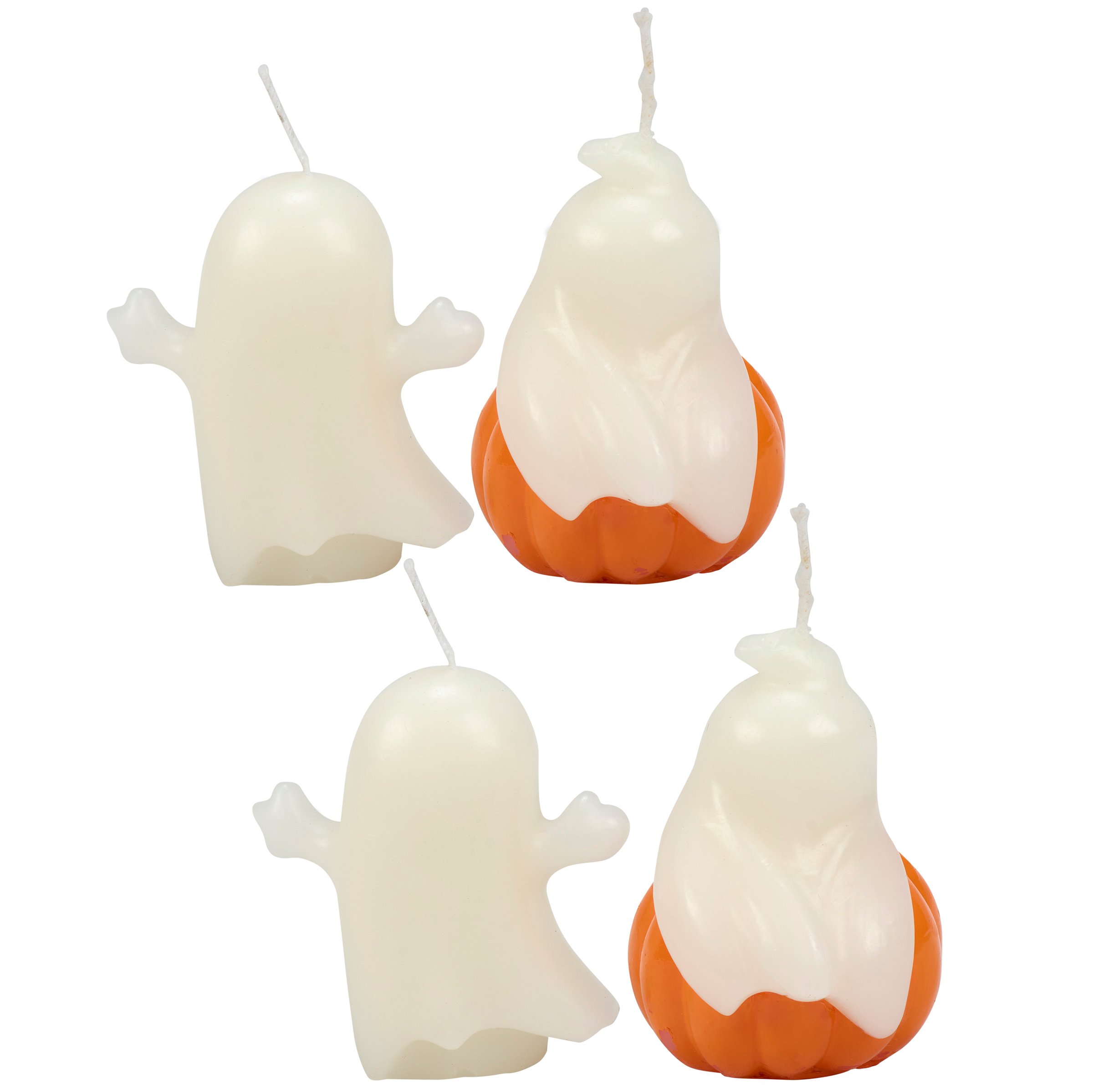 A set of 4 shaped candles from our Halloween Collection displaying fun ghost figure designs with colored details. Seasonal candle set includes 2 spooky sheet ghosts and 2 ghosts on top of a jack o'lantern. Our Ghosts candle set features ready-to-burn cotton wicks and each piece can free stand on flat surface for display. Candles are packaged in box with clear lid displaying candle designs for easy store display. A set of Halloween home accents perfect for adding fun lighting to any space.