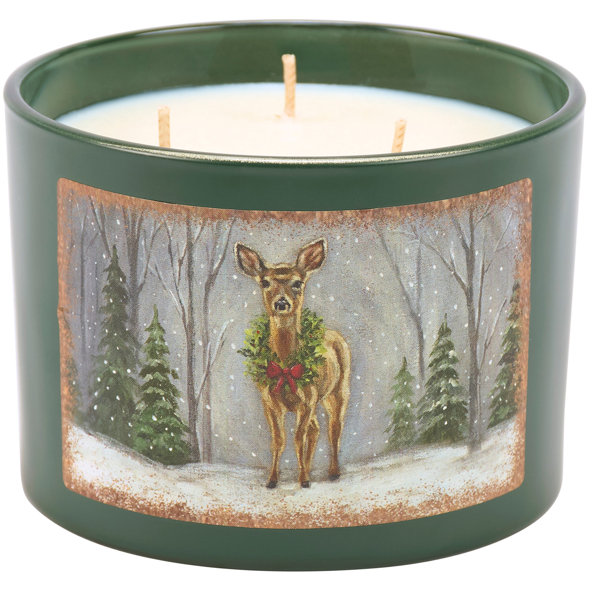A candle from our Christmas Collection displaying a double-sided design of a snowy winter scene with a deer wearing a Christmas wreath on frosted green glass. Deer design is replicated from original artwork painted onto burlap canvas, giving the art a unique depth and texture. Seasonal candle features soy-based wax and 3 fabric wicks with 30 hours of burn time activating a calming Spruce scent. Our Snowy Deer candle includes a dust cover and plastic lid for protection and enhanced appearance on store displays. A rustic Christmas gift perfect for a seasonal home accent.