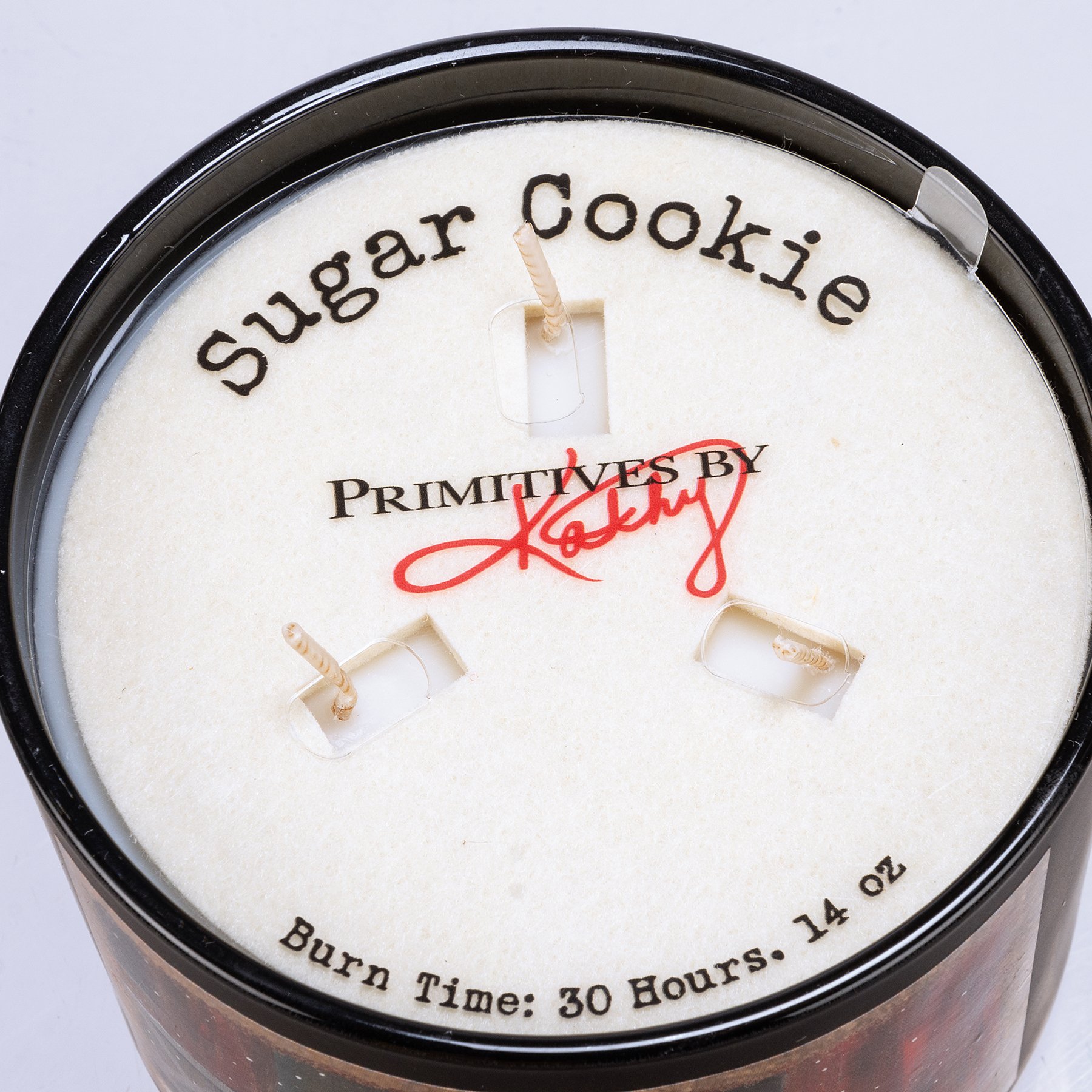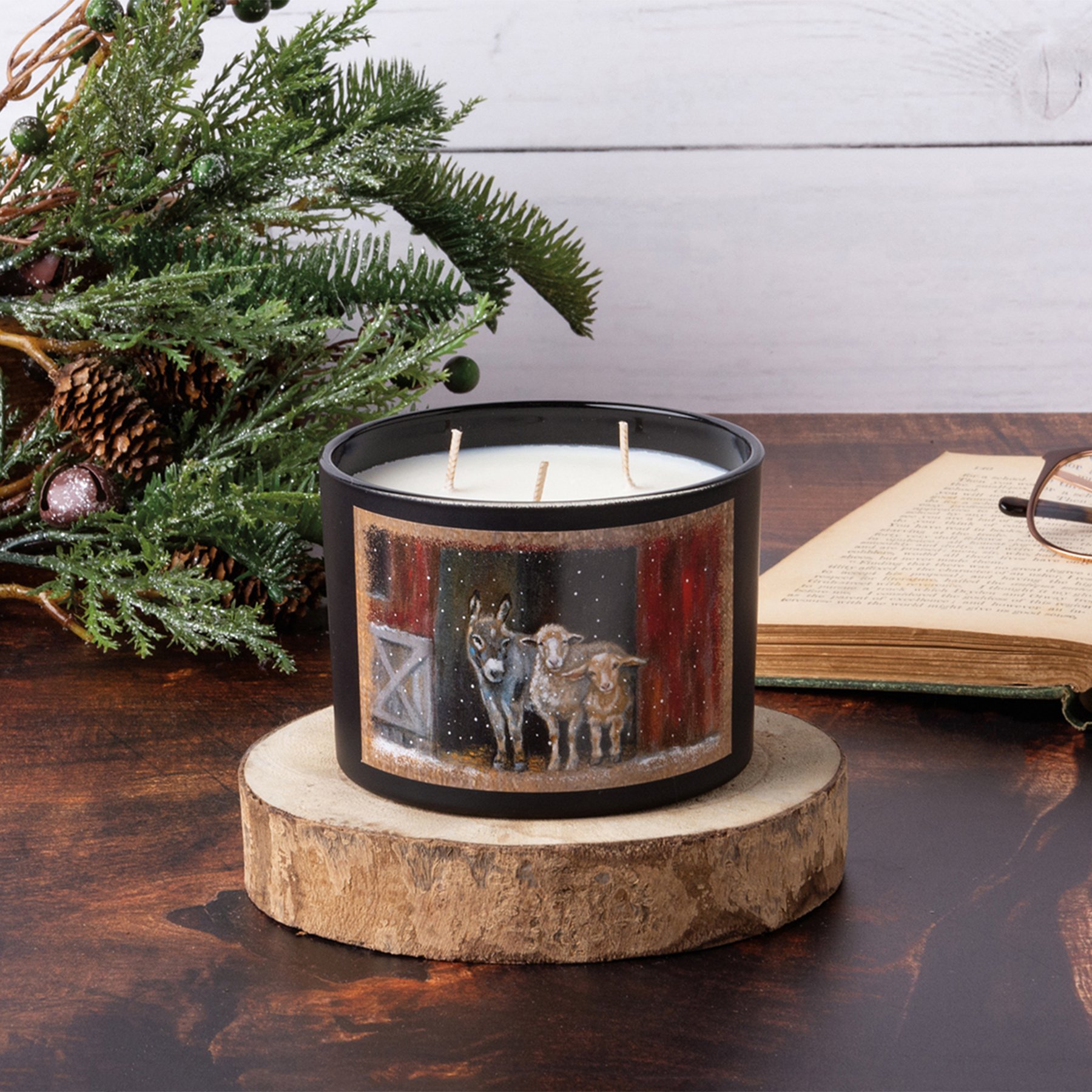 A matte black glass vessel holds this soy-based wax candle from our Christmas Collection which features a festive sugar cookie scent and double-sided holiday farm animal design. Design is replicated from original artwork painted onto burlap canvas, giving the art a unique depth and texture. Our Snowy Farm Family candle contains three cotton wicks for a total of 30 hours of burn time. Includes a plastic wax cover for protection and a polished look.