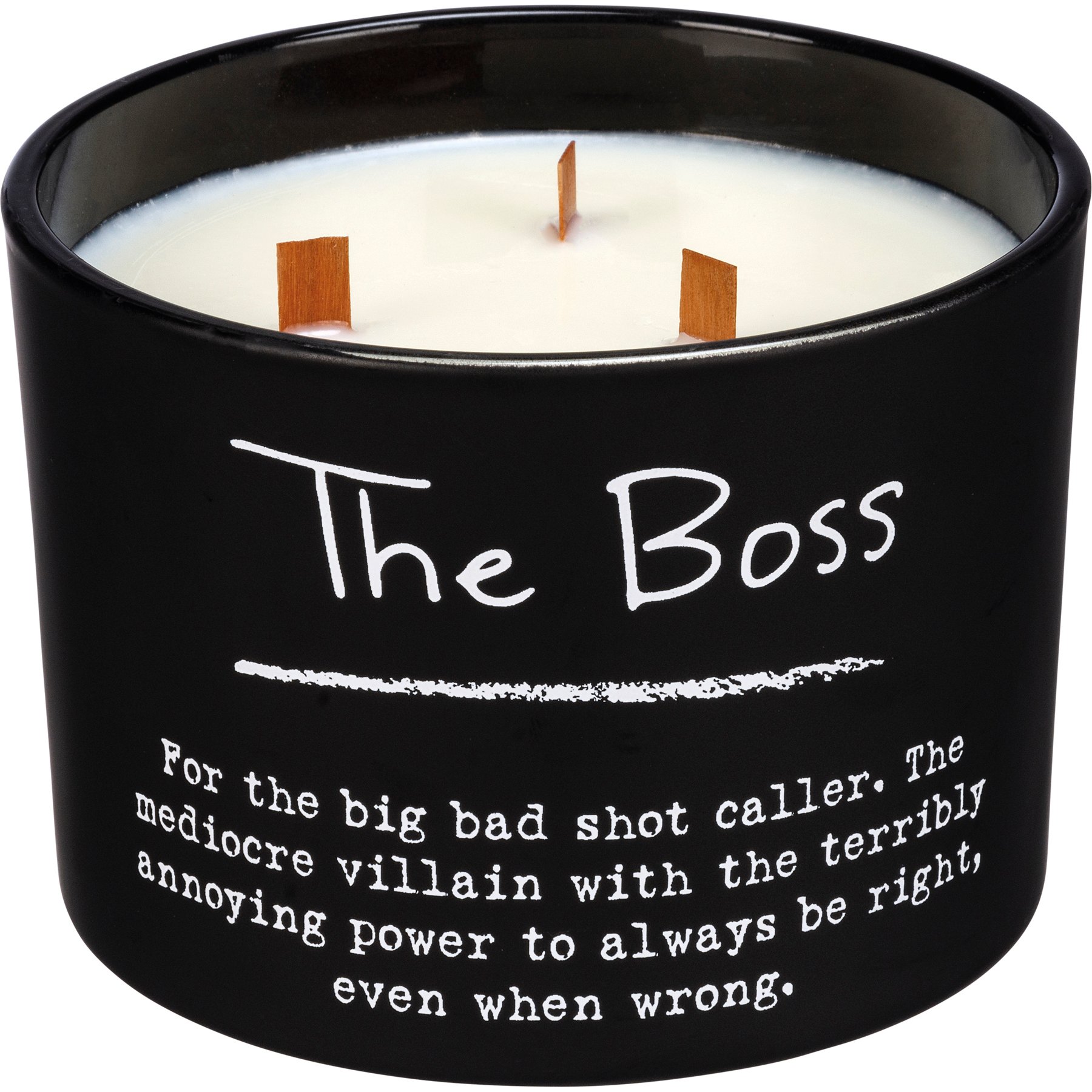 A matte black glass vessel holds this soy-based wax candle from oue Poetry Collection which features a refreshing lemongrass scent and "The Boss For The Big Bad Shot Caller. The Mediocre Villain With The Terribly Annoying Power To Always Be Right, Even When Wrong." sentiment. The smart sentiment on the front makes this item a perfect and easy gift that feels tailor-made for the boss(es) in your life. This Boss candle contains three wooden wicks for a total of 26 hours of burn time. Includes a plastic wax cover for protection and a polished look.