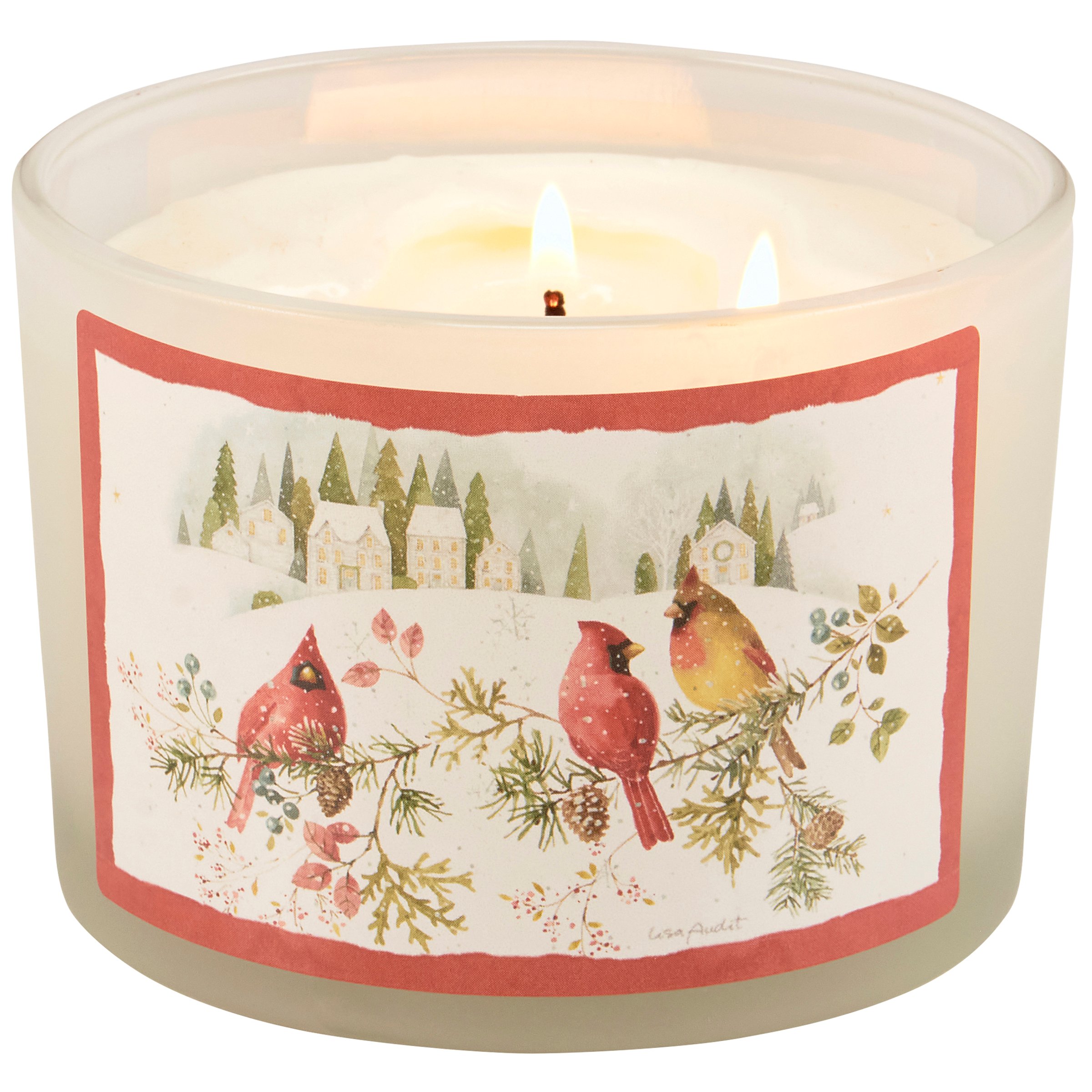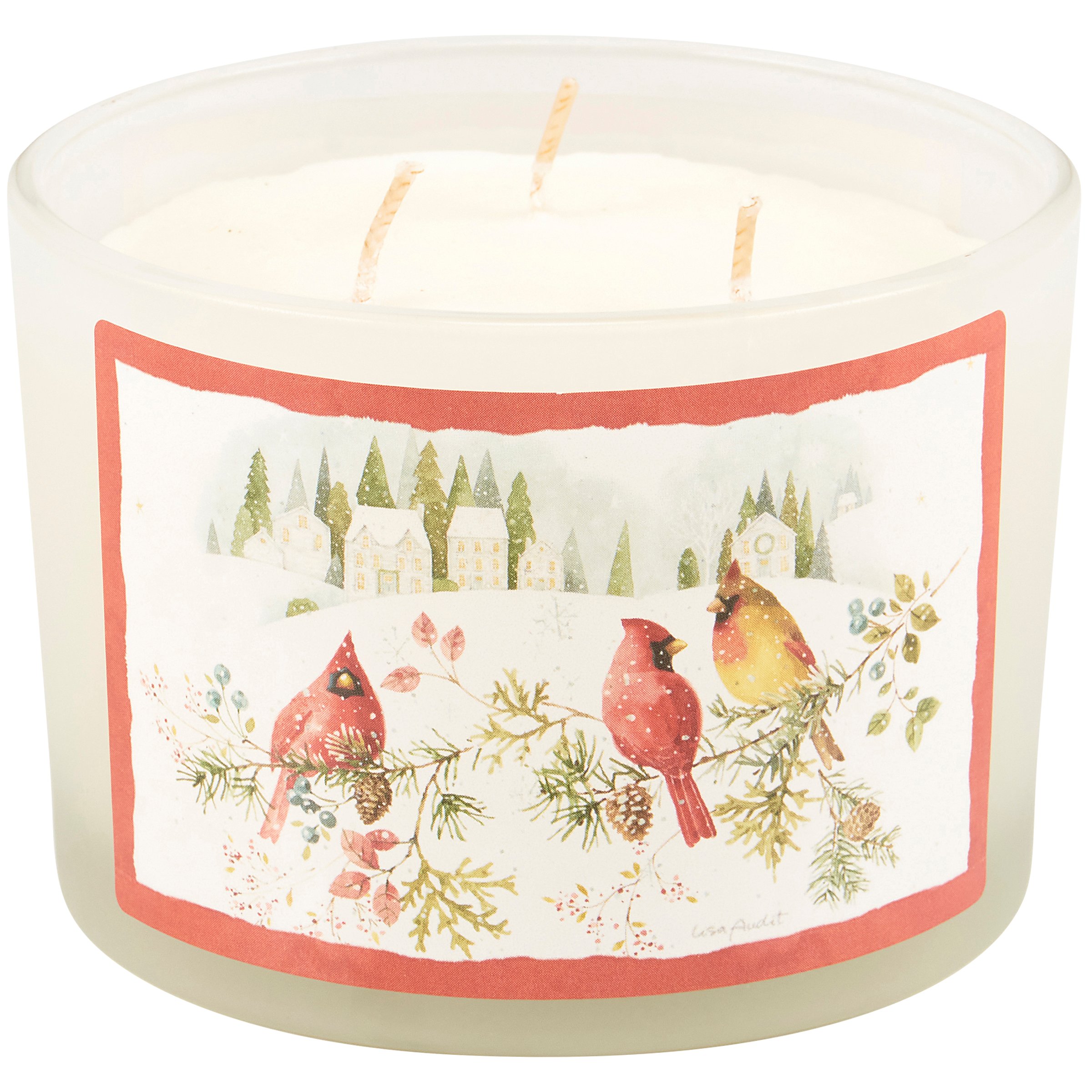 A jar candle from our Christmas Collection displaying a double-sided design of cardinals in a winter scene on frosted white glass. Design is replicated from original artwork hand painted in a delicate watercolor style. Seasonal candle features soy-based wax and 3 fabric wicks with 30 hours of burn time activating a Festive Spice scent. Our Winter Cardinal jar candle includes a dust cover and plastic lid for protection and polished appearance. A winter-themed home accent that is great for gifting.