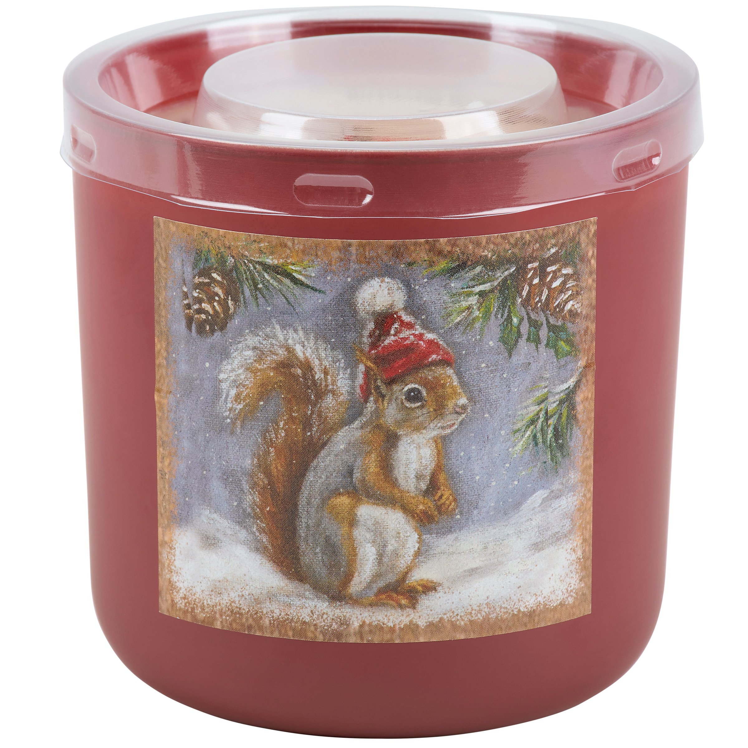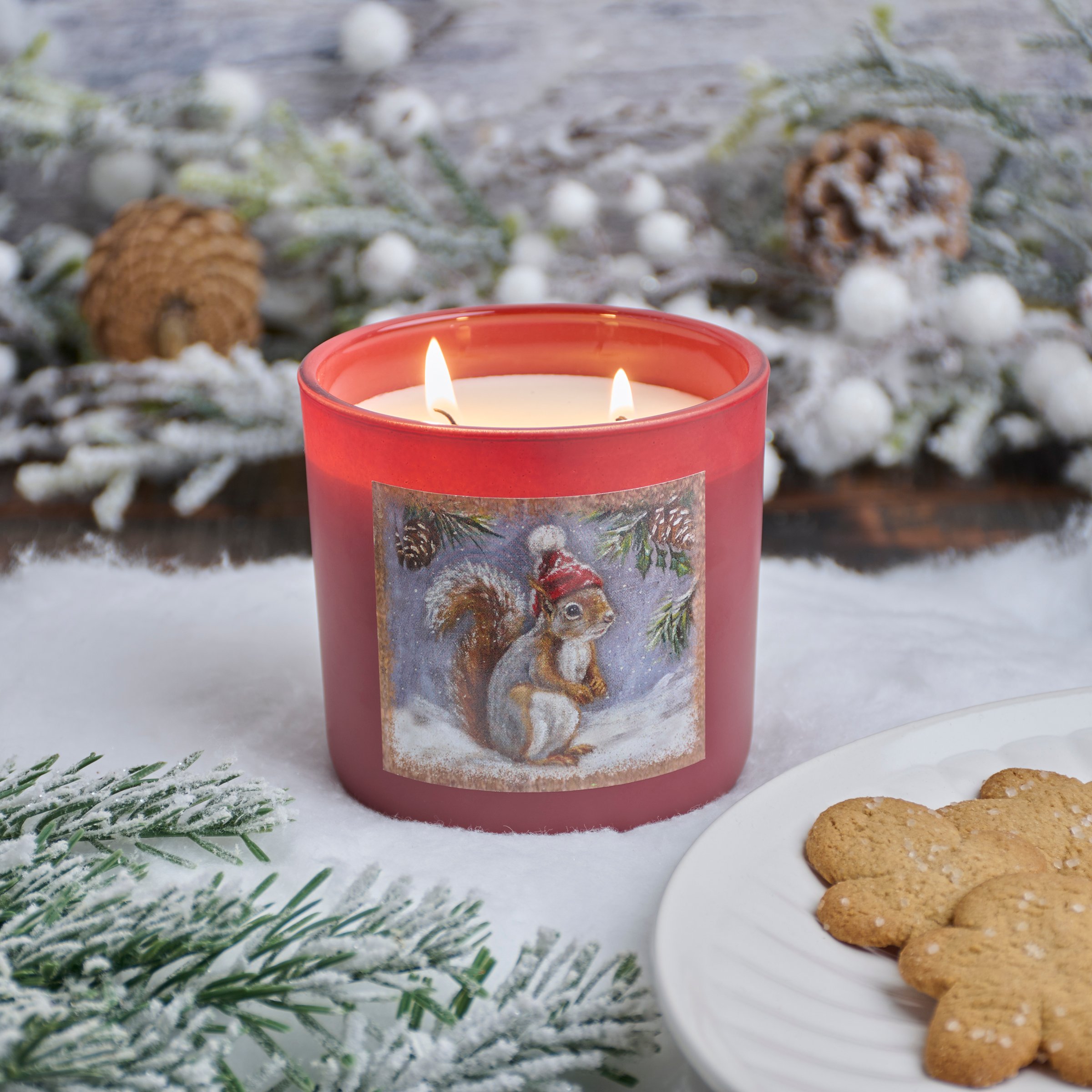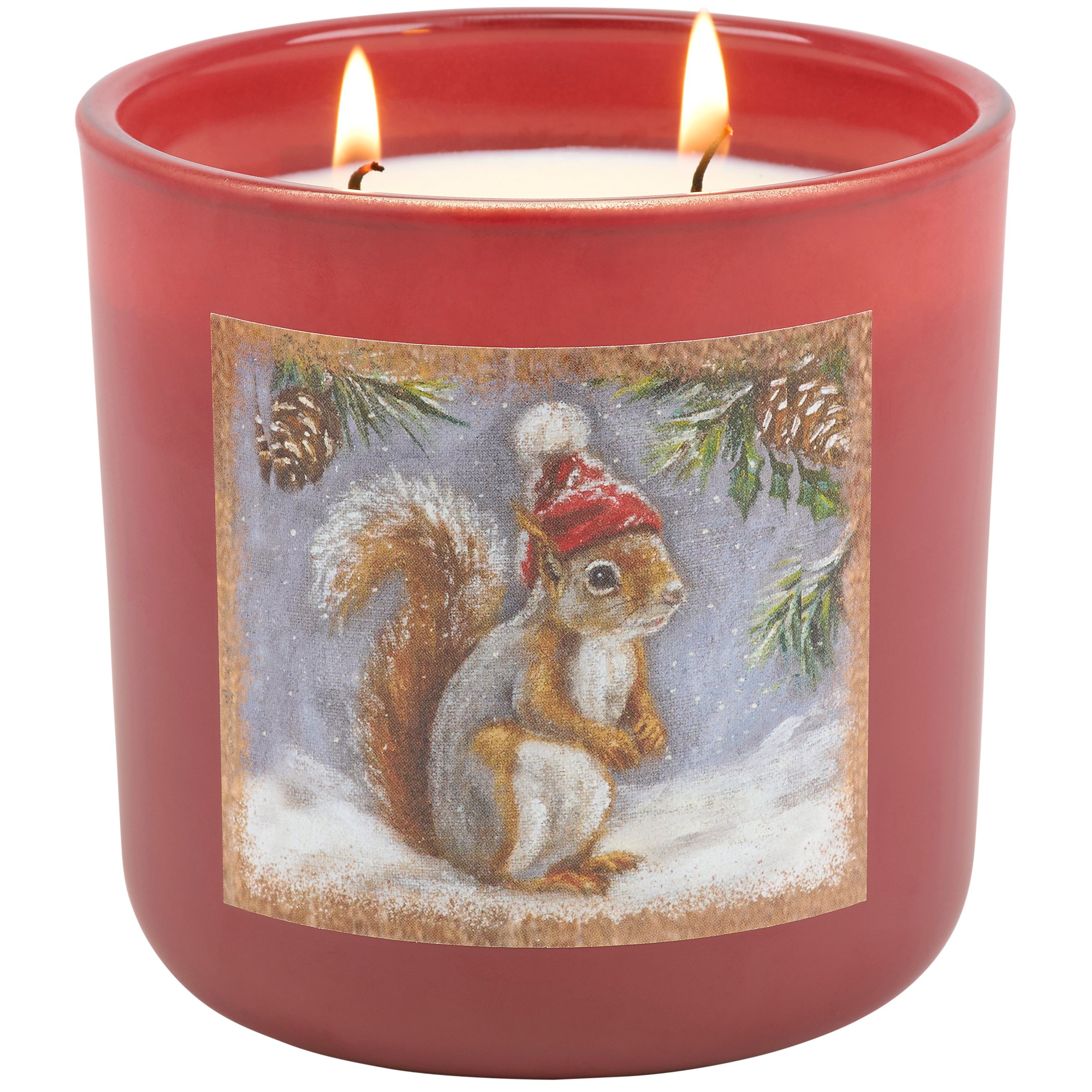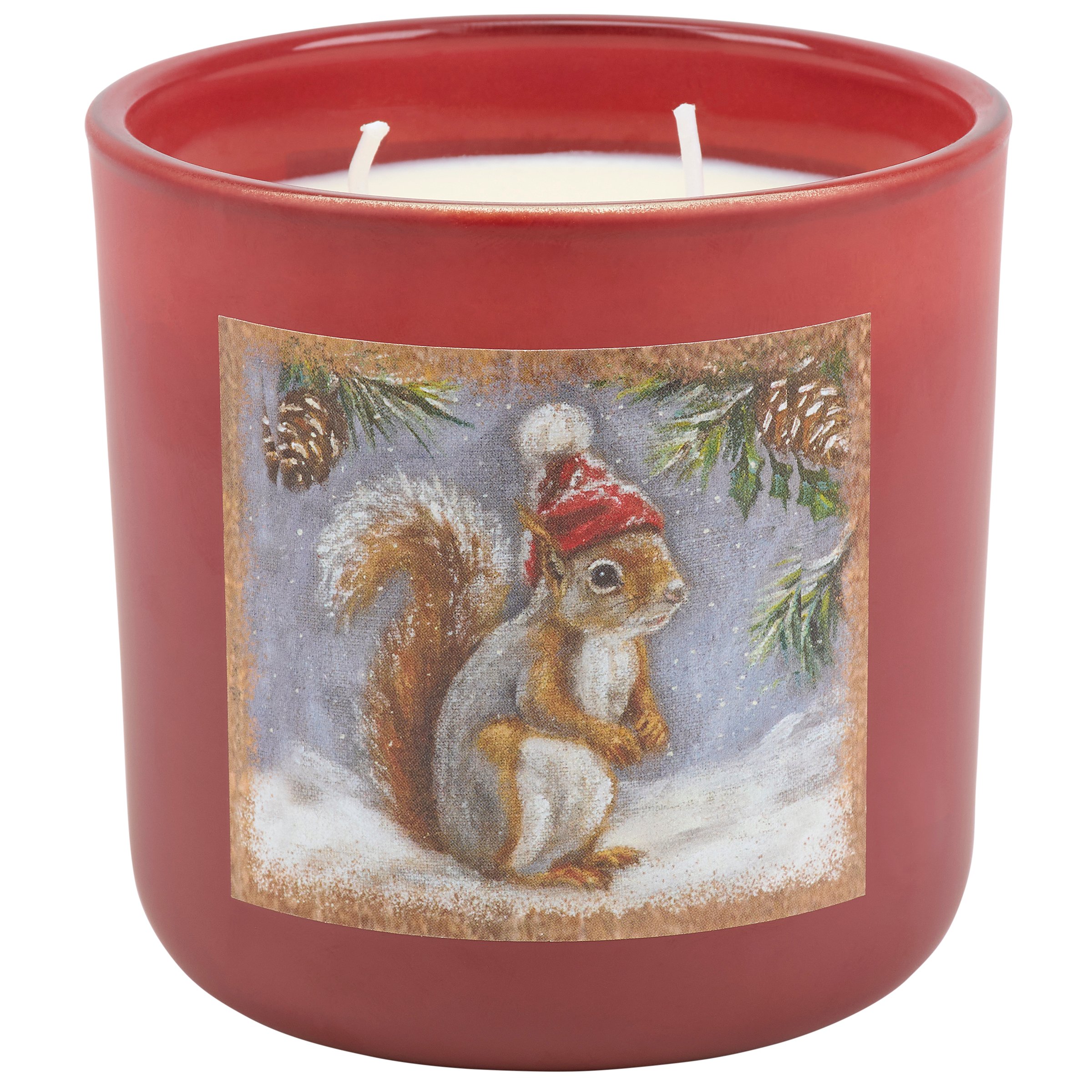 A candle from our Christmas Collection featuring a double-sided design on matte red glass displaying a charming winter scene of a squirrel wearing a winter hat. Winter squirrel design is replicated from original artwork painted onto burlap canvas, giving the art a unique depth and texture. This seasonal candle features soy-based wax and 2 fabric wicks with 50 hours of burn time activating an earthy Juniper scent. Our Winter Squirrel candle includes a dust cover and plastic lid for protection and enhanced appearance on store displays. A nature themed winter home accent that is great for gifting and easily adds natural lighting and seasonal style to any home or work space.