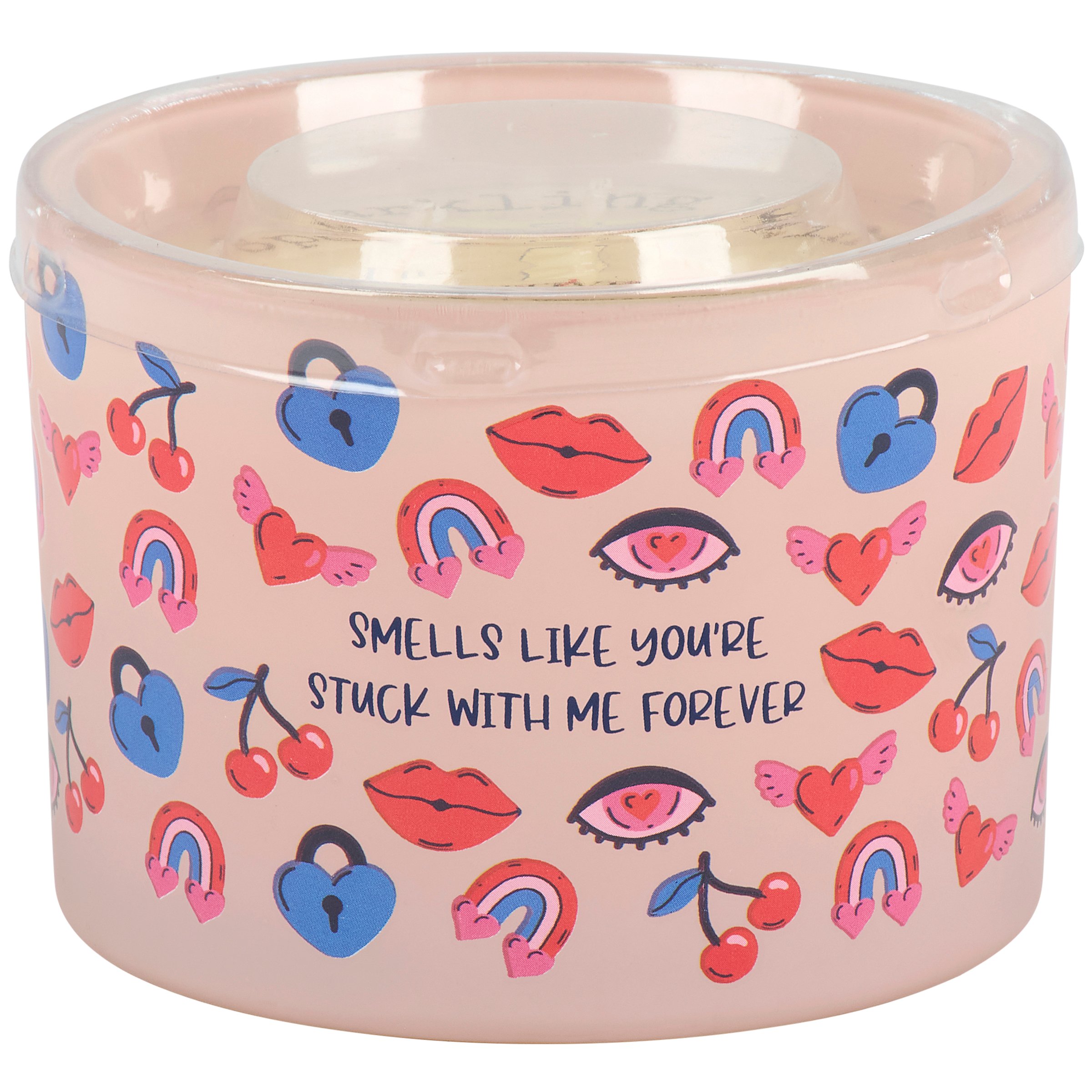 A candle from our Valentine's Day Collection featuring a full wrap-around design displaying a toss pattern of fun love themed icons on light pink frosted glass with a sassy love inspired sentiment that reads "Smells Like You're Stuck With Me Forever." This sassy candle features soy-based wax and 3 fabric wicks with 30 hours of burn time activating a fun Sparkling Wine scent. Our You're Stuck With Me Forever candle includes a dust cover and plastic lid for protection and enhanced appearance on store displays. A sassy home accent that is great for gifting to both friends and partners on Valentine's Day or as stylish love-themed decor in everyday moments.