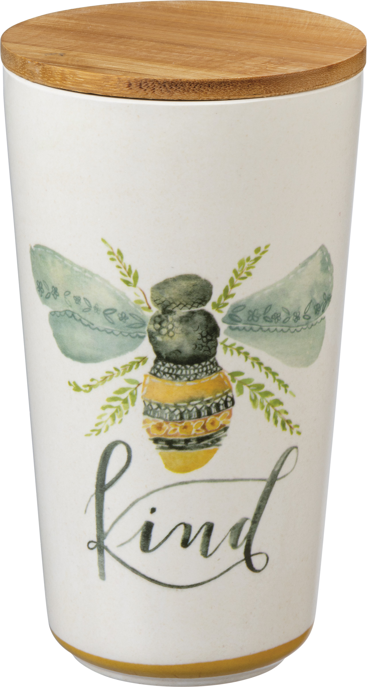 Perfect for spring, a set of three watercolor artwork canisters featuring wrap-around bumblebee designs, and varying "Humble," "Sweet," and "Kind" sentiments in a vibrant yellow and green palette. Complements well with coordinating pieces in collection for a cohesive table display. Hand wash recommended or top rack in dishwasher; not microwave safe. Made with bamboo fiber, melamine, and corn powder. BPA-free.