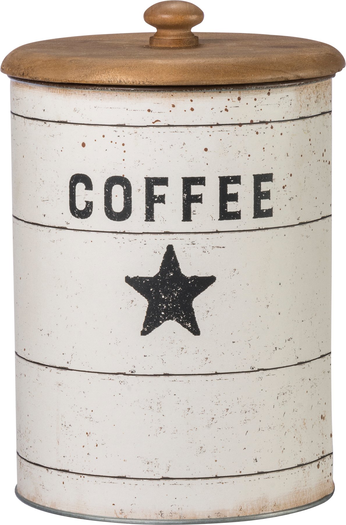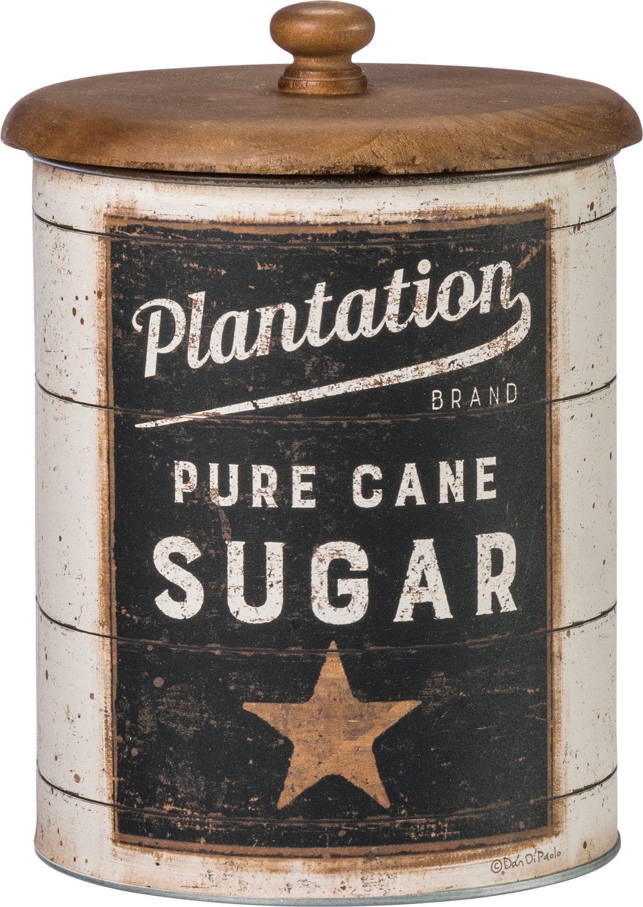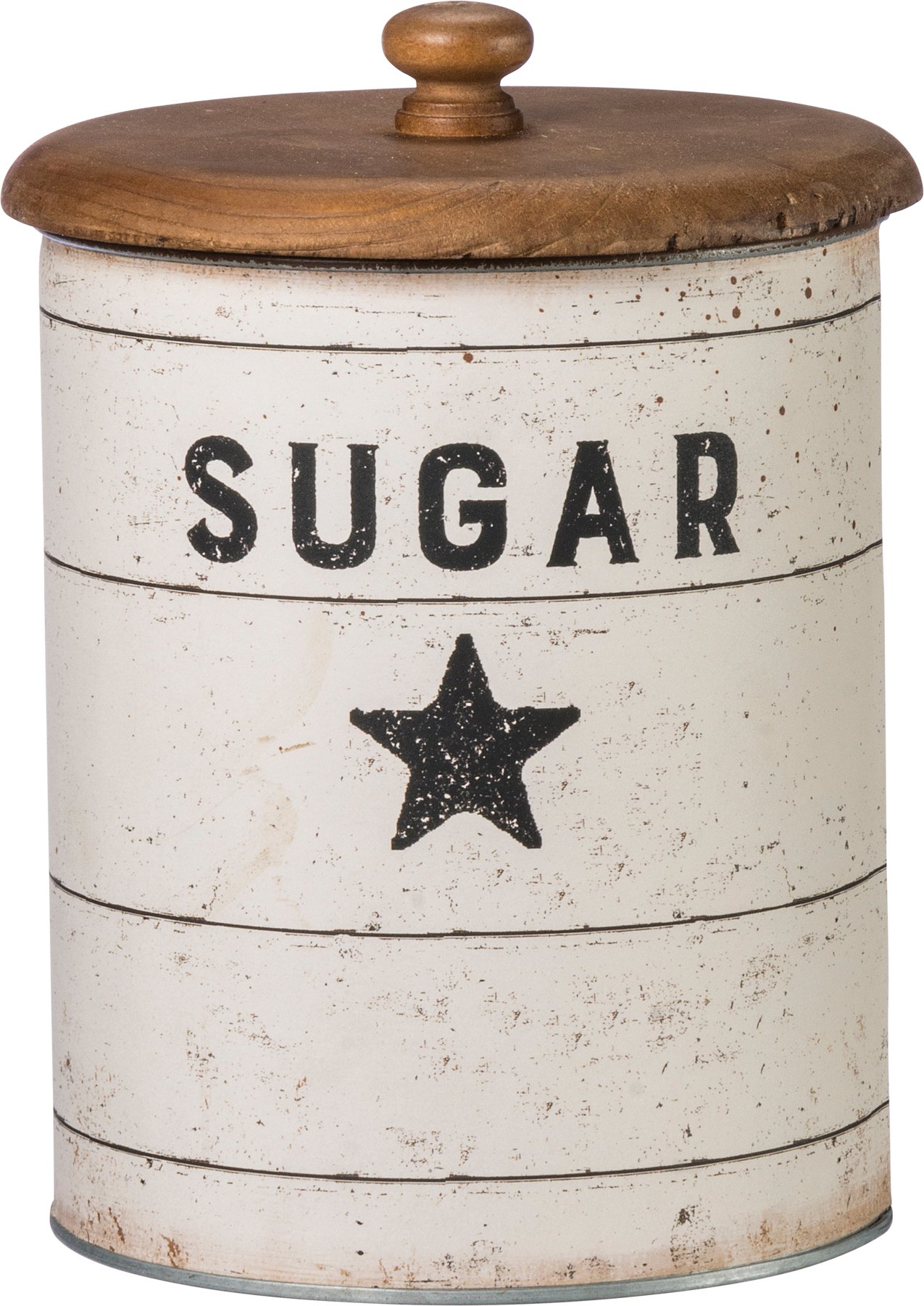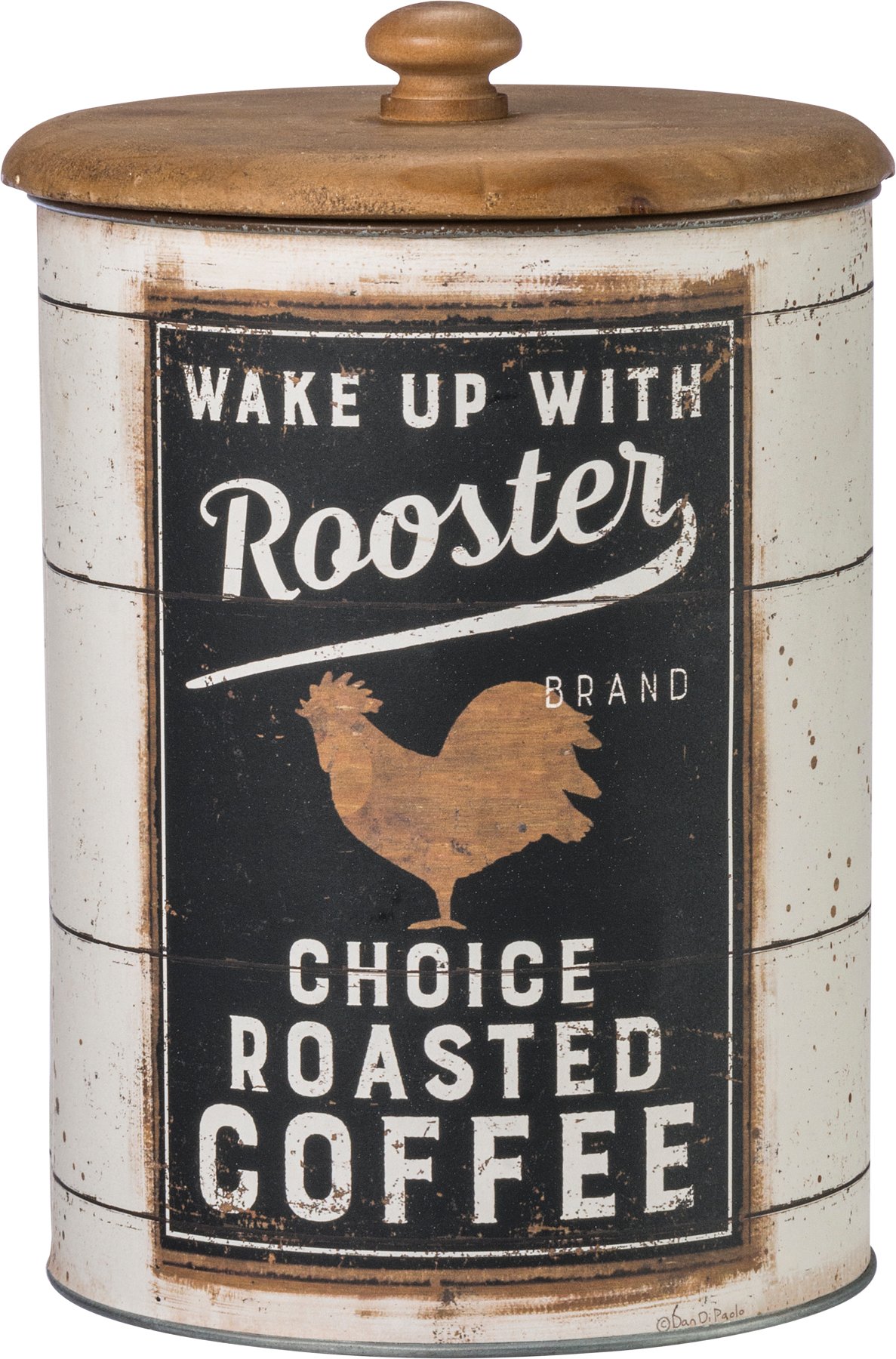 A set of three metal farmhouse canisters from our Farmhouse Collection with wooden lids for kitchen organization. Small canister lends double-sided "Sugar / Plantation Pure Cane Sugar" sentiments, medium canister lends double-sided "Coffee / Wake Up With Rooster - Choice Roasted Coffee" sentiments, and large canister lends double-sided "Flour / Farm Boy Biscuit Flour - Self-Rising Made From Choice Wheat" sentiments. The Farmhouse canister set complements well with coordinating design pieces for rustic kitchen decor. Not airtight for food storage; recommended to line canister with sealable bag to maintain freshness.
