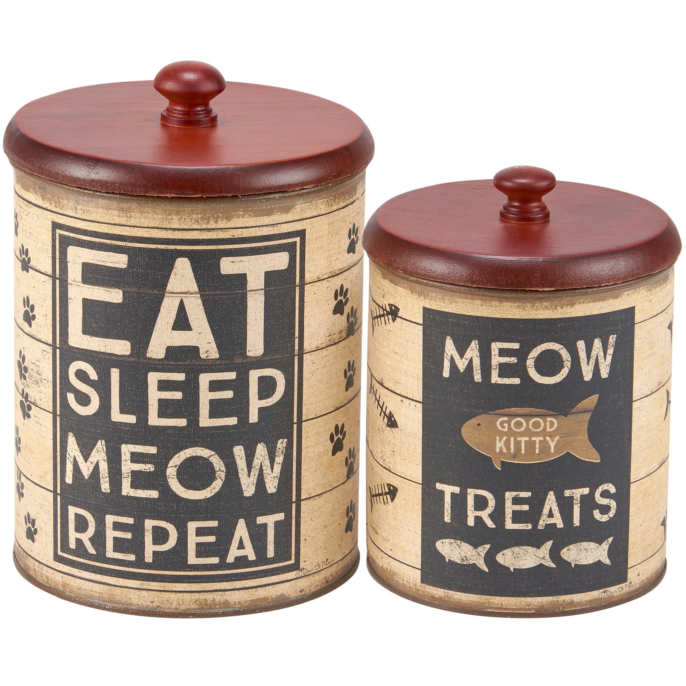 A galvanized metal canister set from our Pet Collection displaying double-sided rustic designs with a pet theme on each canister. Set includes two different sized canisters with wooden lids that can nest inside each other for easy storage. Larger bin displays a fun cat-themed sentiment that reads "Eat Sleep Meow Repeat" with paw print pattern. Smaller bin displays a "Meow - Good Kitty - Treats" sentiment with fish bone pattern. Our Kitty Treats canister set is ideal for storing packaged cat treats or accessories in style. A rustic cat-themed kitchen accessory perfect for everyday organization.