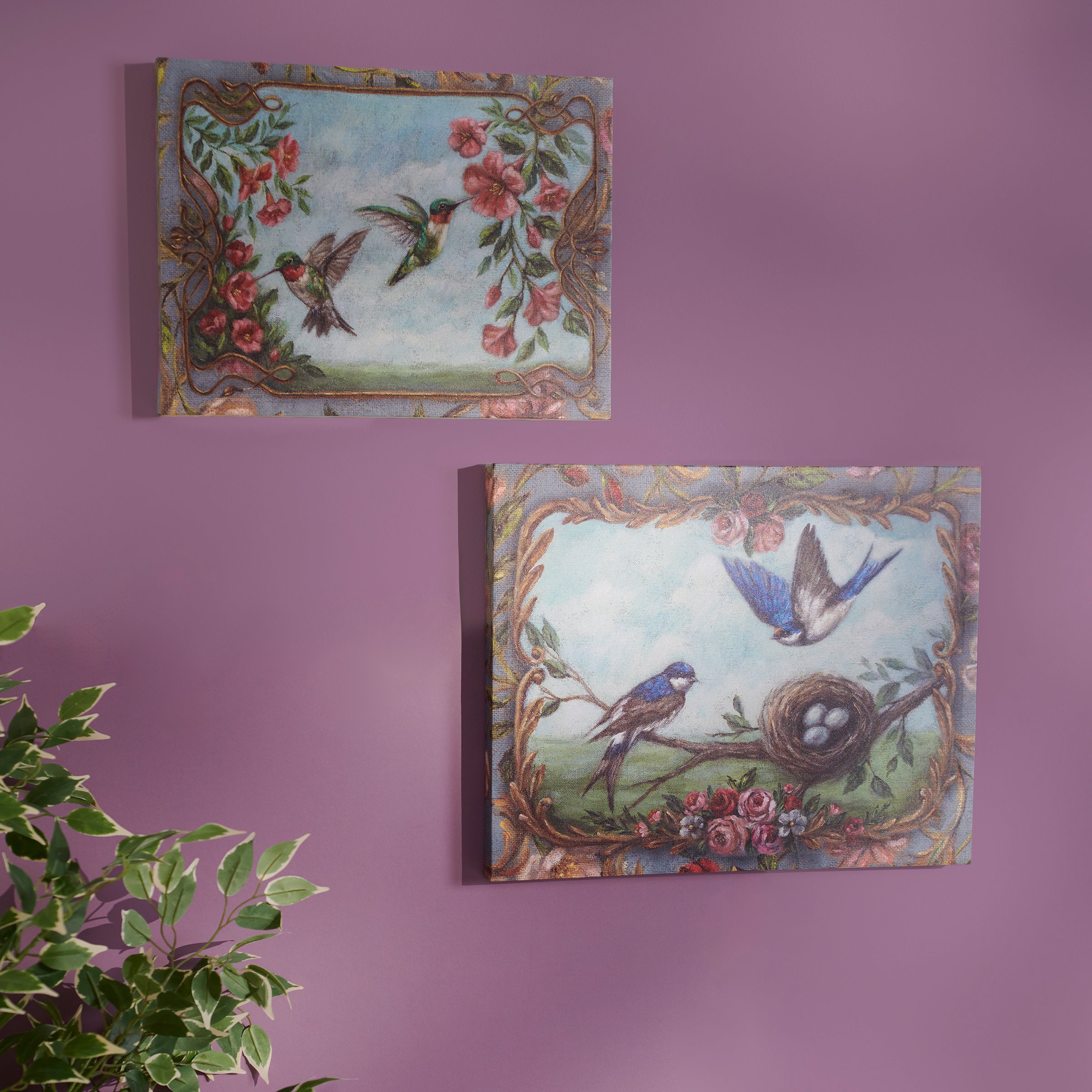 A canvas wall art piece from our Art Nouveau Collection displaying a charming scene of hummingbirds with a floral border inspired by art nouveau. Hummingbird design is replicated from original artwork painted onto burlap canvas, giving the art a unique depth and texture. Our Hummingbird canvas wall art is easy to hang via attached sawtooth hanger. A charming nature-themed home accent perfect for everyday display.