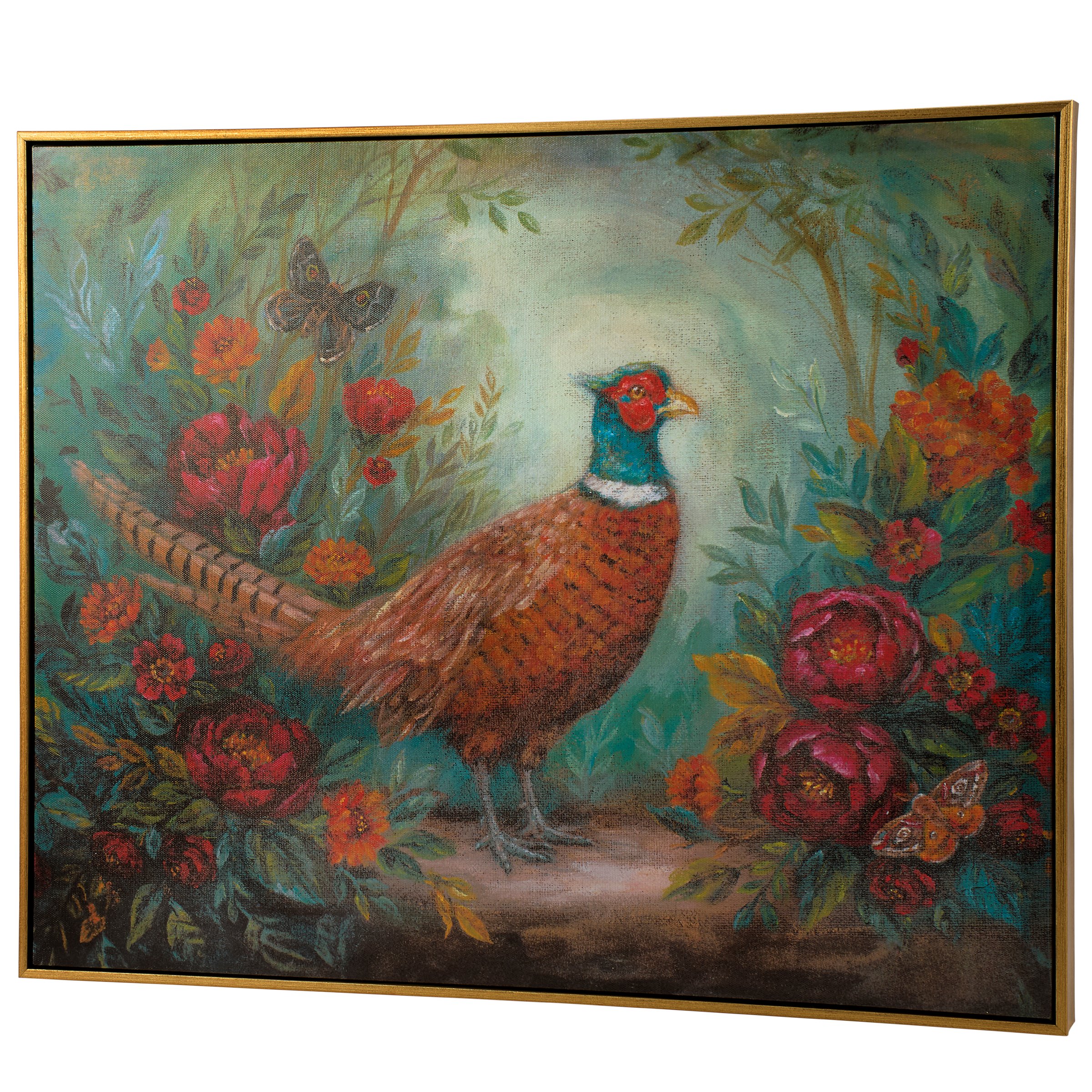 A canvas wall art piece from our Jewel Tone Fall Collection displaying a charming scene of a ring-neck pheasant surrounded by fall florals in a jewel tone color palette. Fall pheasant design is replicated from original artwork painted onto burlap canvas, giving the art a unique depth and texture. Wall art frame features a complementing metallic gold finish and a floating canvas technique to appear suspended within the frame for a dimensional effect. Our Ring-Neck Pheasant canvas wall art is ready to hang for display via attached hangers on the back. A jewel tone fall home accent perfect for seasonal display.